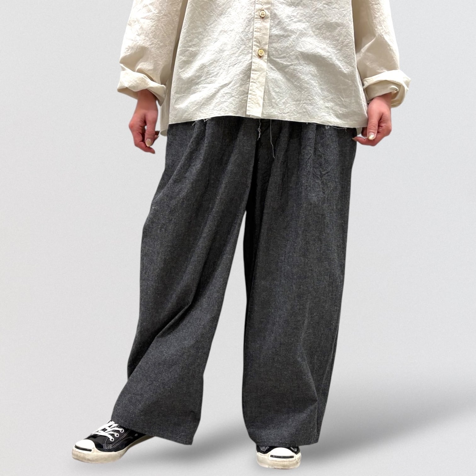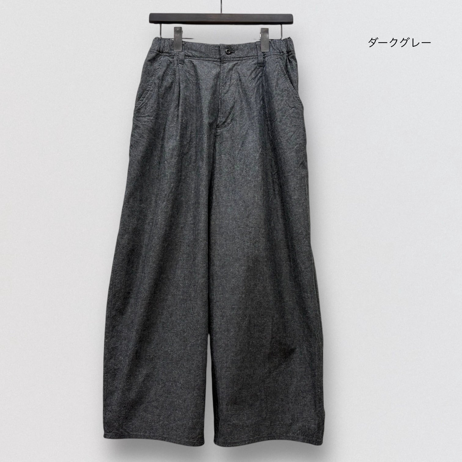 ワイドシルエットのテーパードパンツです。