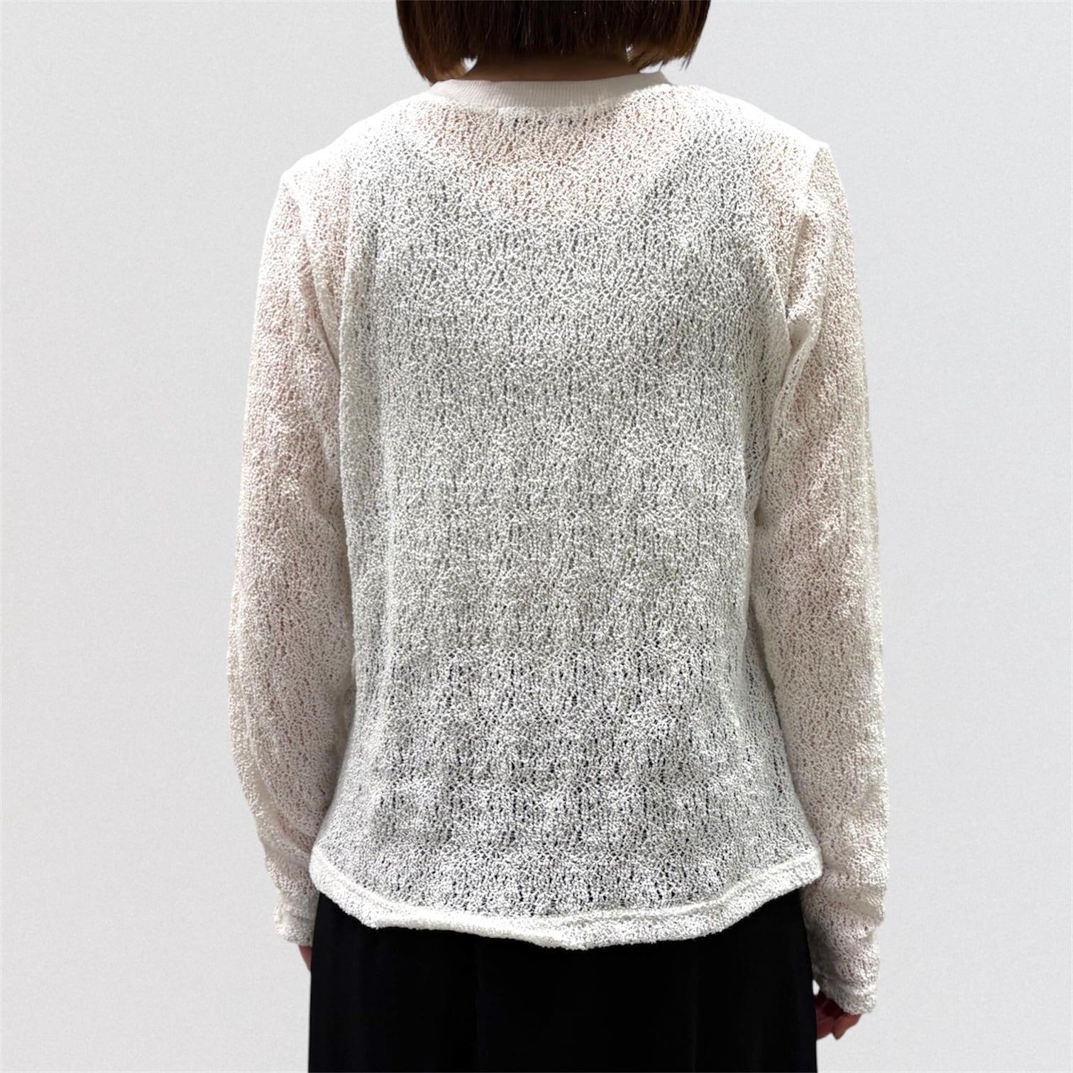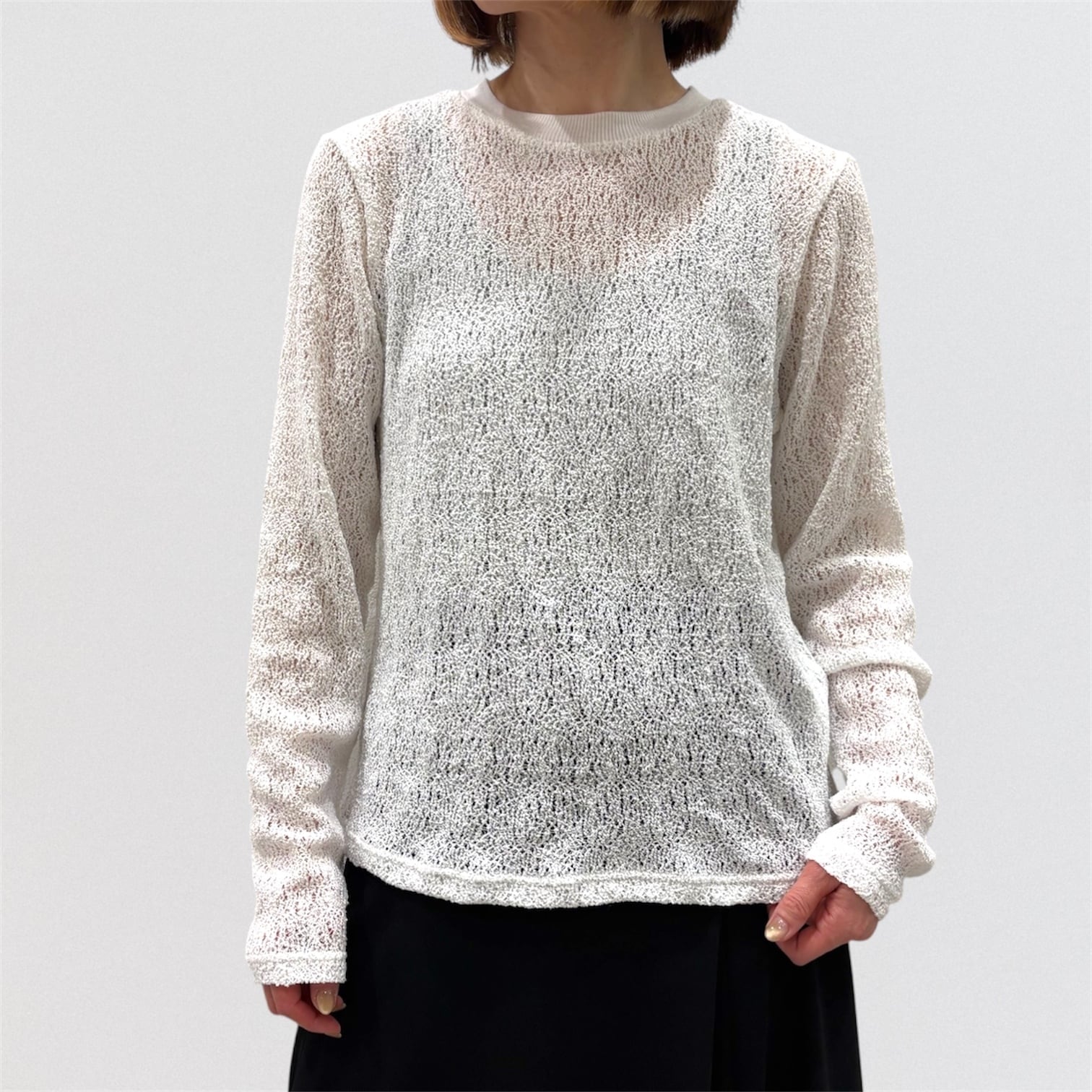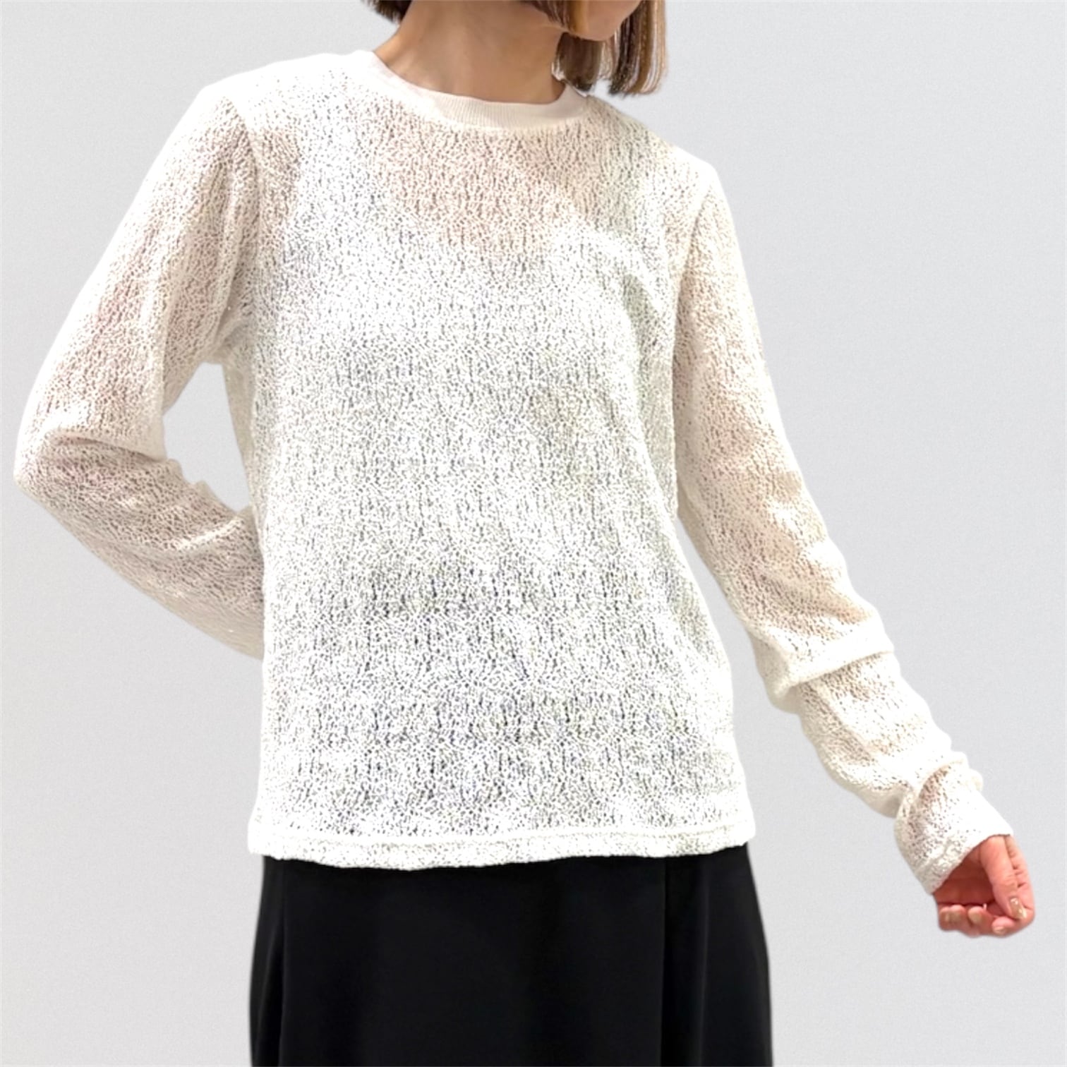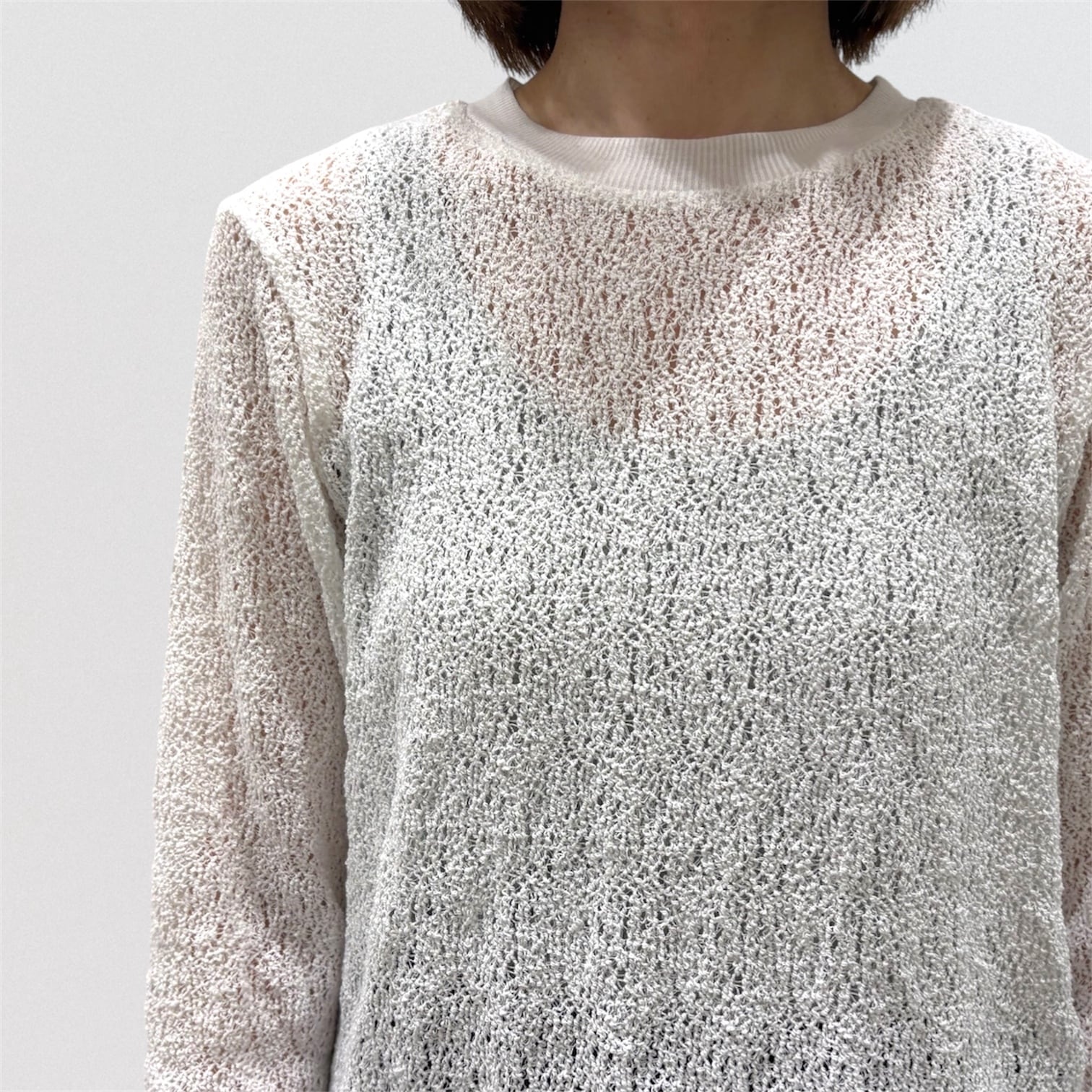 透け感がありインナーのお色目が見えやすい繊細な編み目と柔らかな膨らみが特徴的。