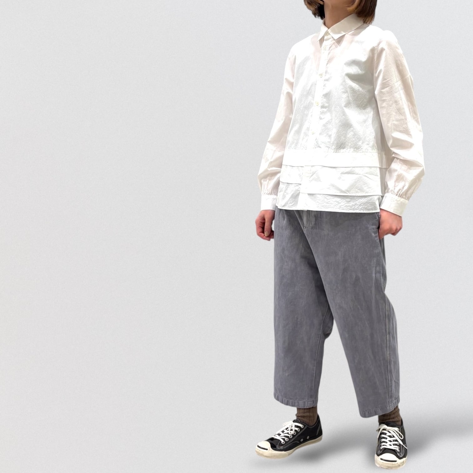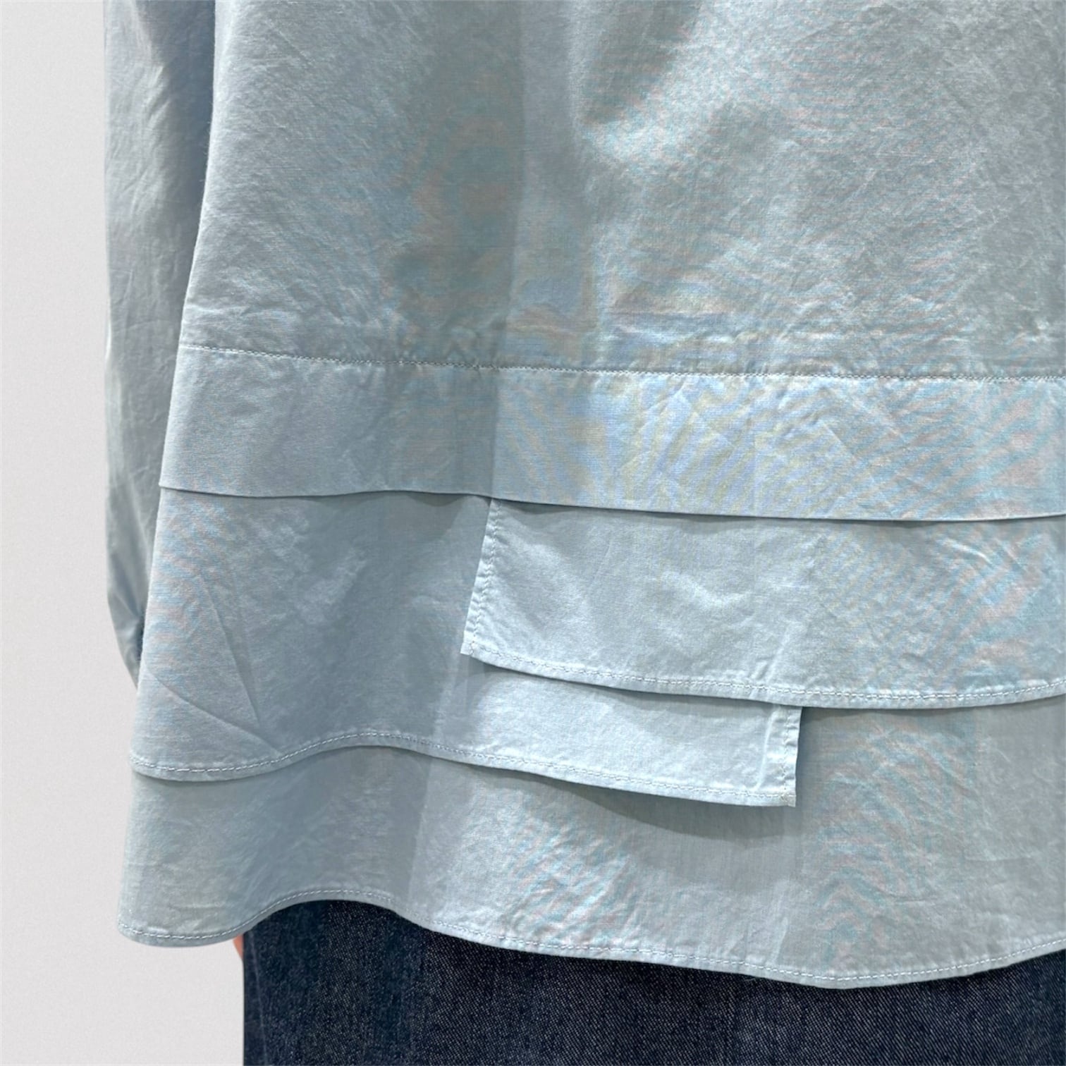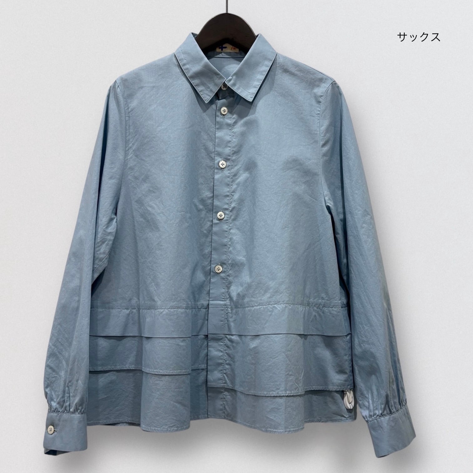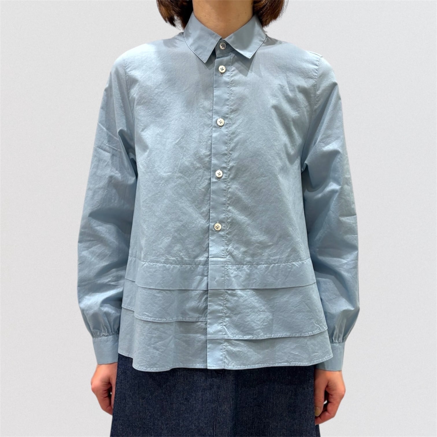 コンパクトな衿や袖のシャツ顔と、裾にかけて重ねたフリルの程よい甘さとのコントラストが絶妙なバランスを保ち、様々なボトムと相性の良いトップスです。