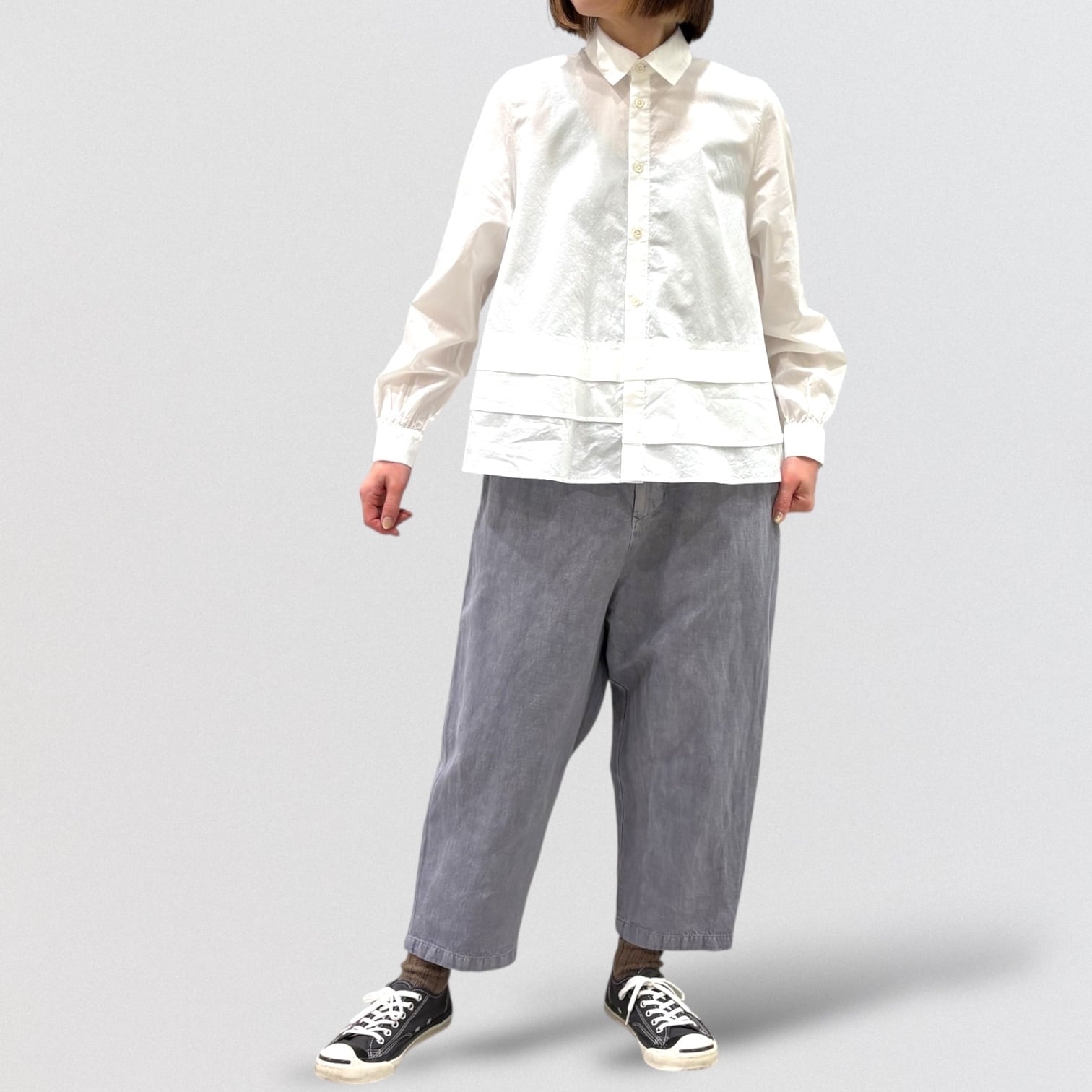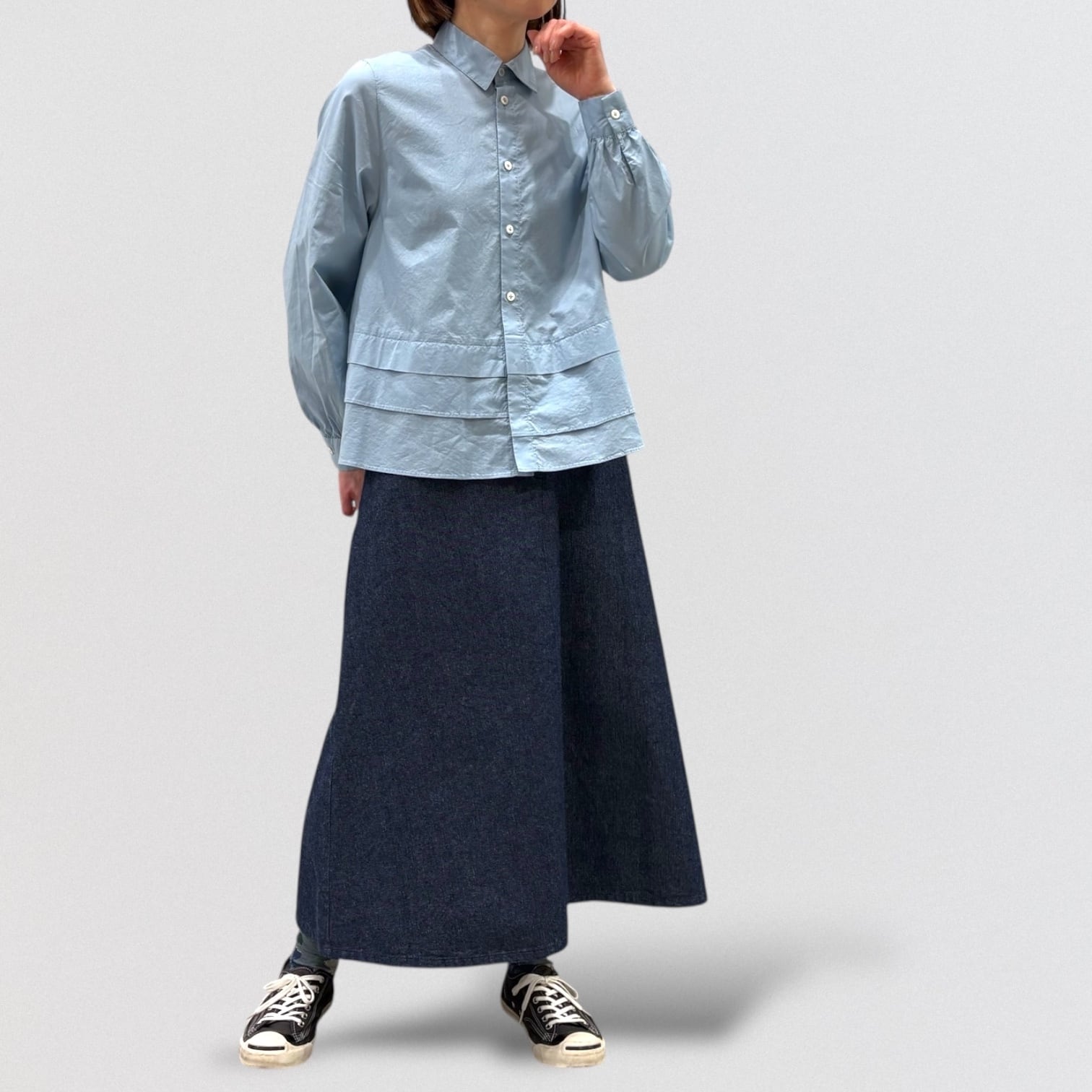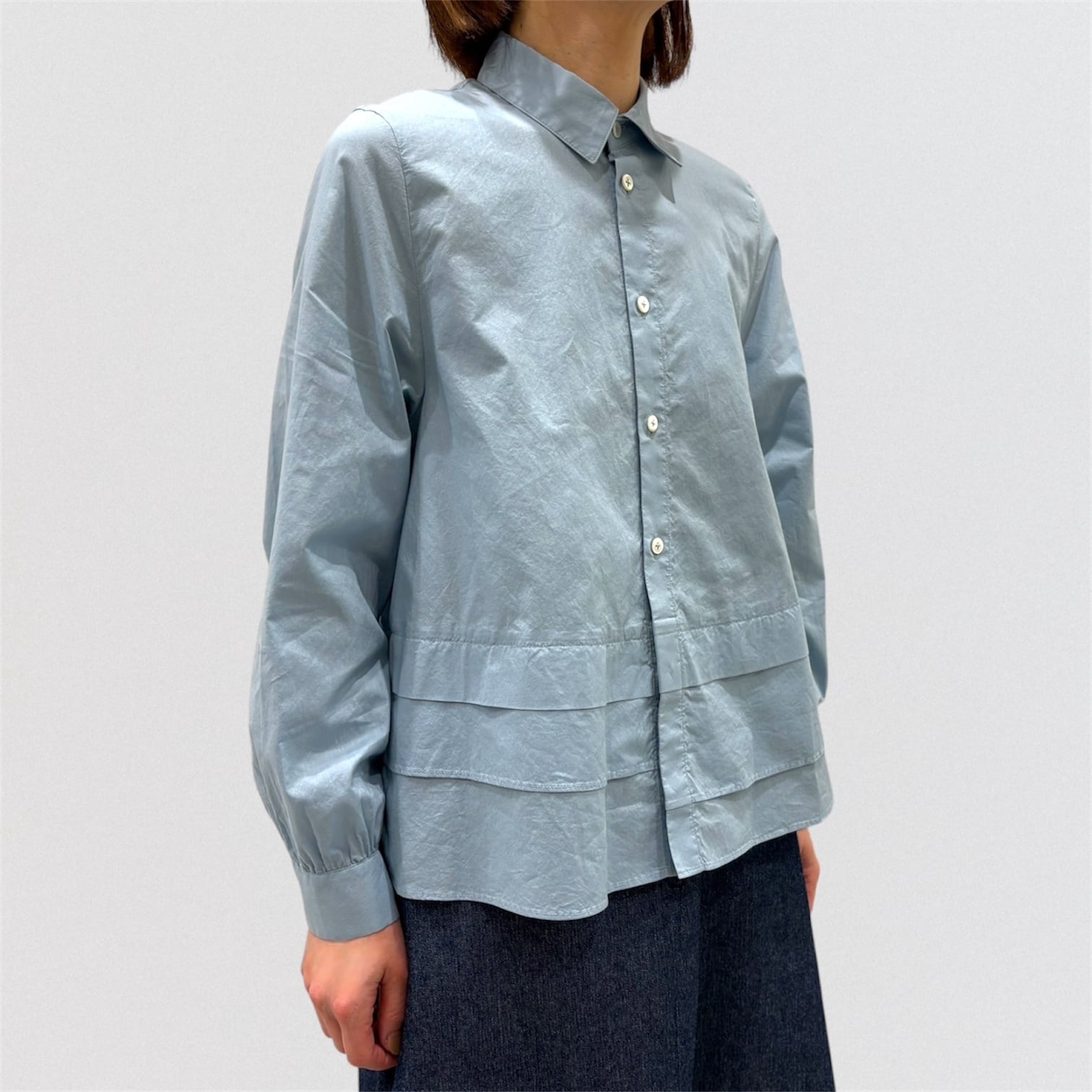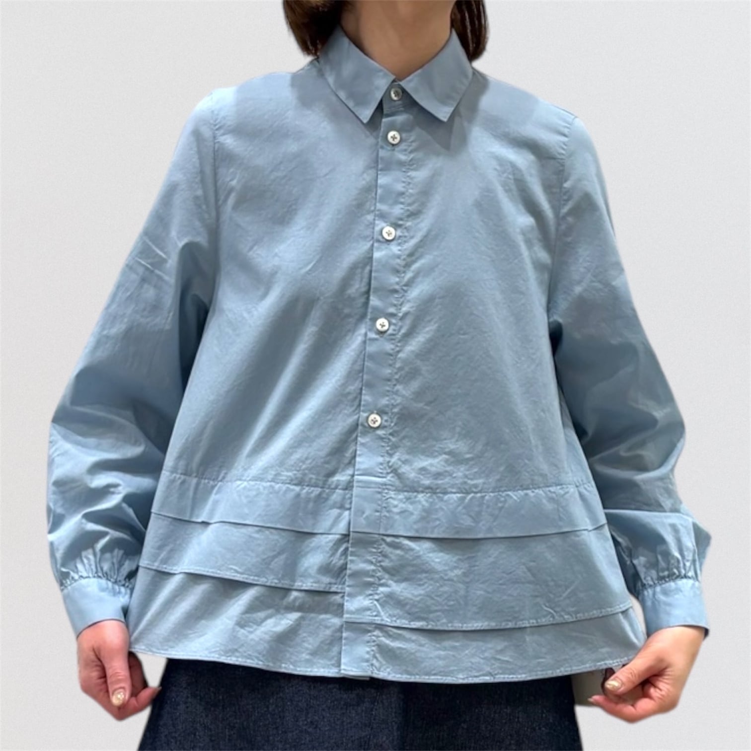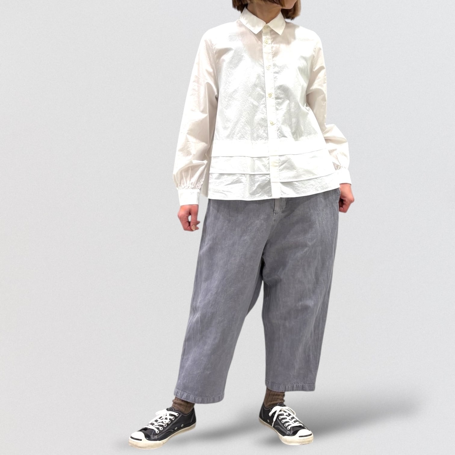 コンパクトな衿や袖のシャツ顔と、裾にかけて重ねたフリルの程よい甘さとのコントラストが絶妙なバランスを保ち、様々なボトムと相性の良いトップスです。