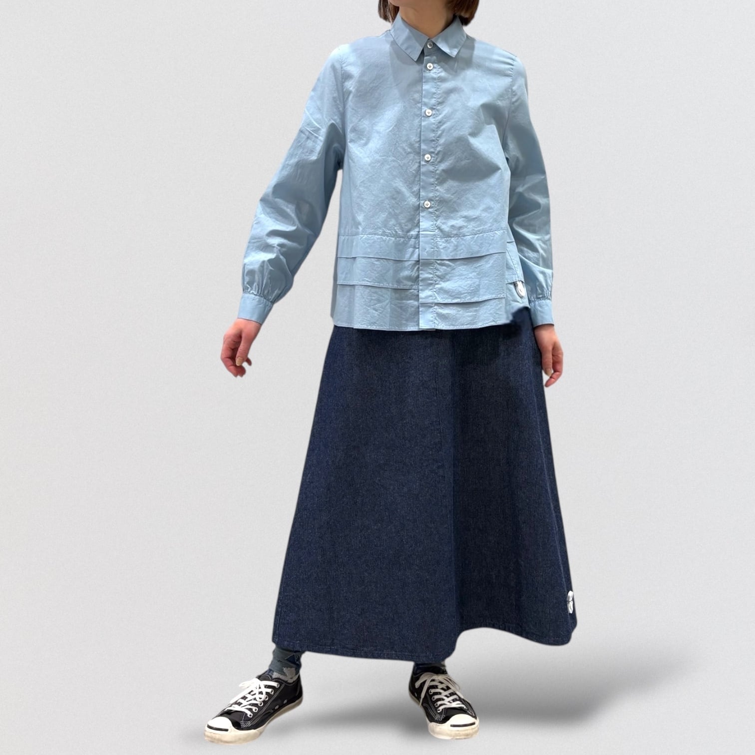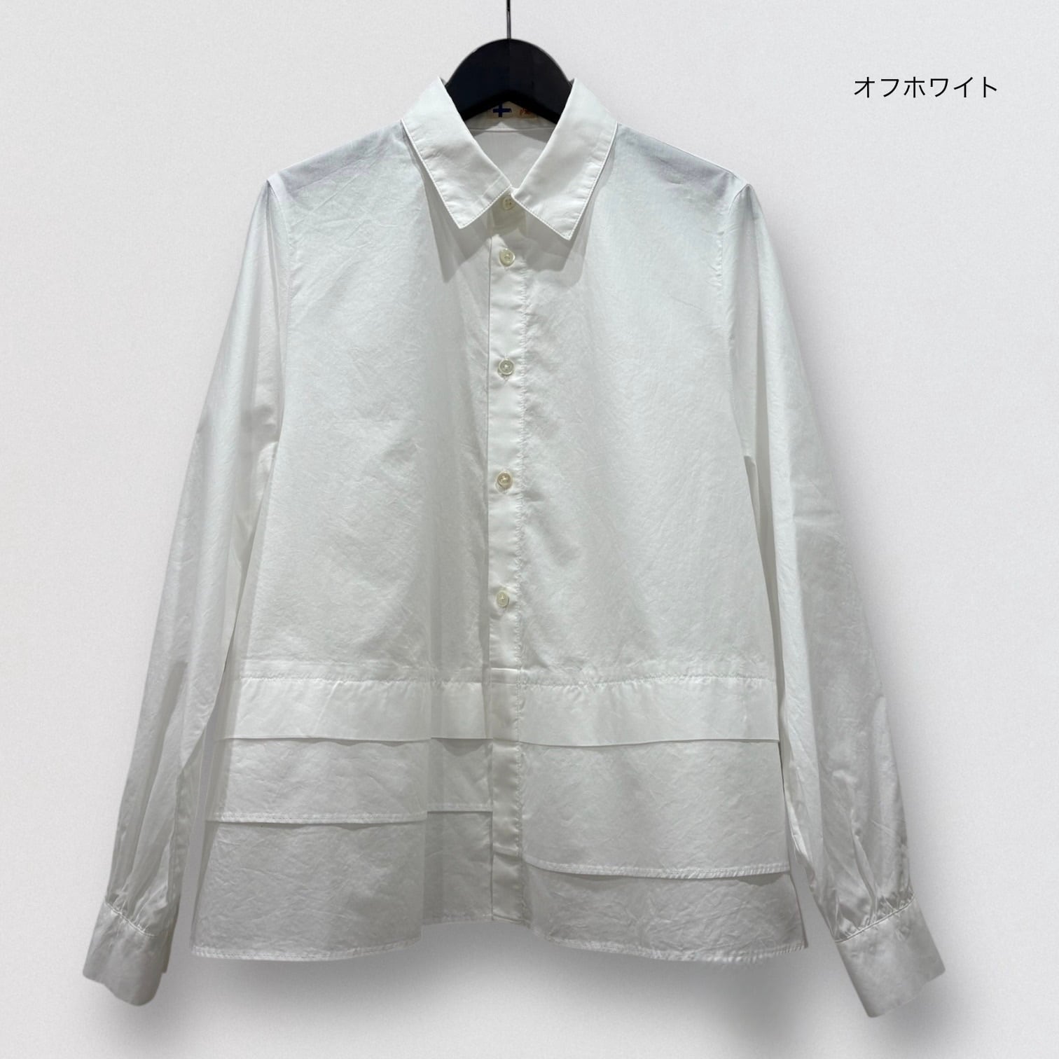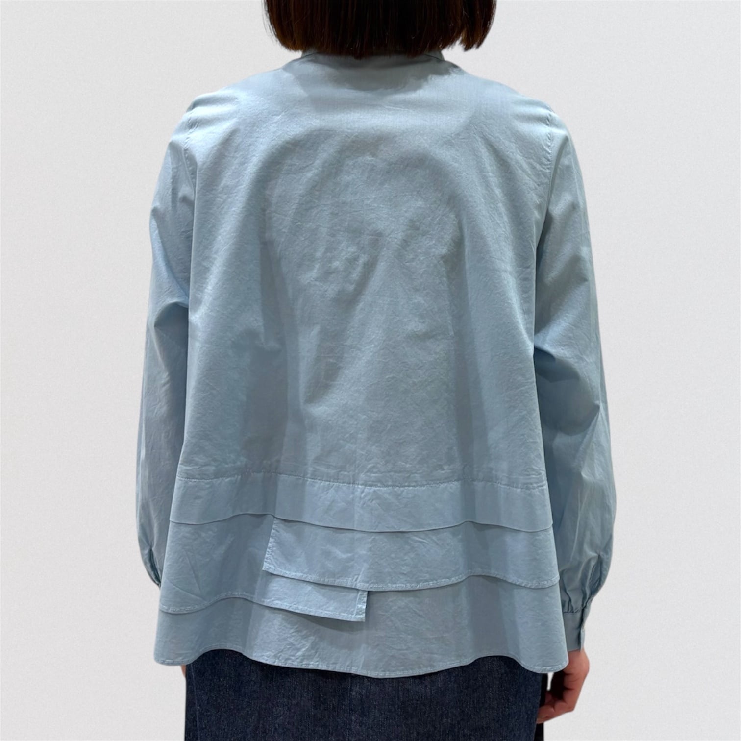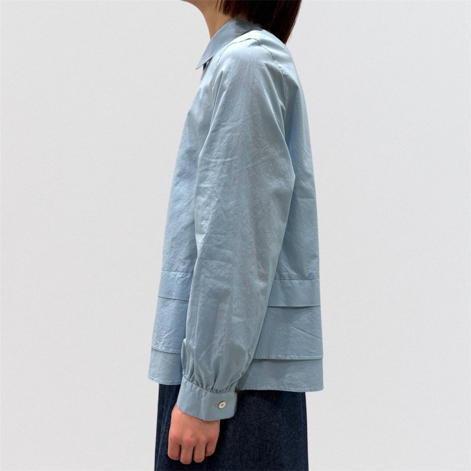 コンパクトな衿や袖のシャツ顔と、裾にかけて重ねたフリルの程よい甘さとのコントラストが絶妙なバランスを保ち、様々なボトムと相性の良いトップスです。