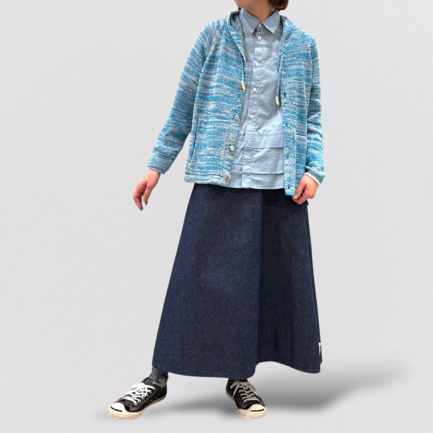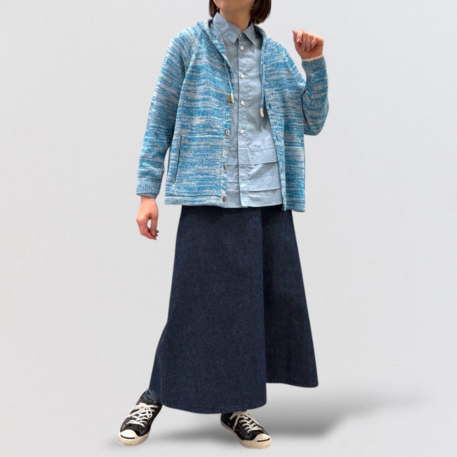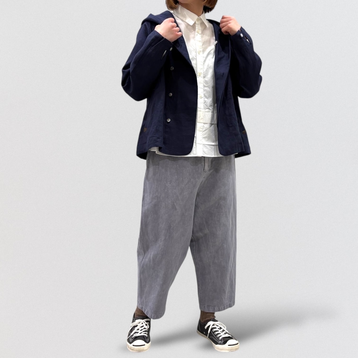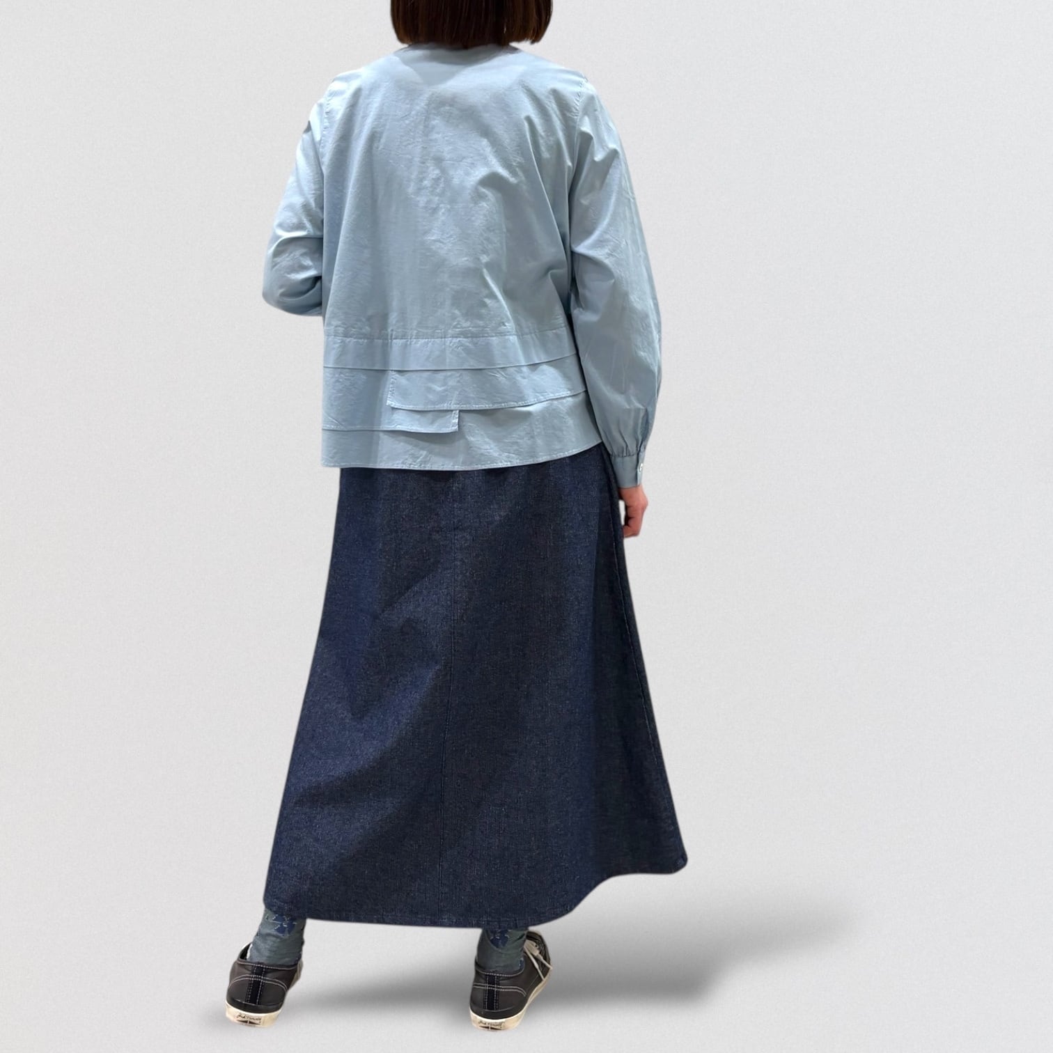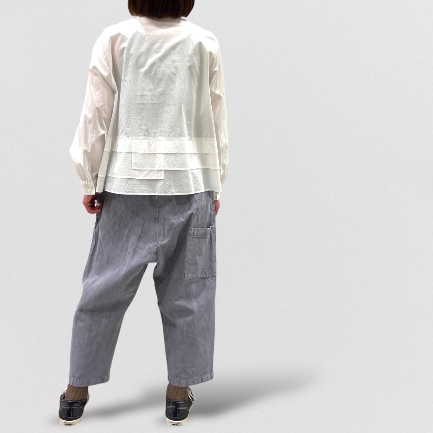 コンパクトな衿や袖のシャツ顔と、裾にかけて重ねたフリルの程よい甘さとのコントラストが絶妙なバランスを保ち、様々なボトムと相性の良いトップスです。