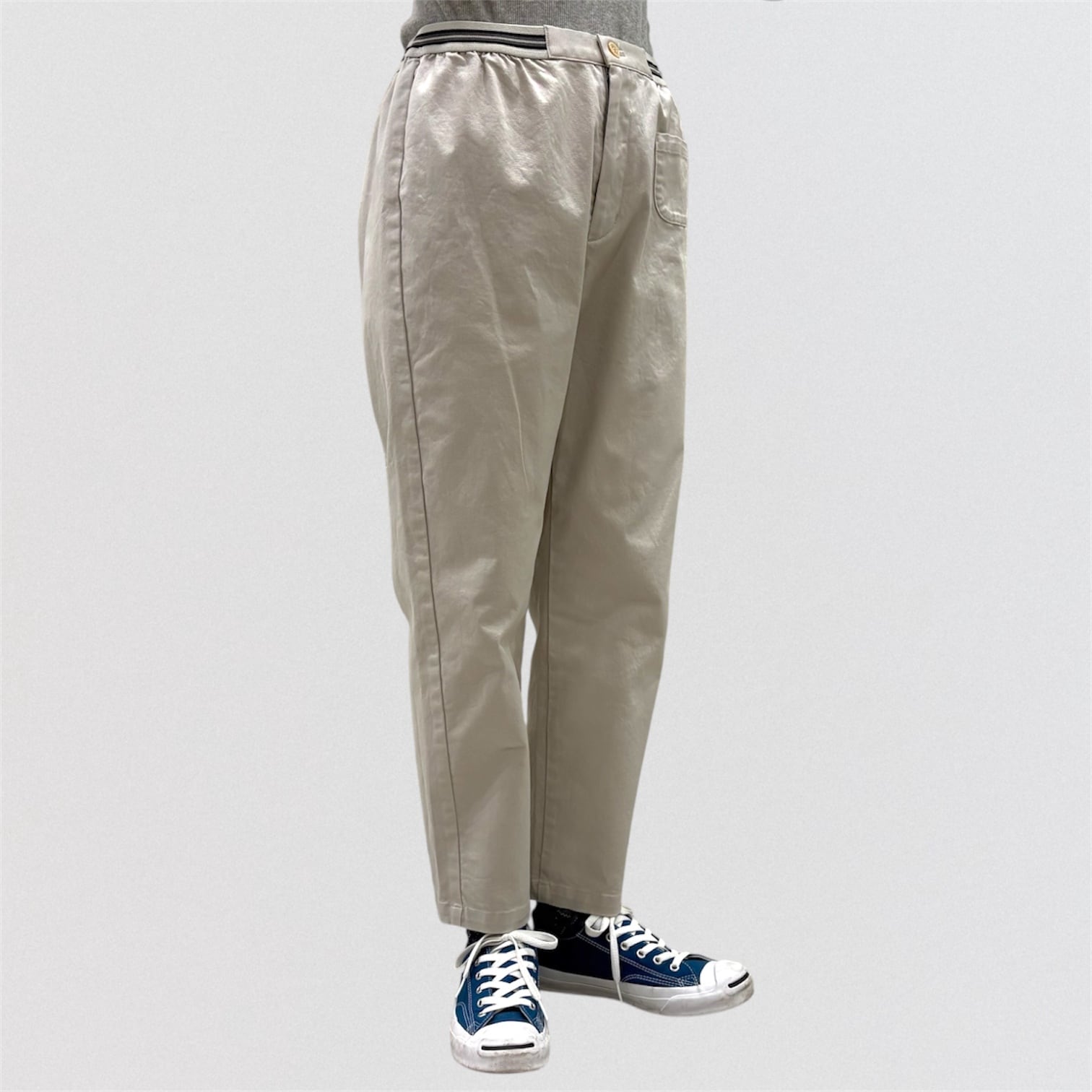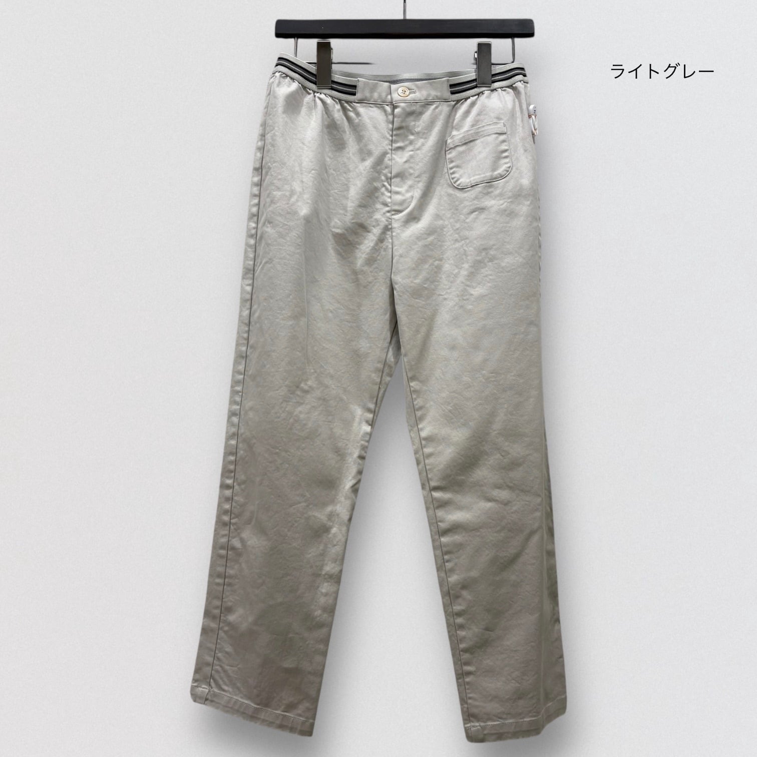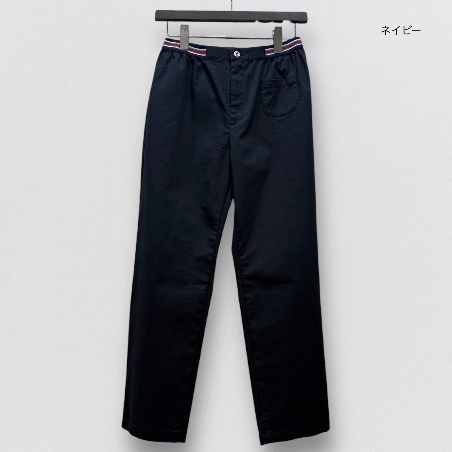 テーパードシルエットのウエストゴム仕様の定番パンツです。