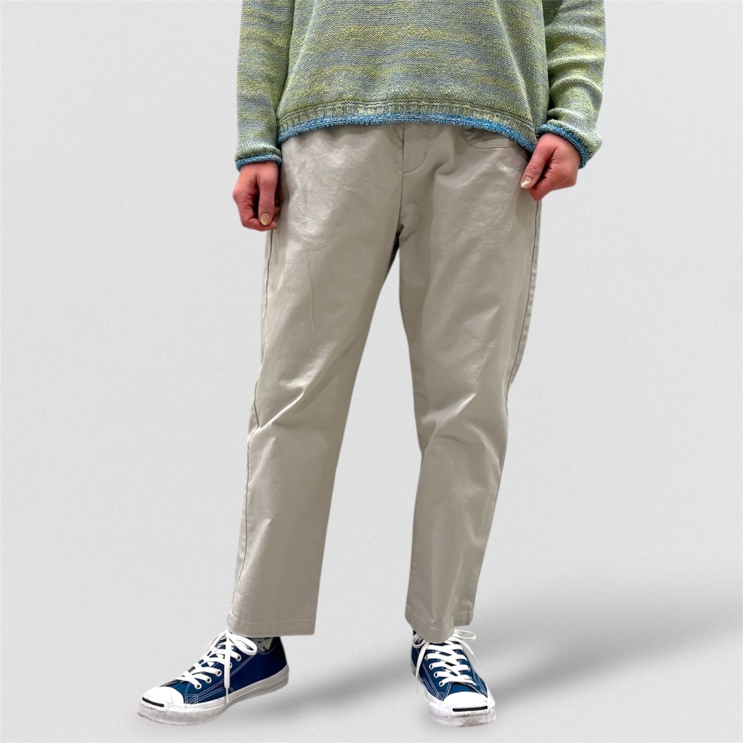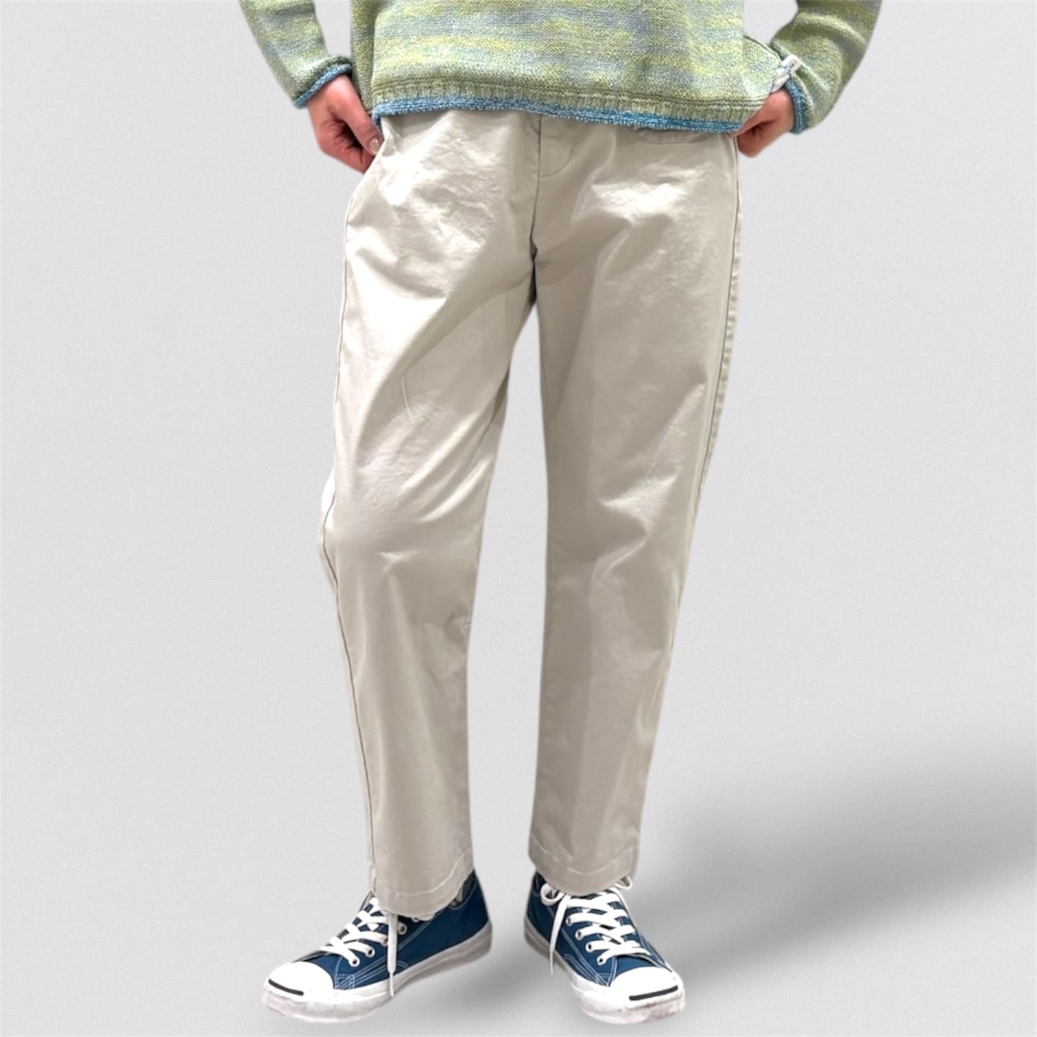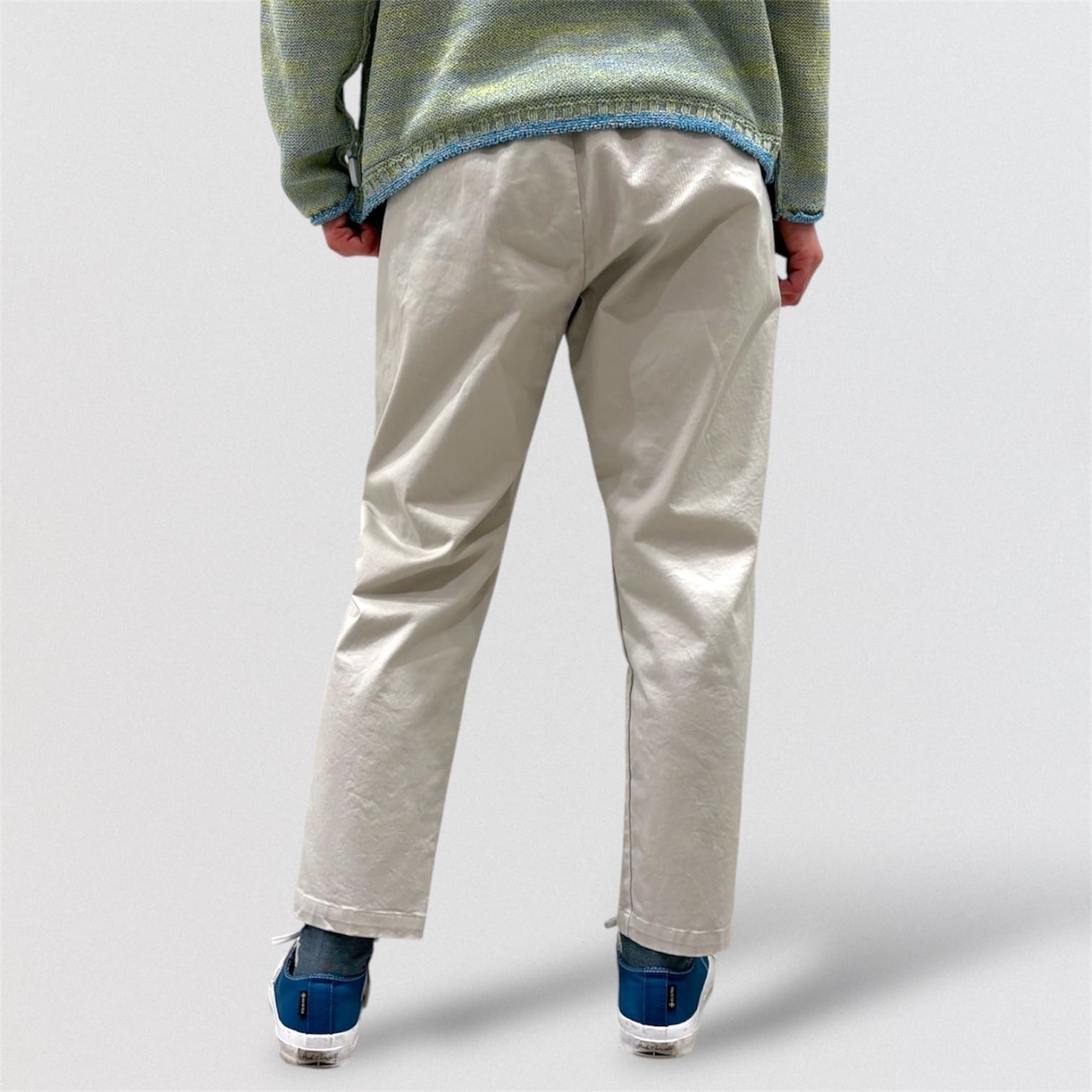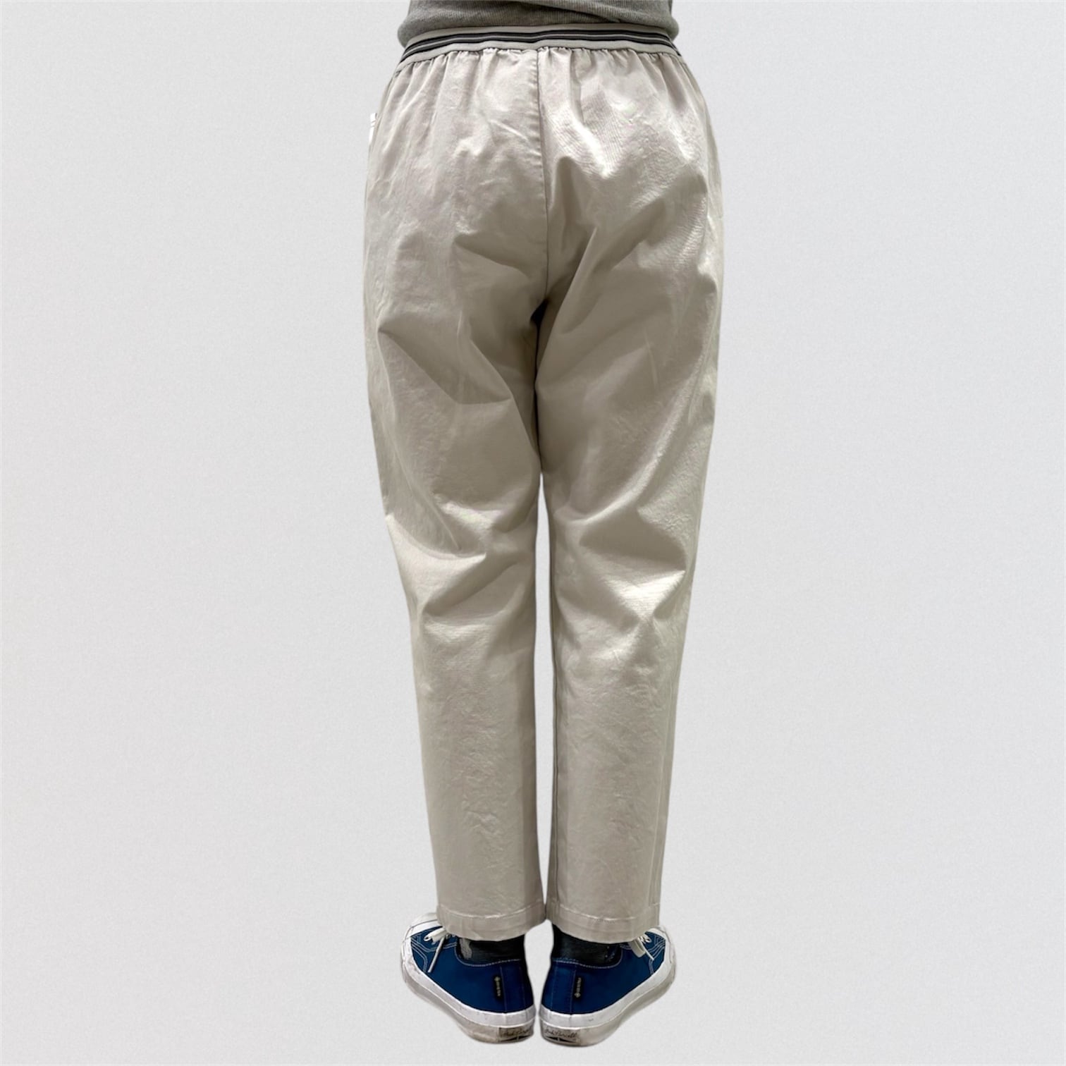 テーパードシルエットのウエストゴム仕様の定番パンツです。