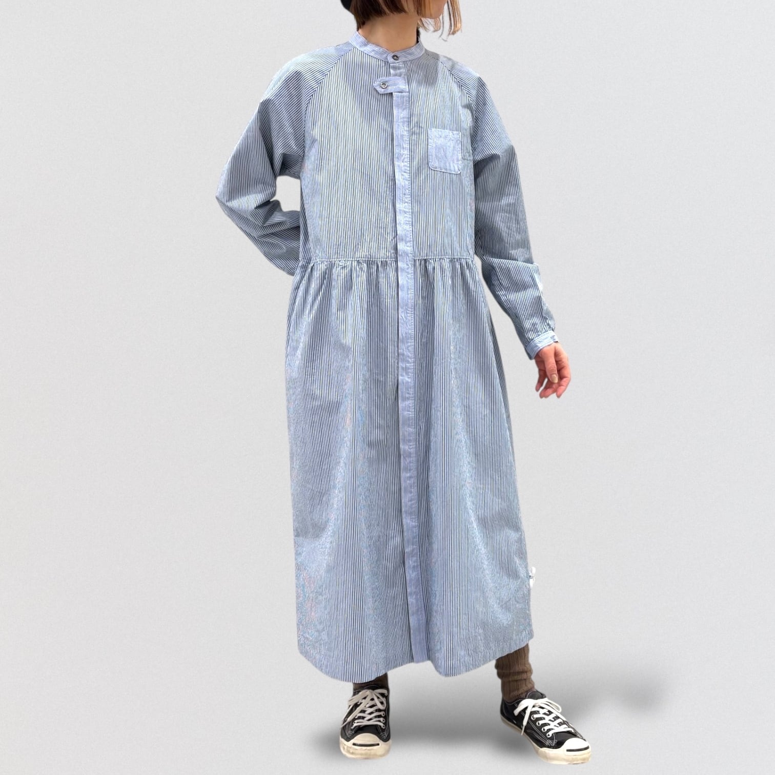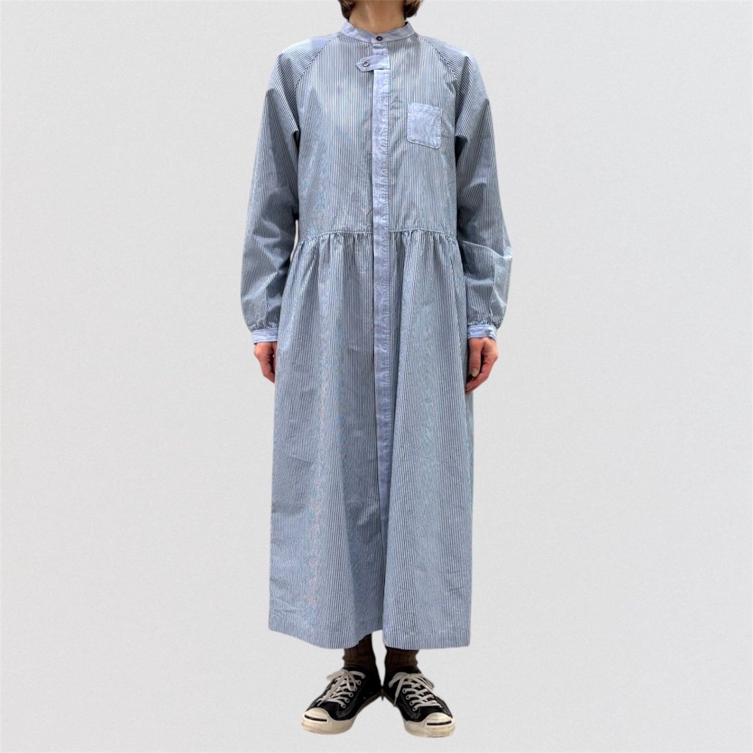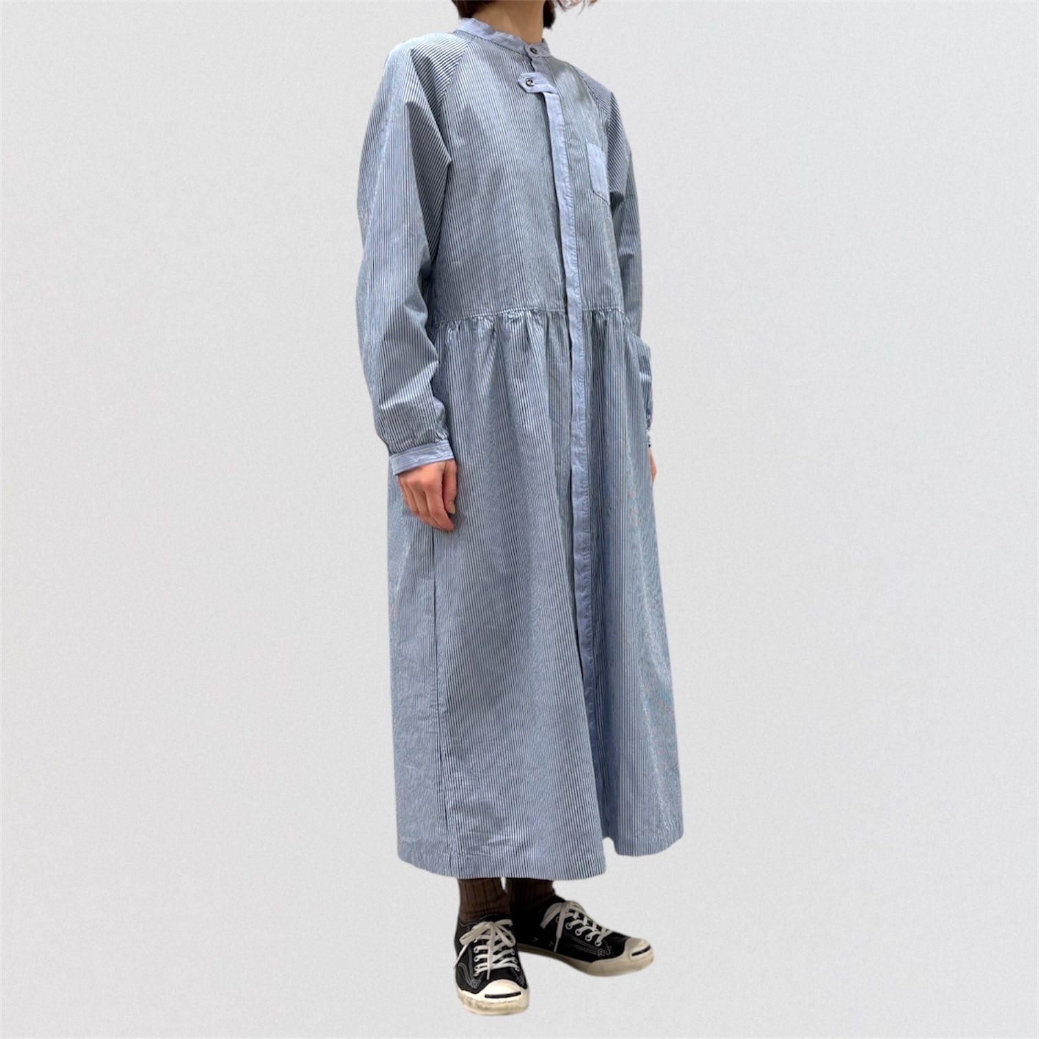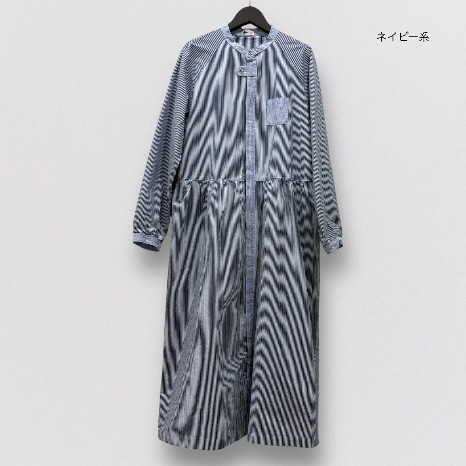 コンパクト糸を使用したタイプライター素材にドラム式の特殊な洗いをかける事で、キメの細かいシワと凹 凸感のあるストライプを2種類使い、衿&前立て&カフスに配色を利かせたシャツワンピース。