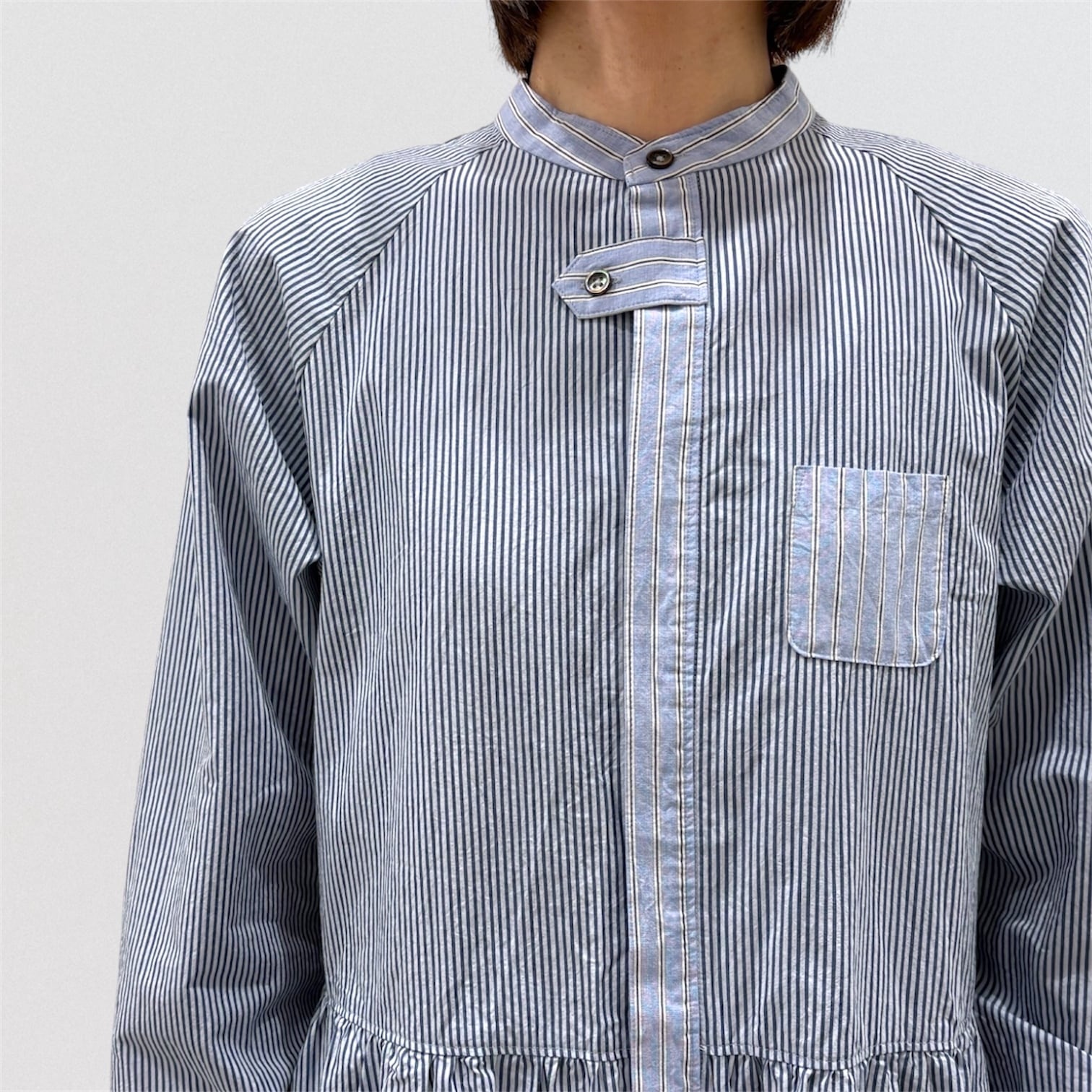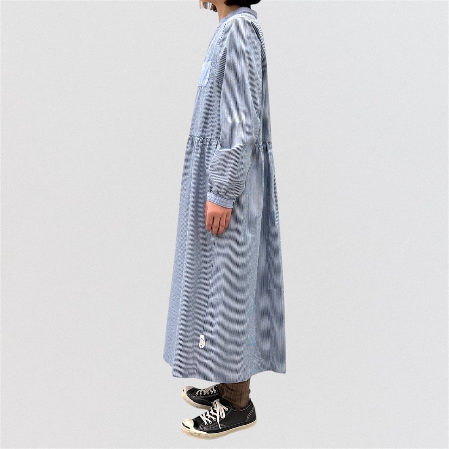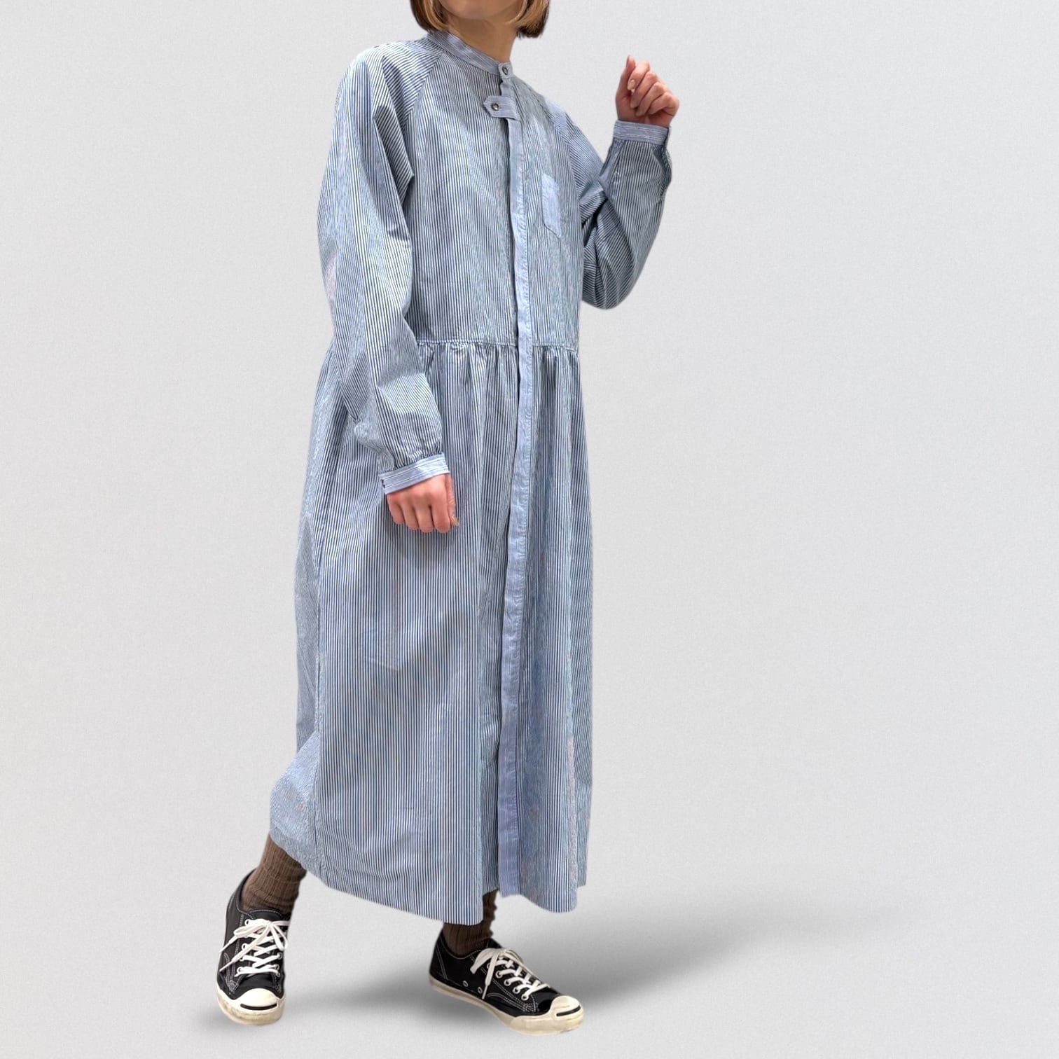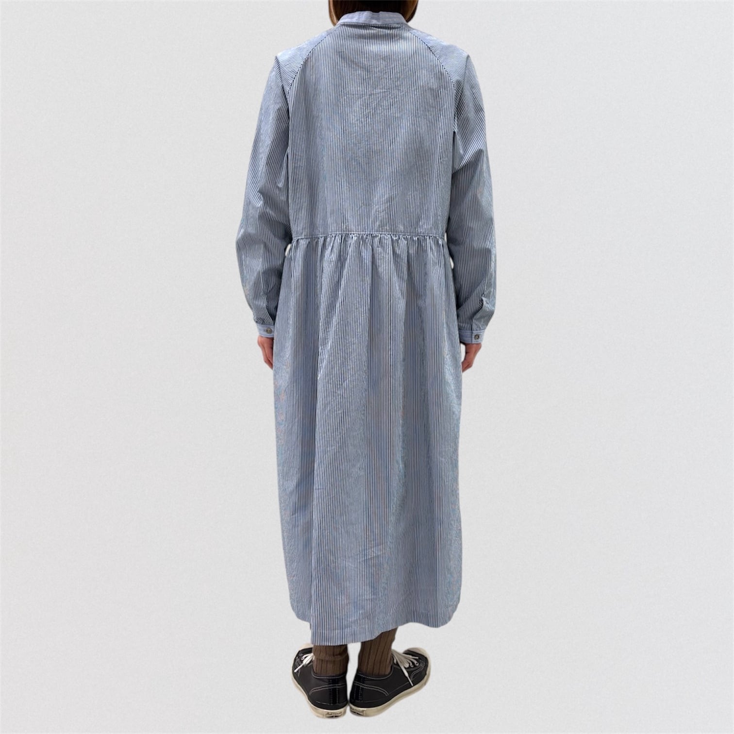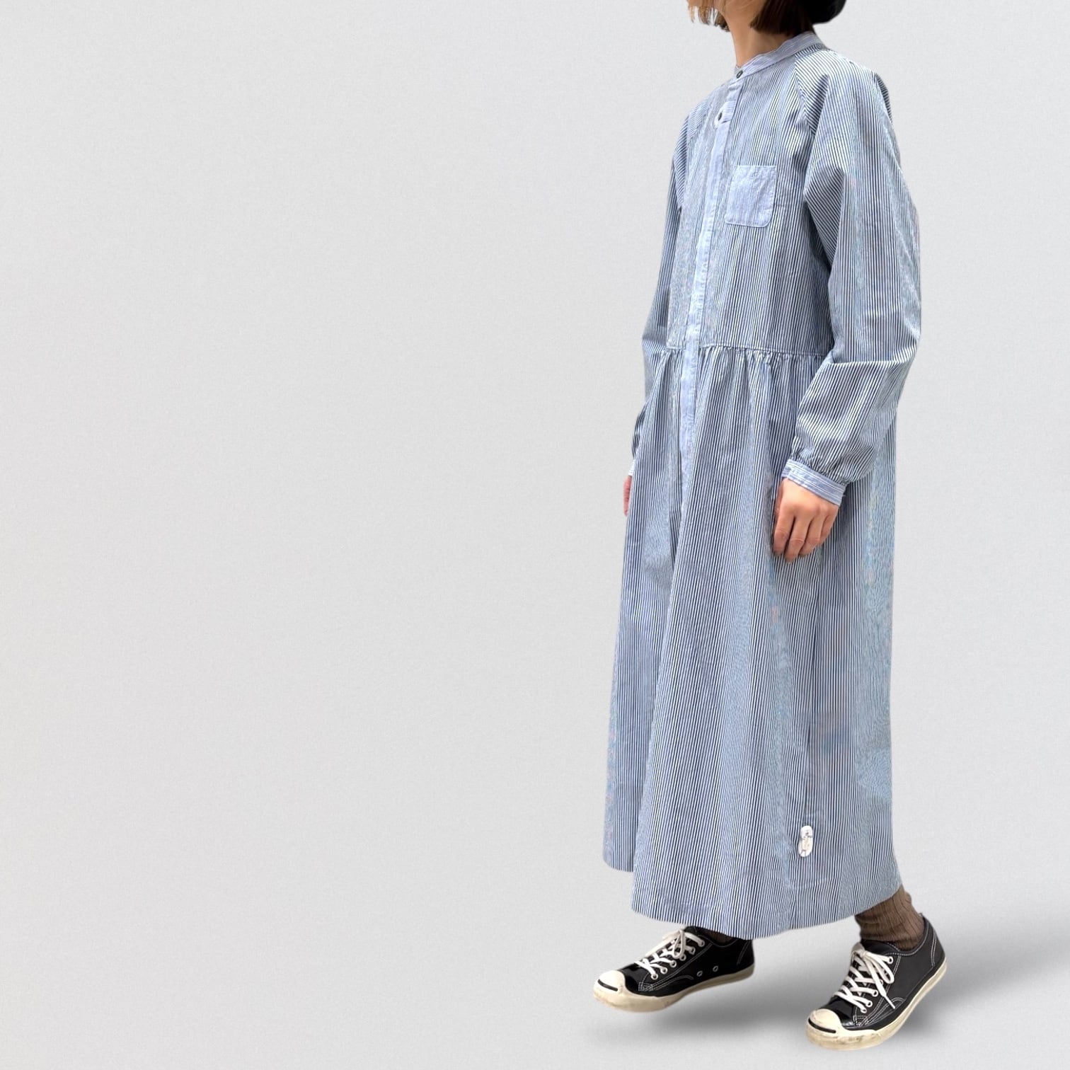 コンパクト糸を使用したタイプライター素材にドラム式の特殊な洗いをかける事で、キメの細かいシワと凹 凸感のあるストライプを2種類使い、衿&前立て&カフスに配色を利かせたシャツワンピース。