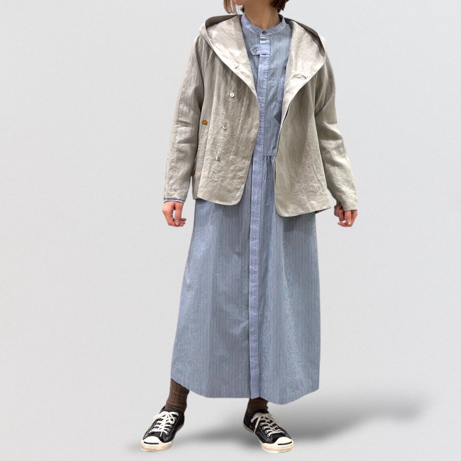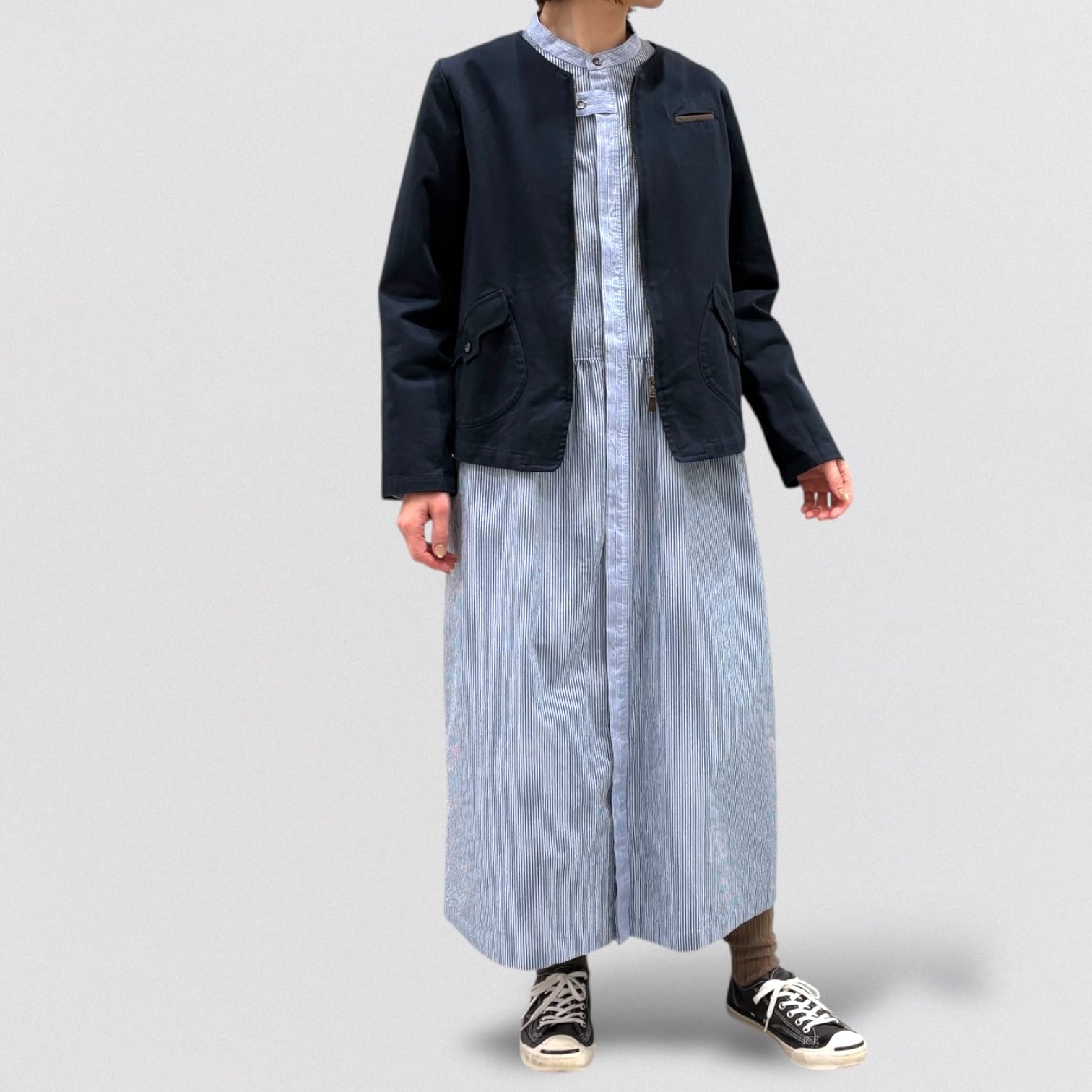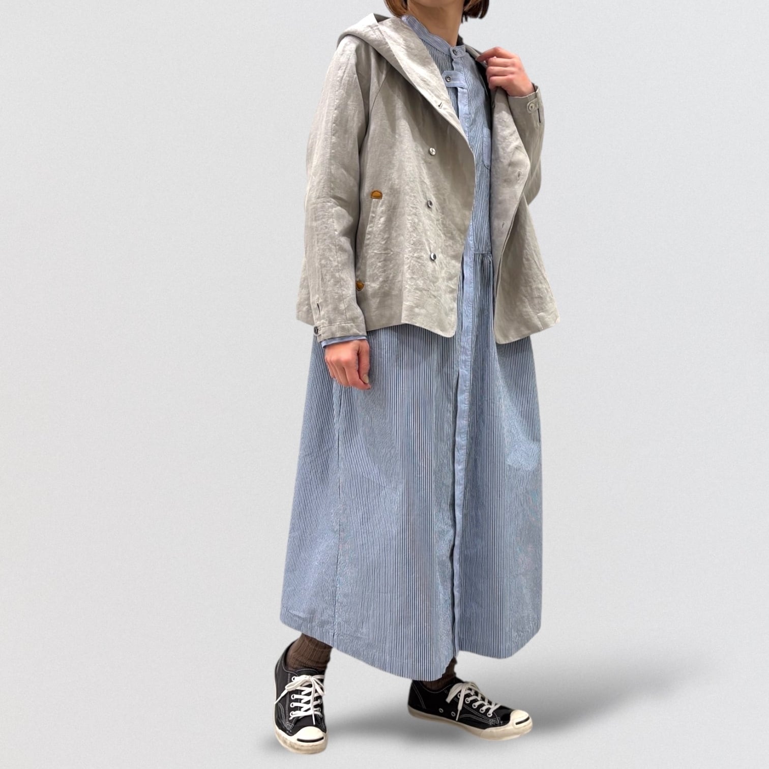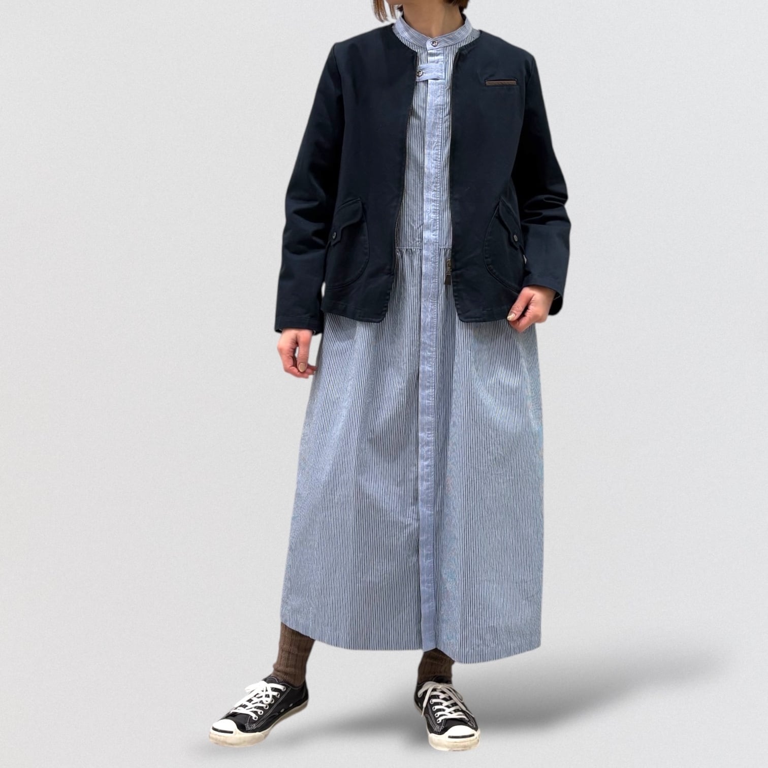 コンパクト糸を使用したタイプライター素材にドラム式の特殊な洗いをかける事で、キメの細かいシワと凹 凸感のあるストライプを2種類使い、衿&前立て&カフスに配色を利かせたシャツワンピース。