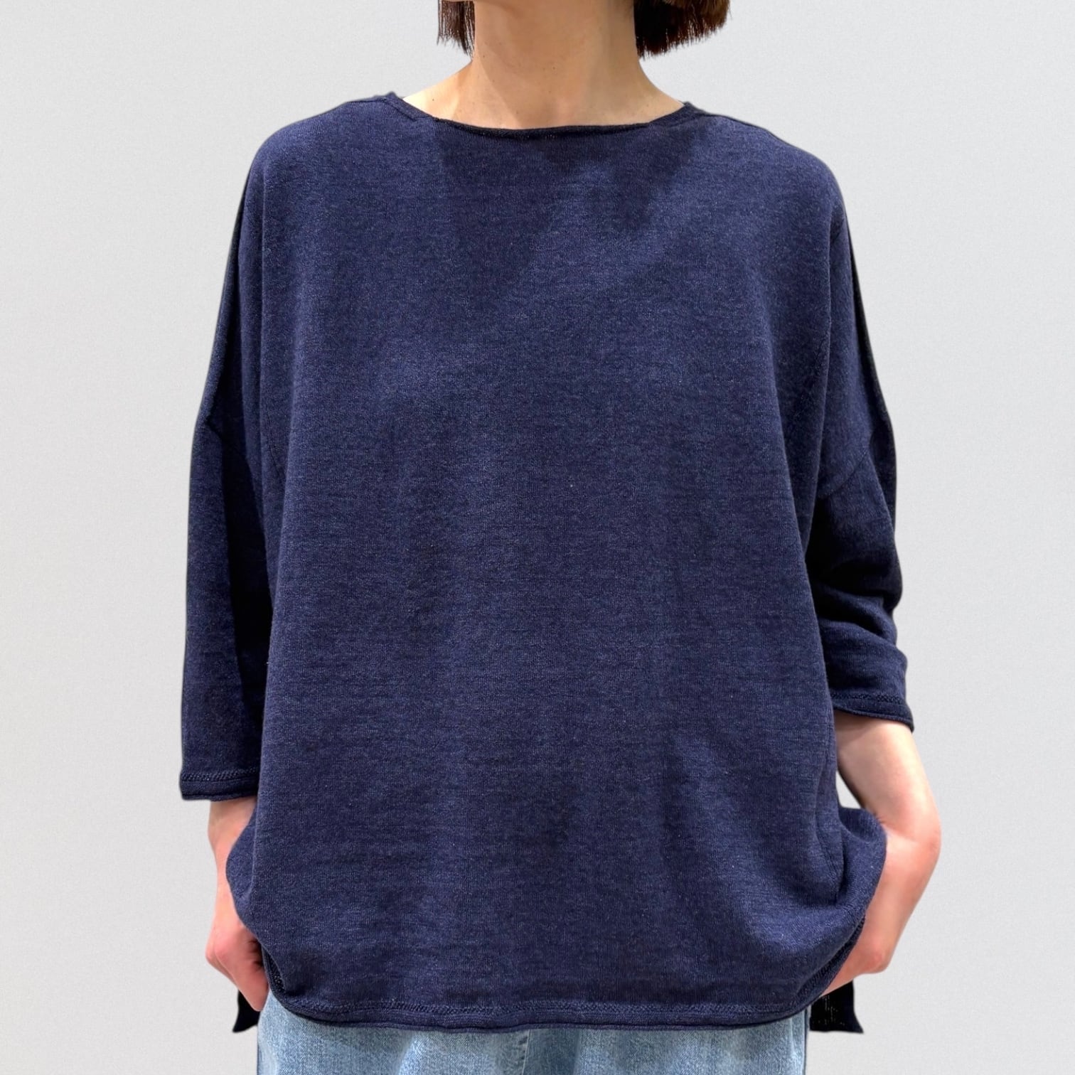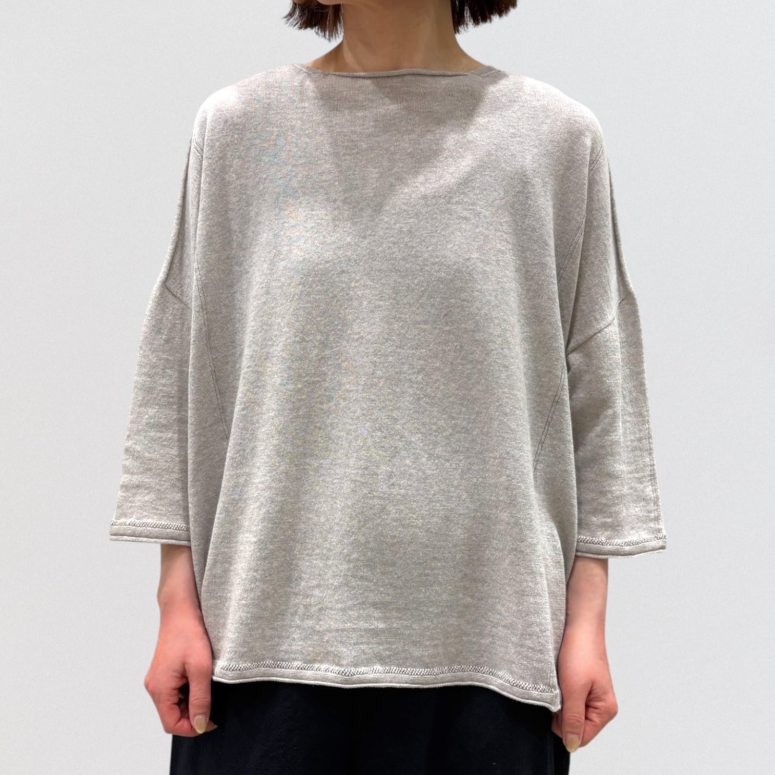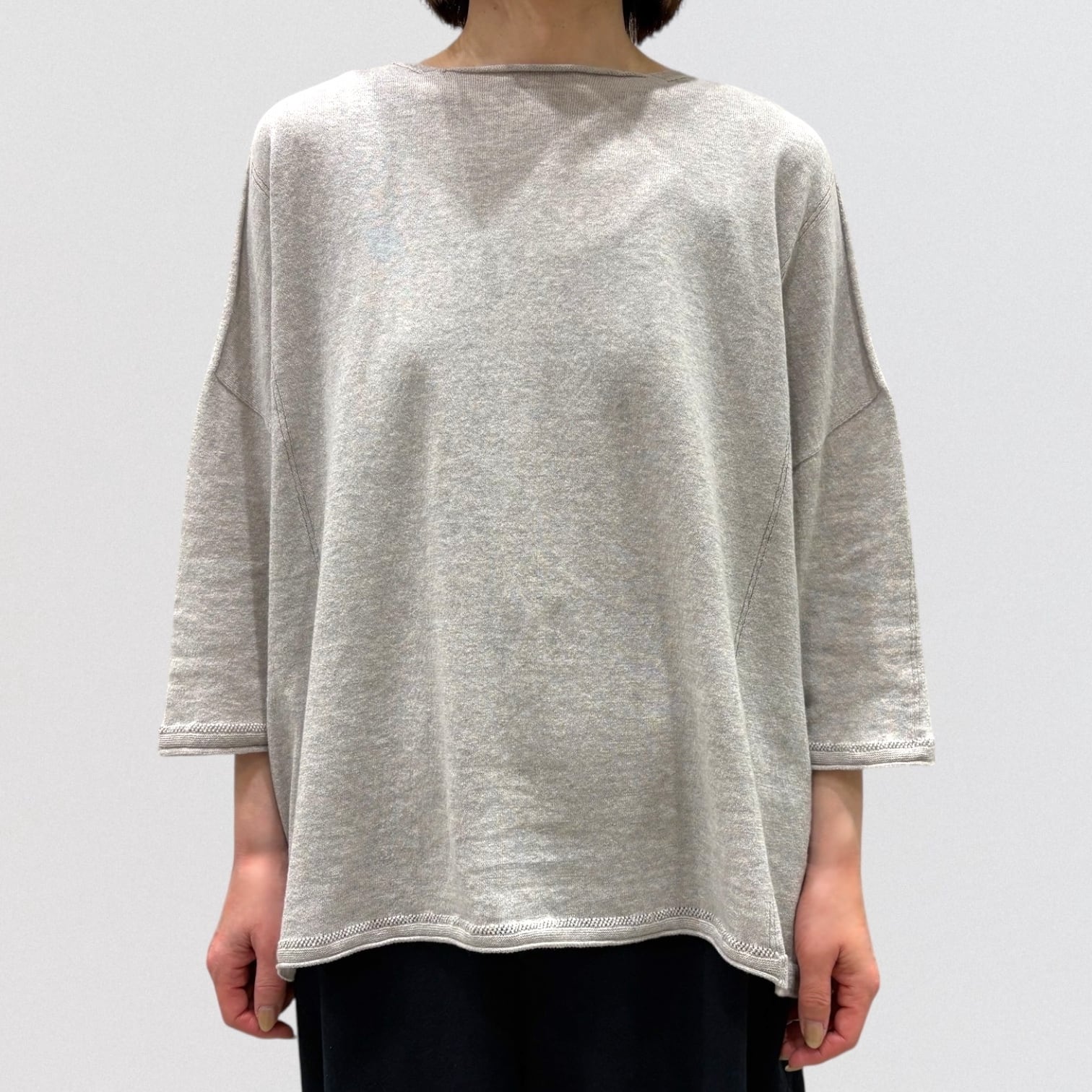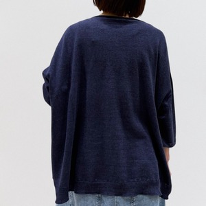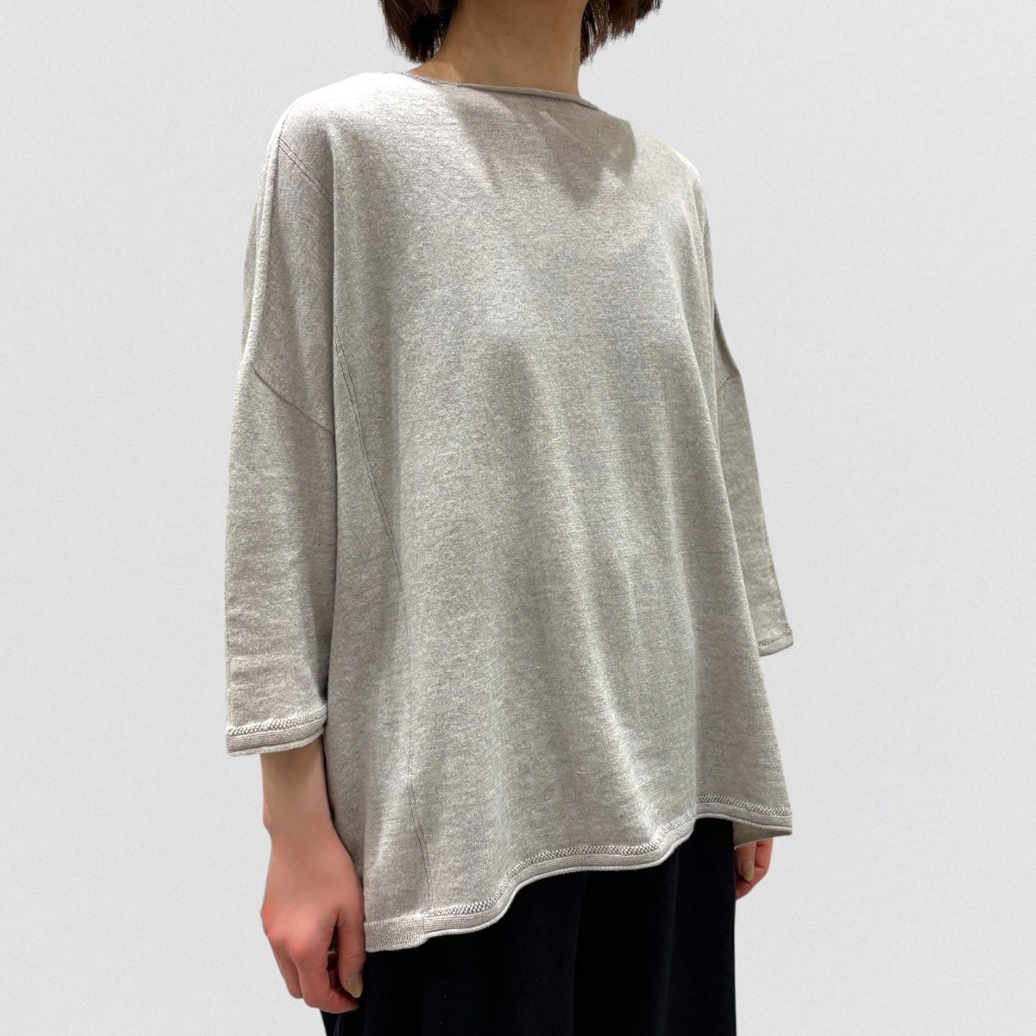 たっぷりとしたスクエアシルエットと、編み終わりをそのまま利用したナチュラルなボートネックが首周りをすっきり見せ、女性らしい抜け感を出しています。