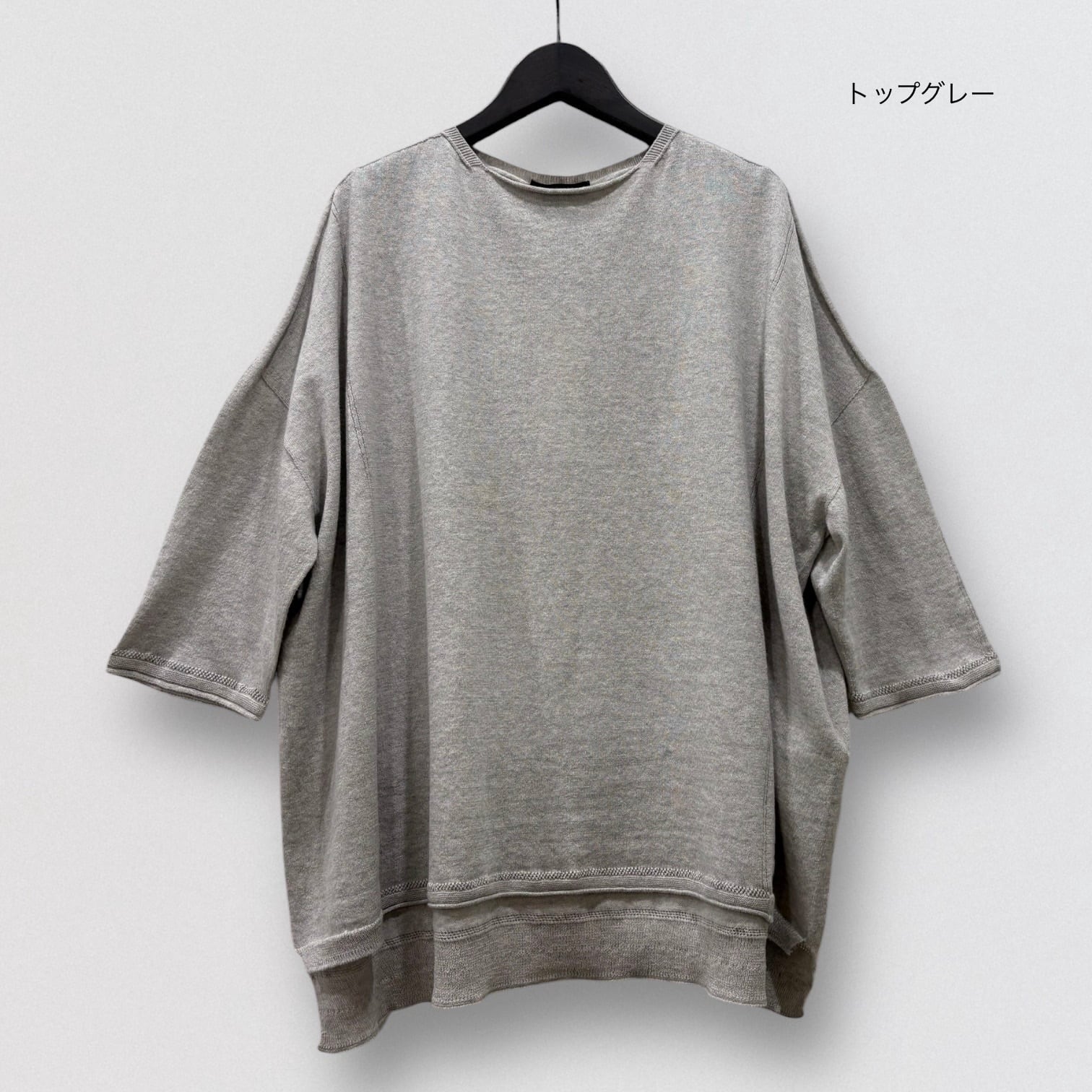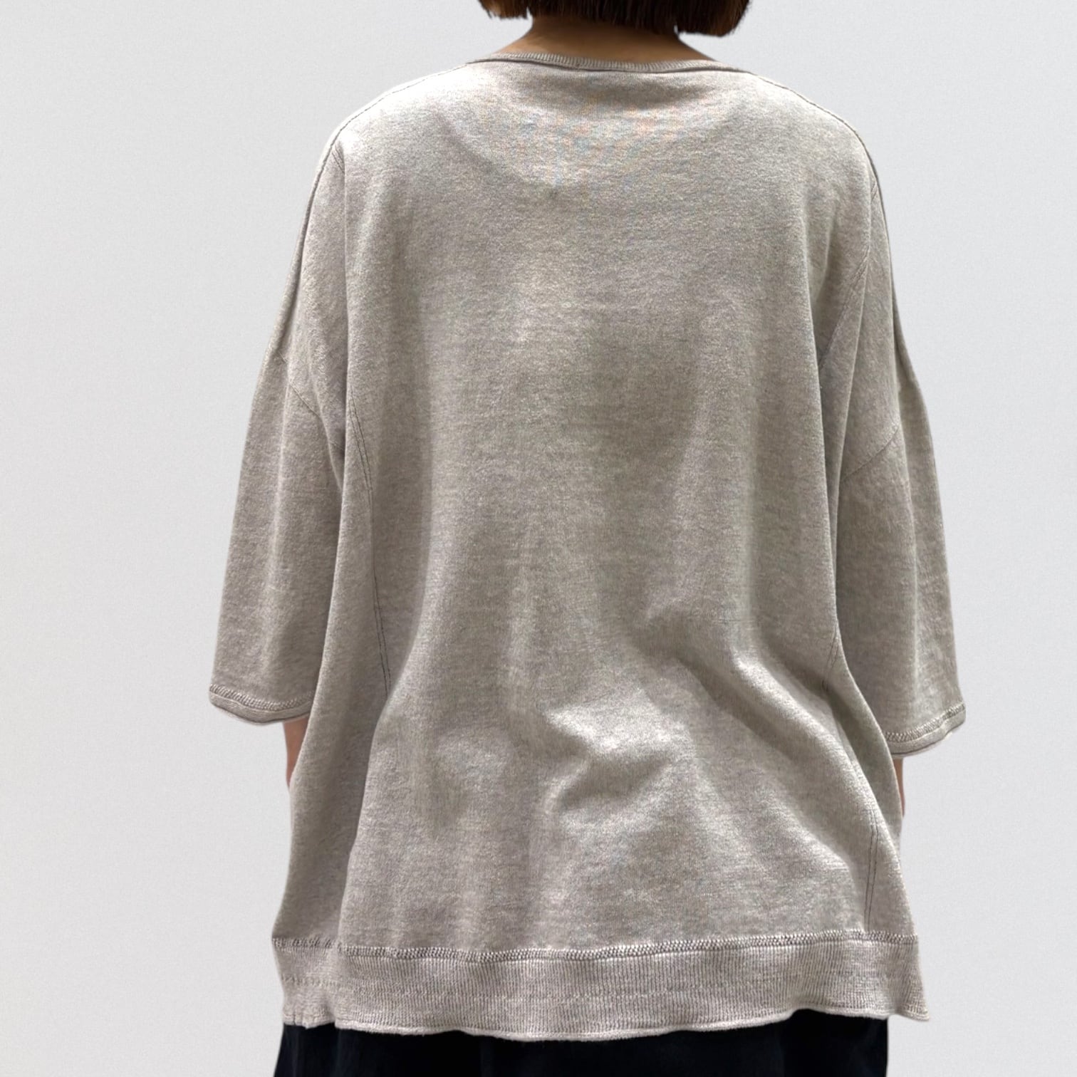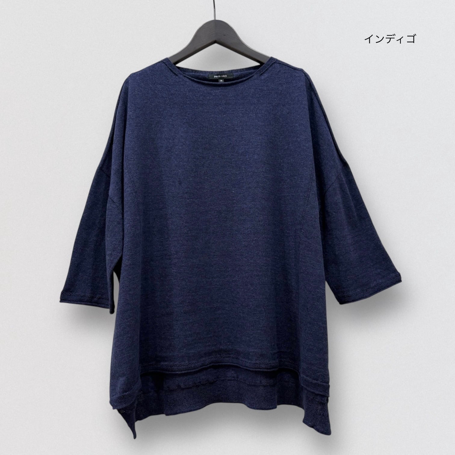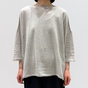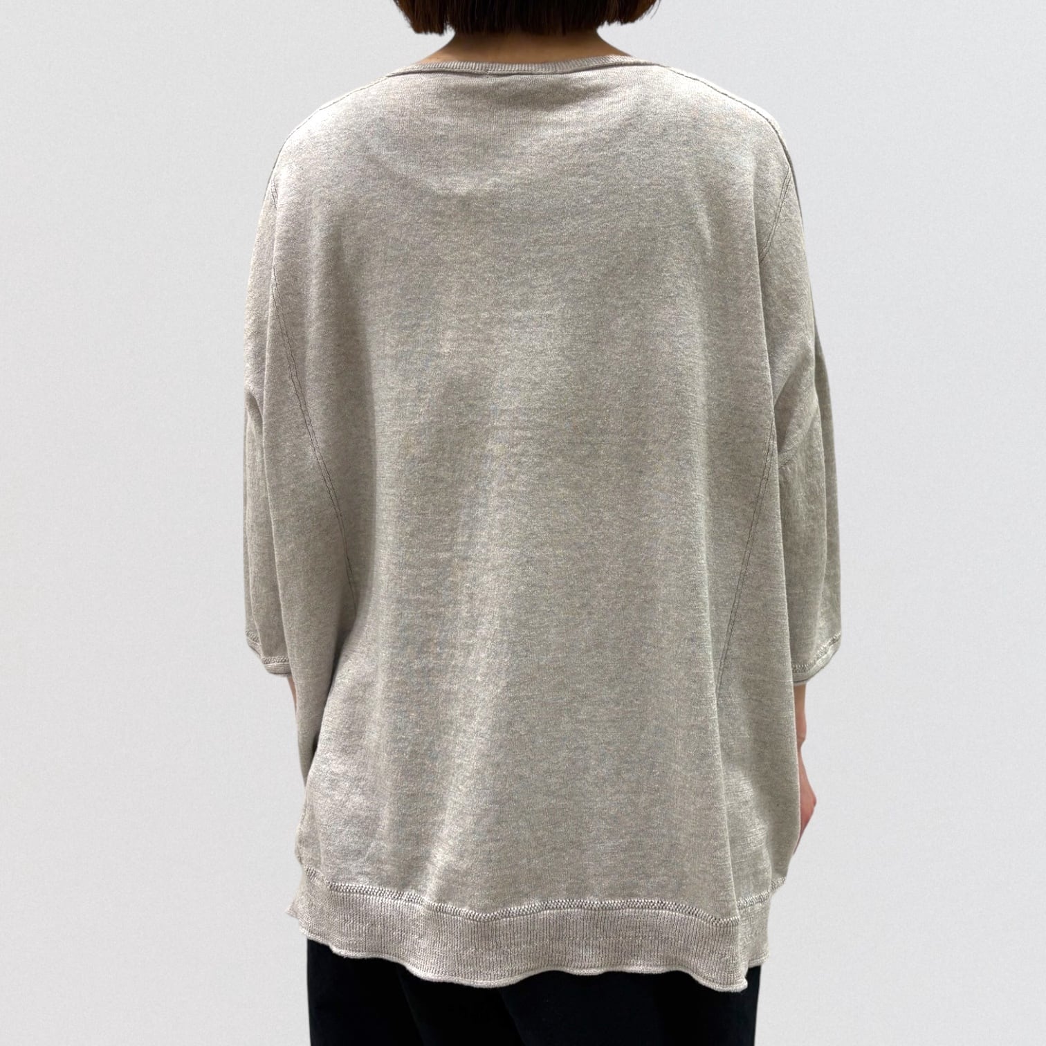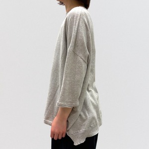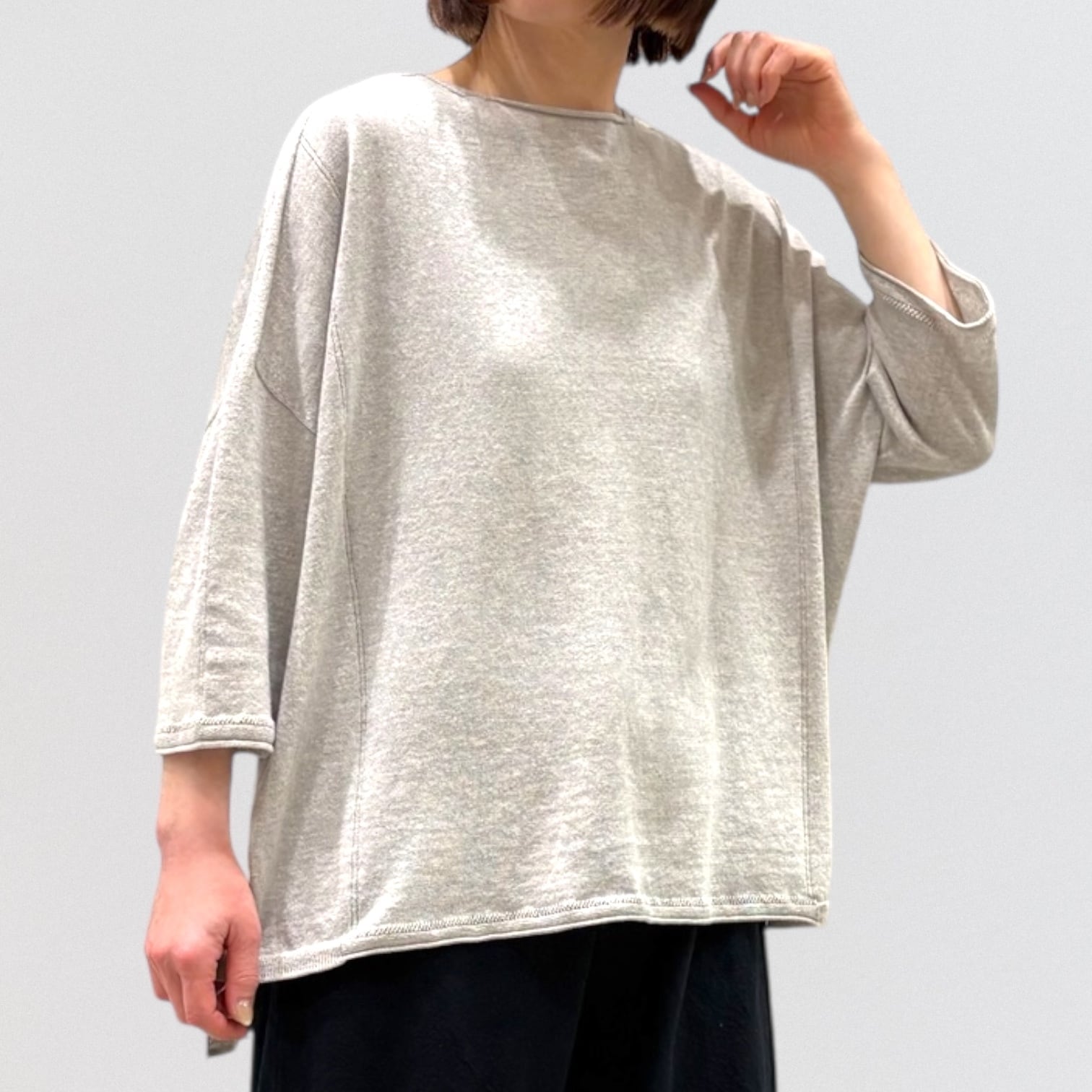 たっぷりとしたスクエアシルエットと、編み終わりをそのまま利用したナチュラルなボートネックが首周りをすっきり見せ、女性らしい抜け感を出しています。