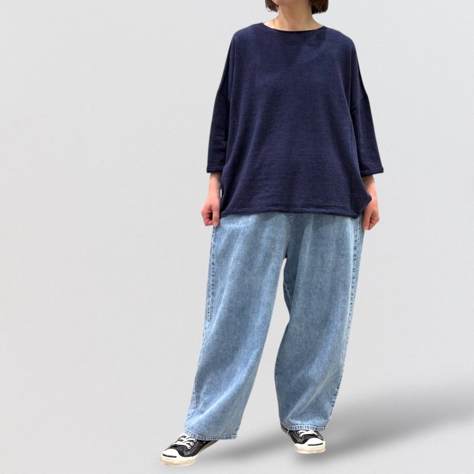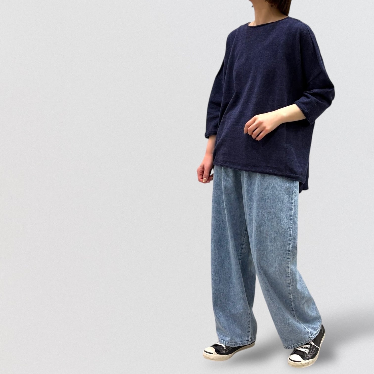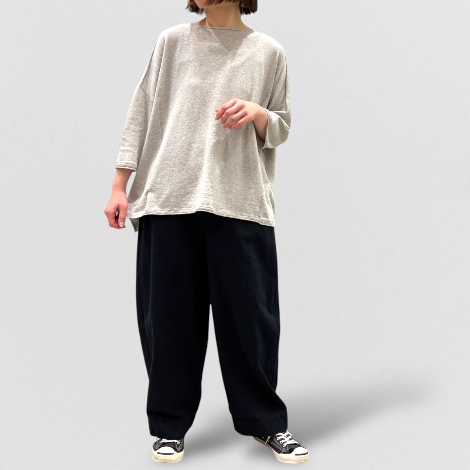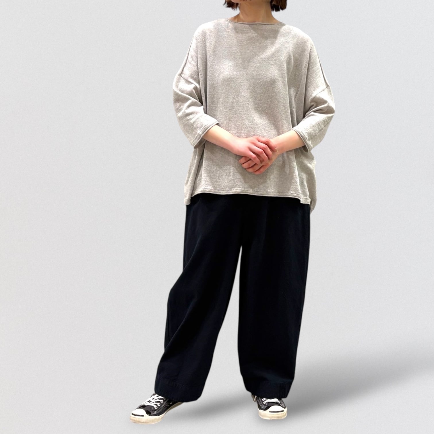 たっぷりとしたスクエアシルエットと、編み終わりをそのまま利用したナチュラルなボートネックが首周りをすっきり見せ、女性らしい抜け感を出しています。