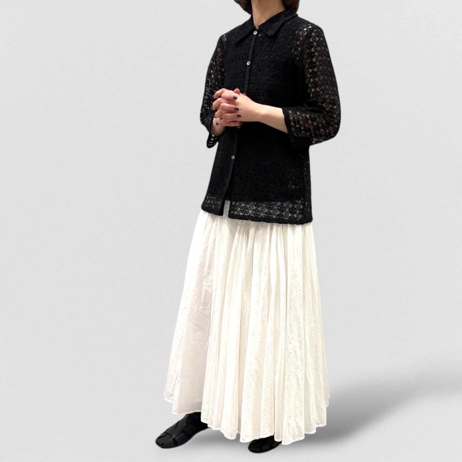 すっきりとしたサイズ感、ヒップにかかるほどの丈、長すぎない袖丈、襟付きの上品なシャツを表現しました。