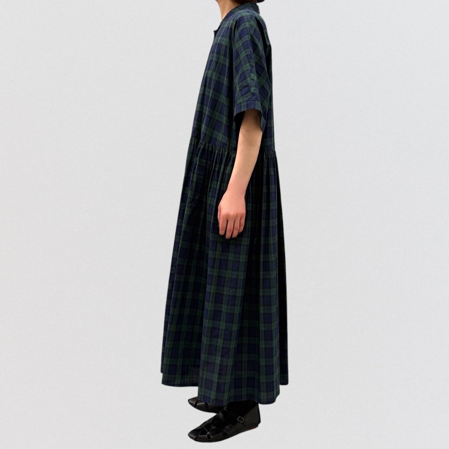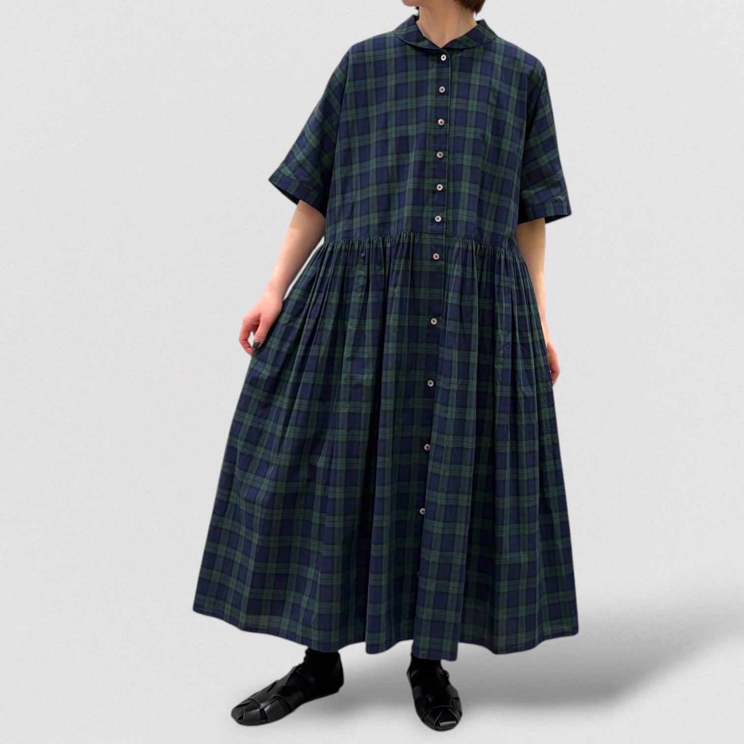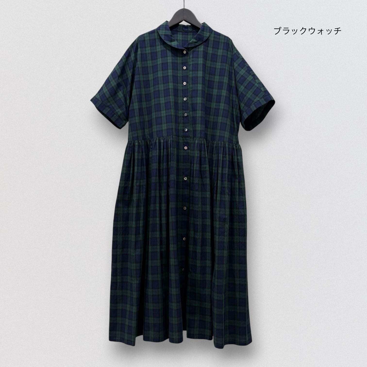 スッキリ見えするブラックウォッチのギャザーワンピースです。