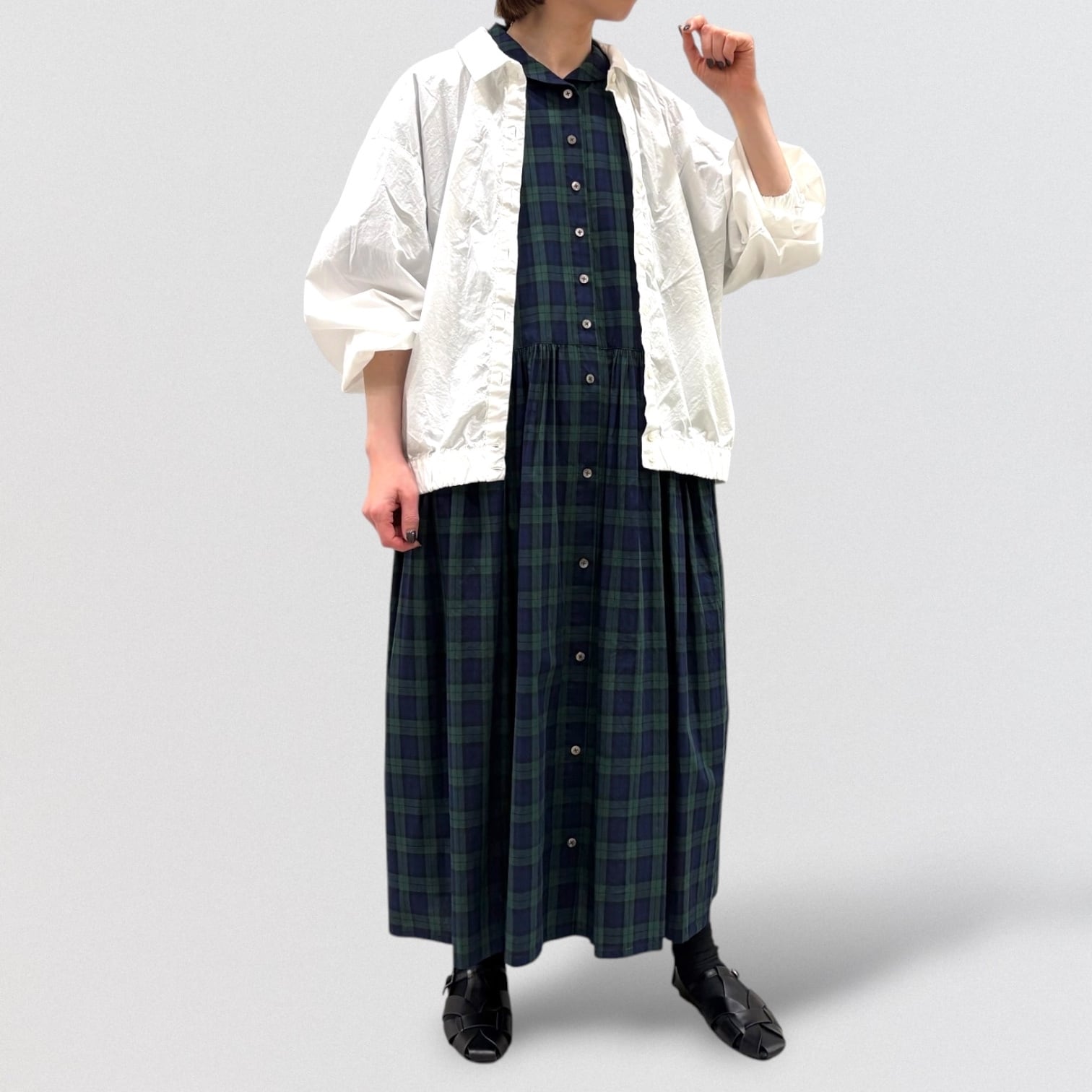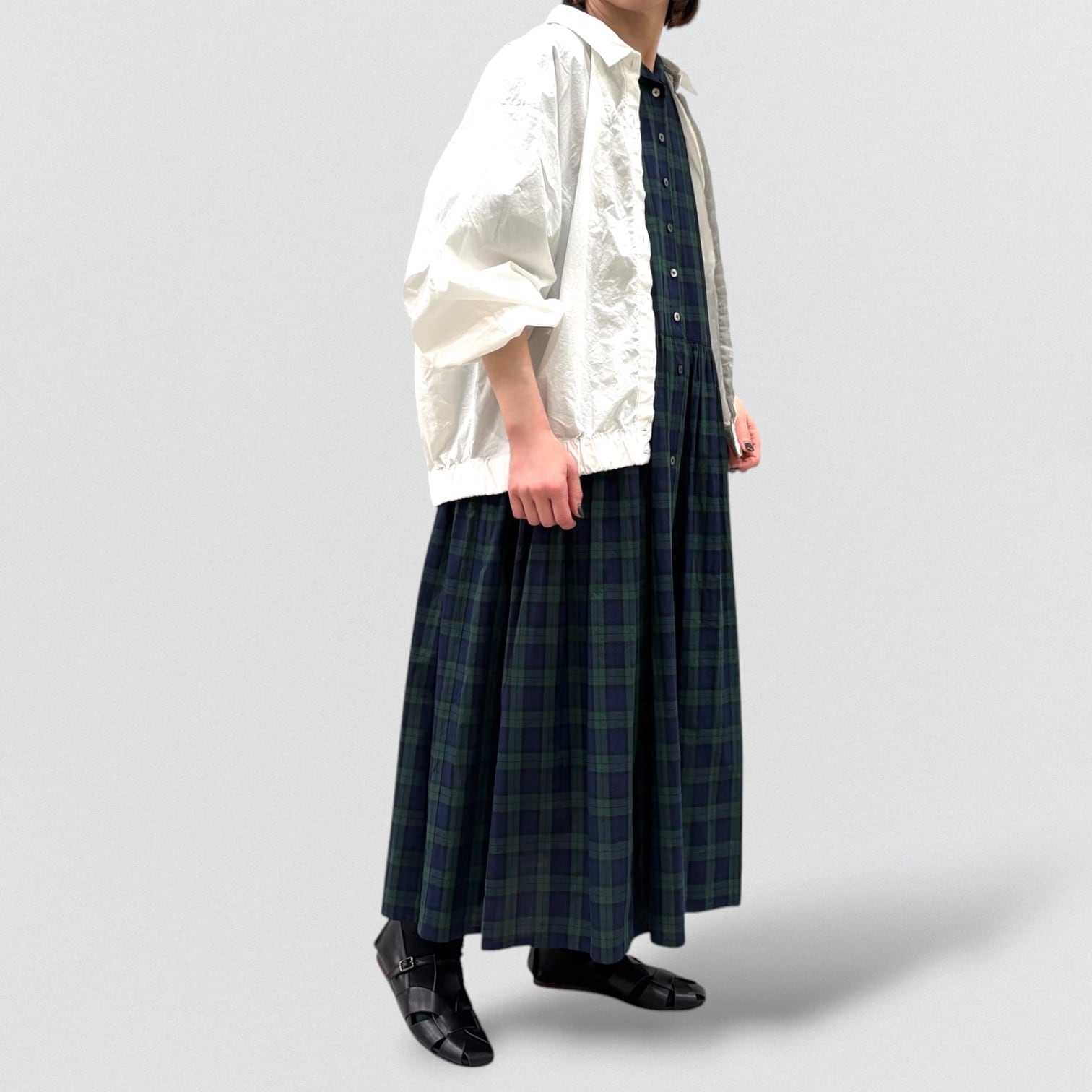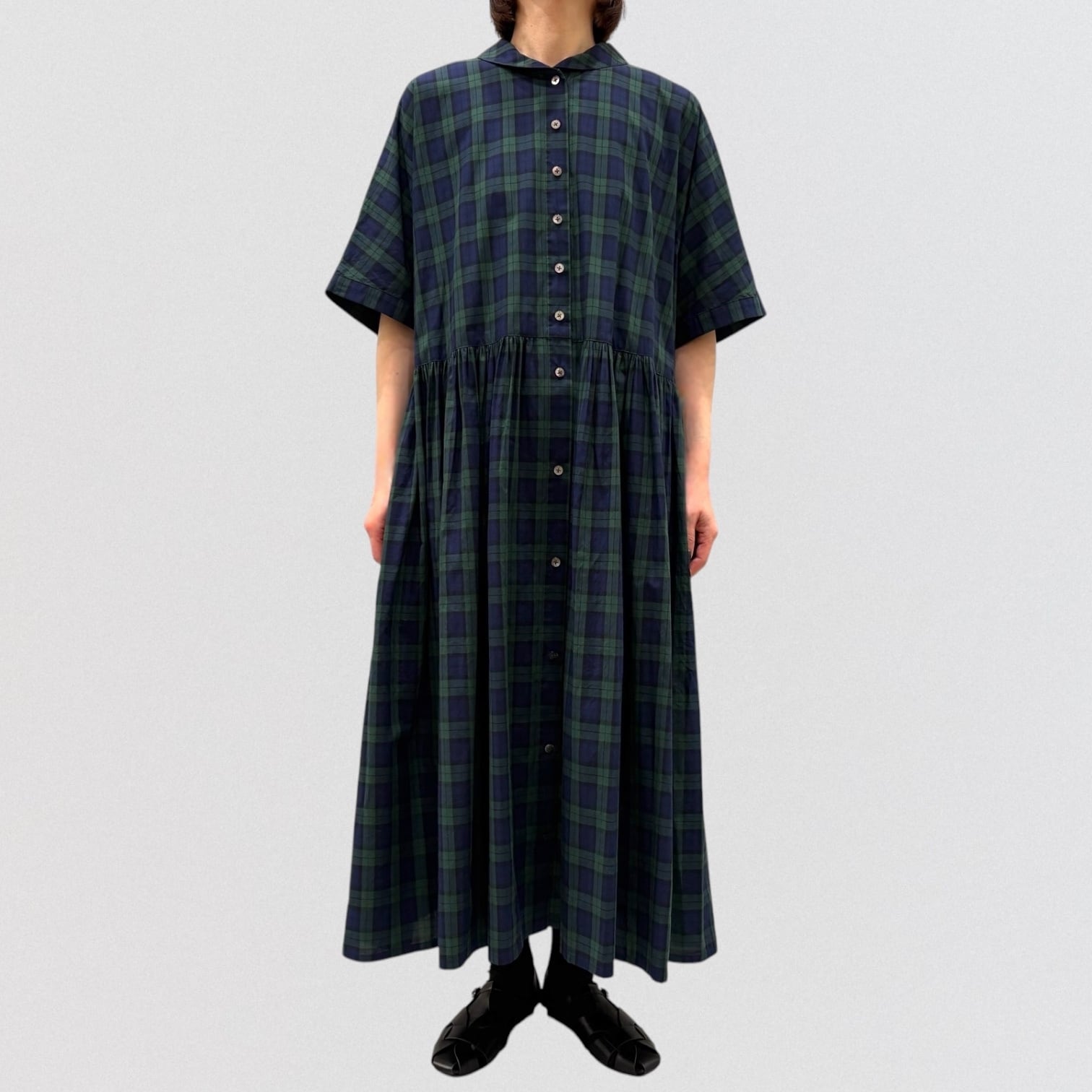 スッキリ見えするブラックウォッチのギャザーワンピースです。