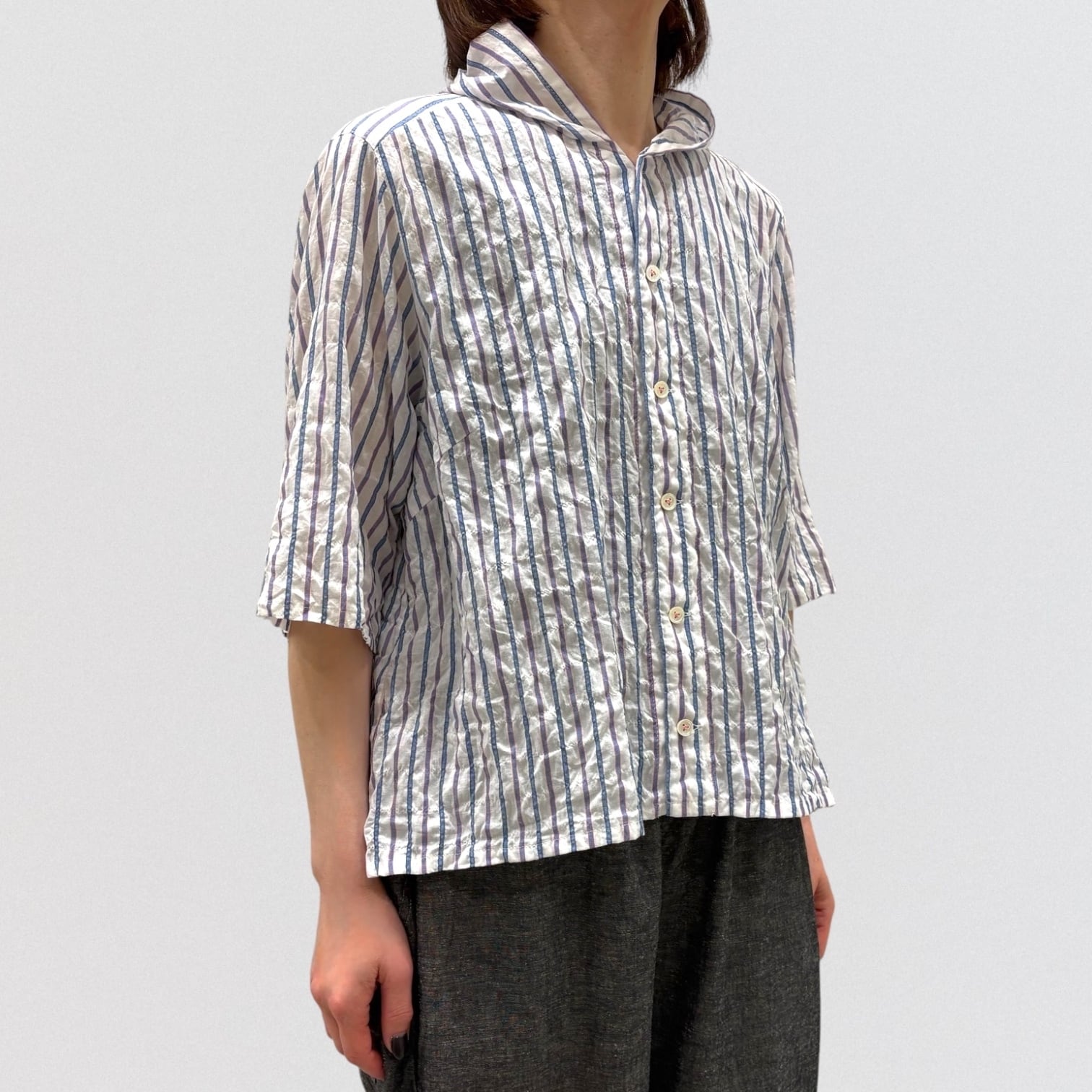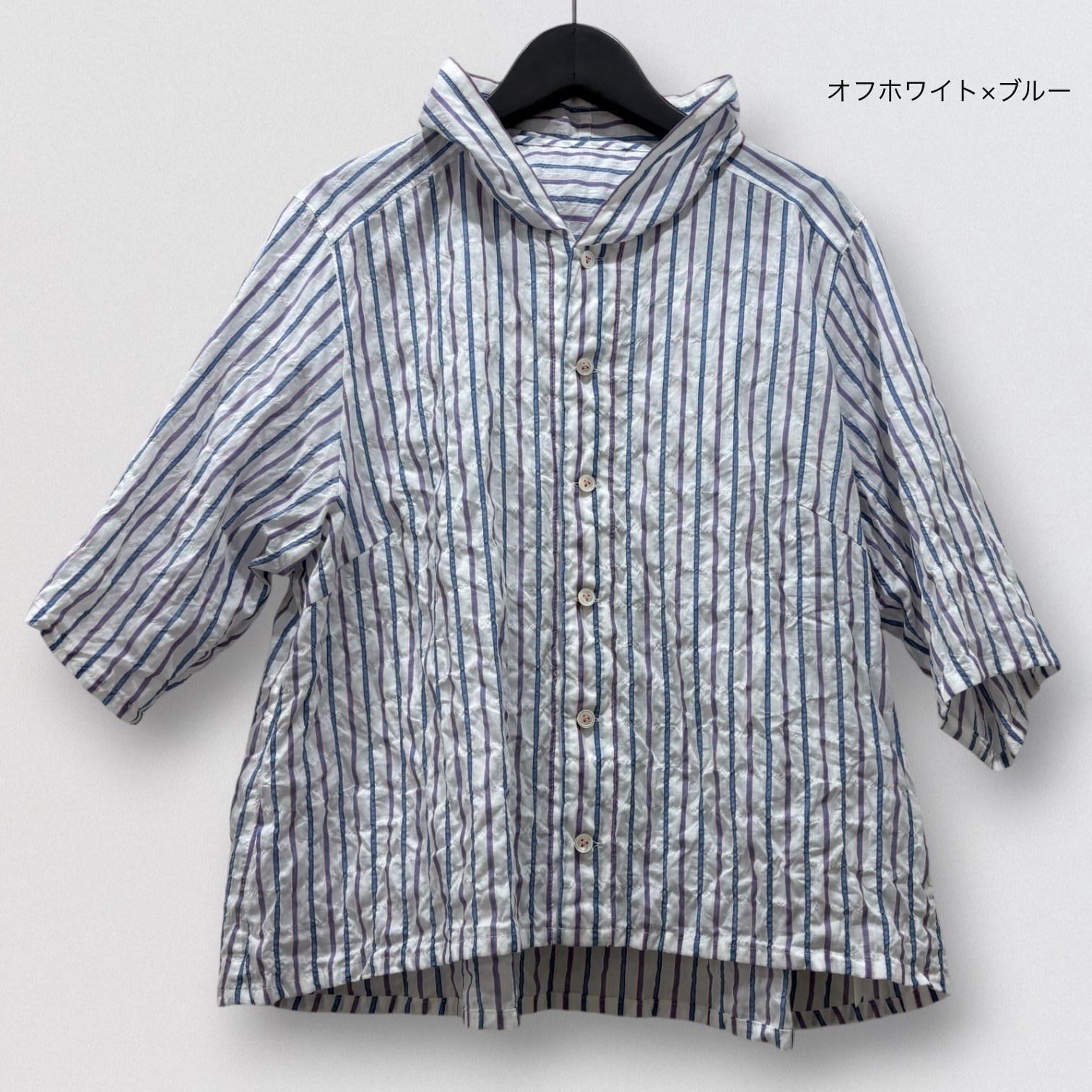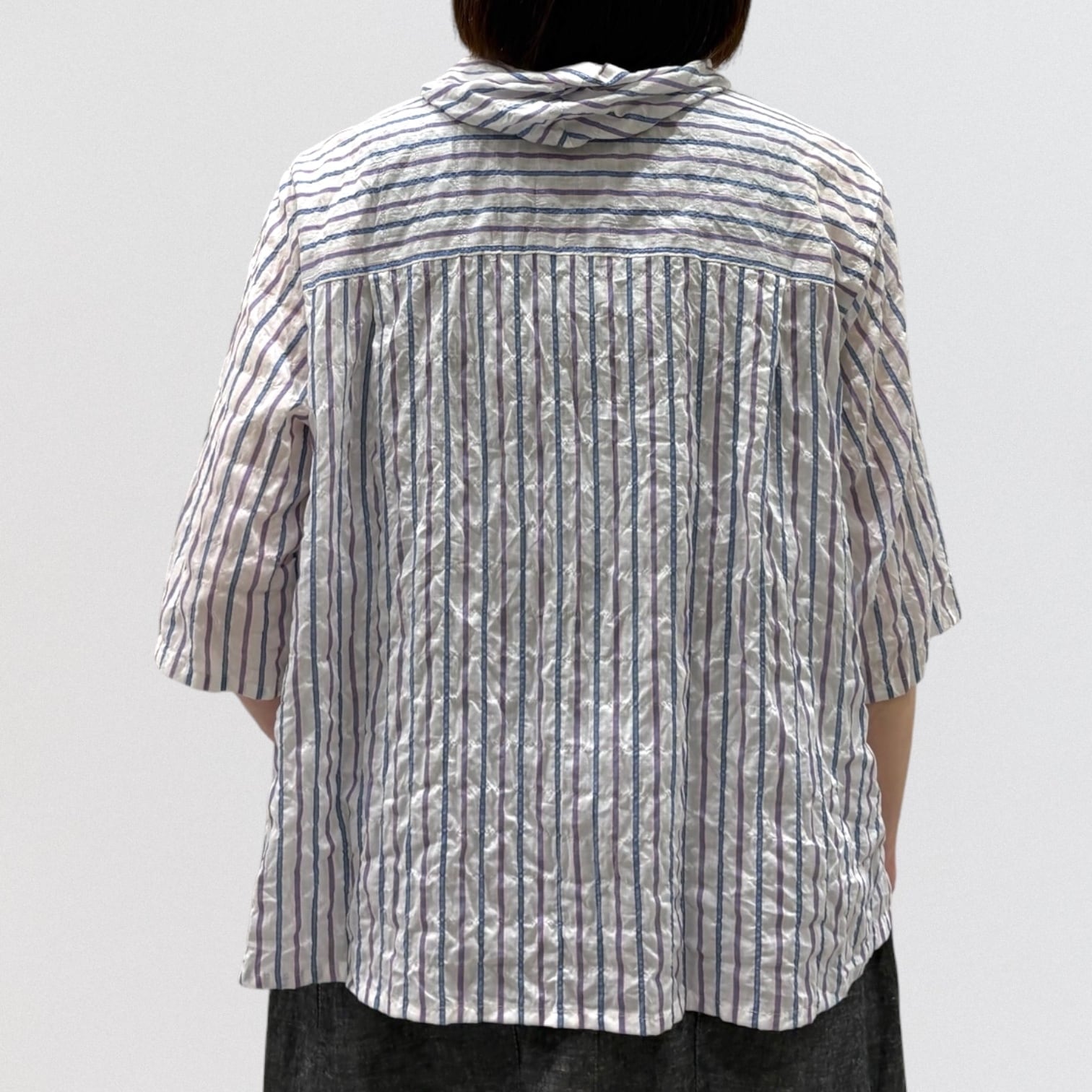 清涼感あるシャーリングストライプにフード風衿を付けたブラウス。