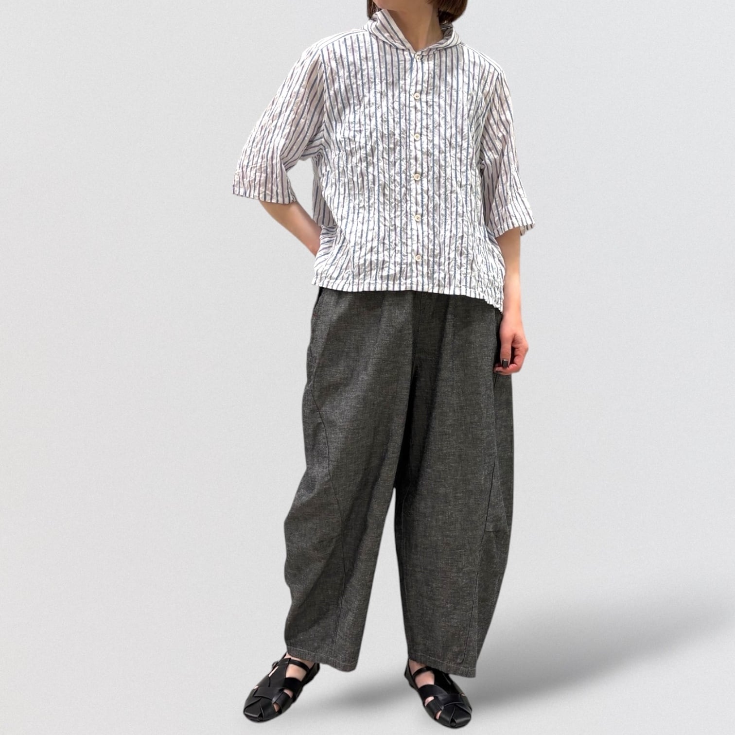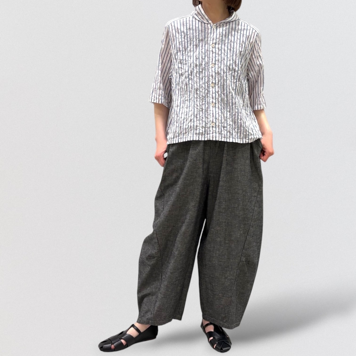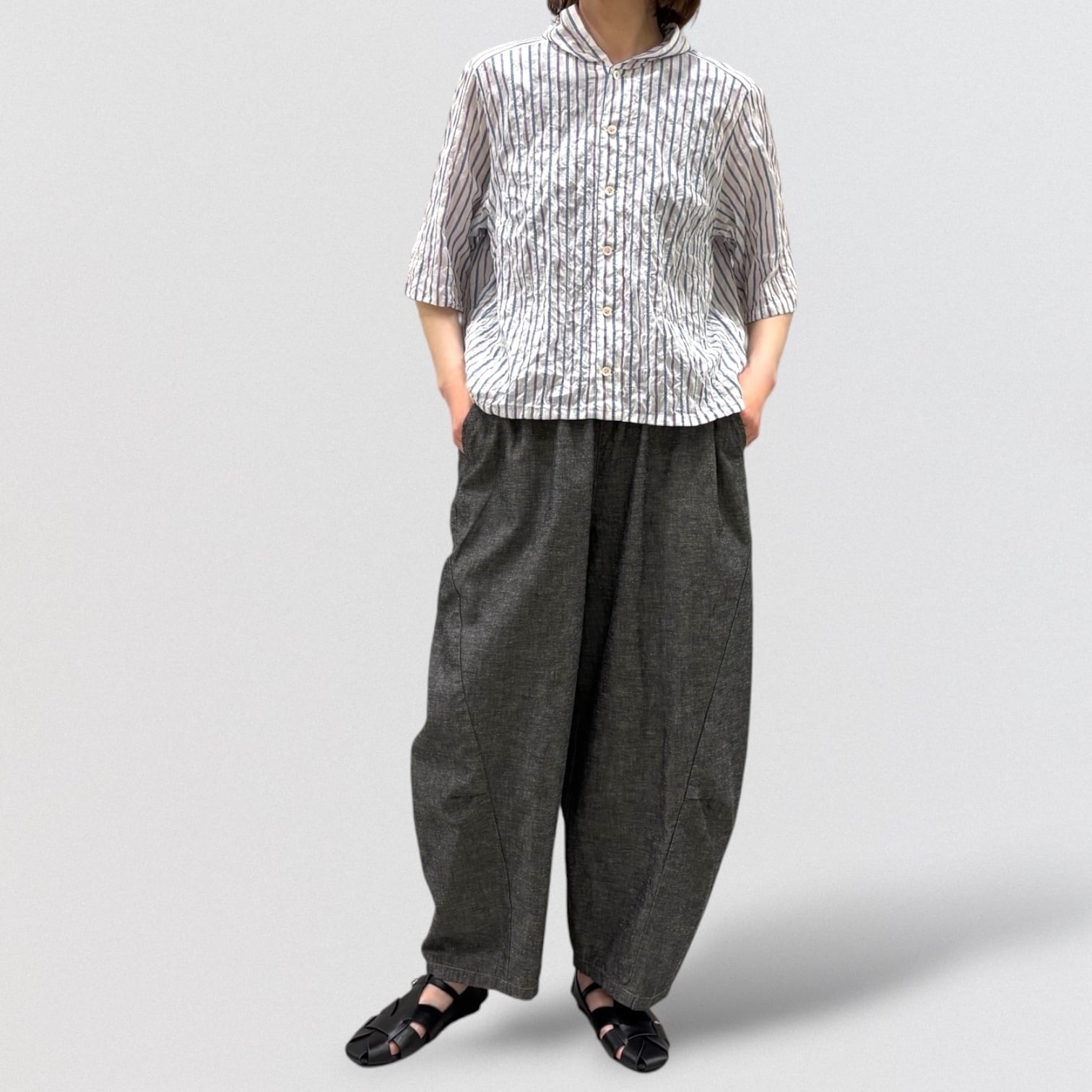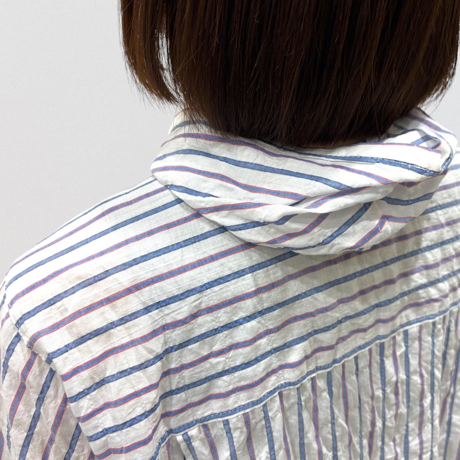清涼感あるシャーリングストライプにフード風衿を付けたブラウス。