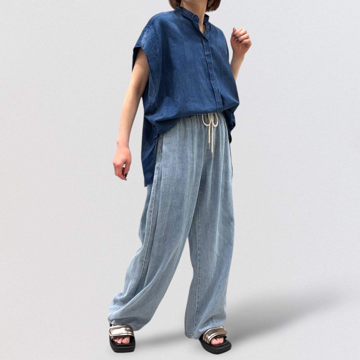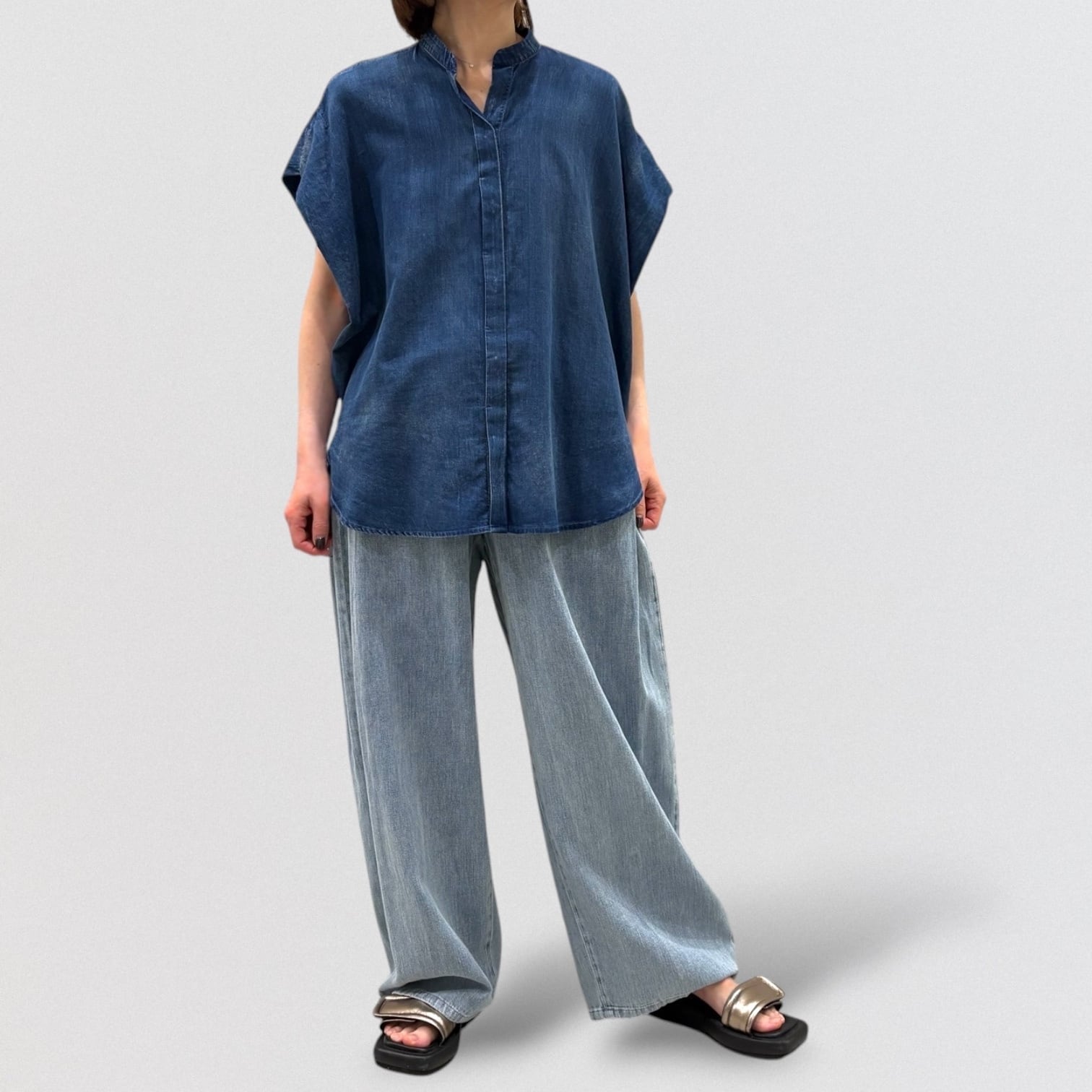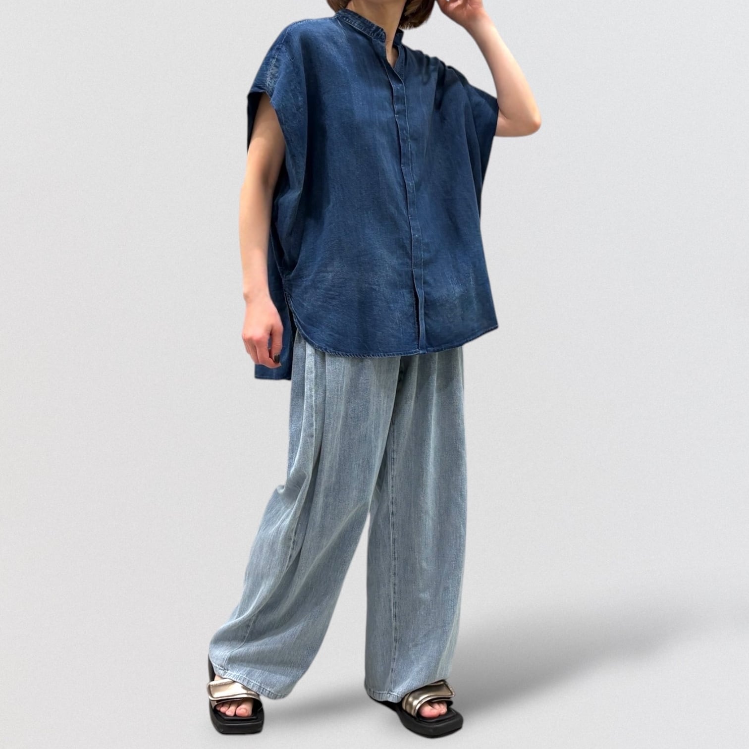 今年人気のシアーデニム素材を使用、デニムの風合いはそのままに、極限まで薄く軽く仕上げることで、まるで空気を纏っているかのような通気性。
