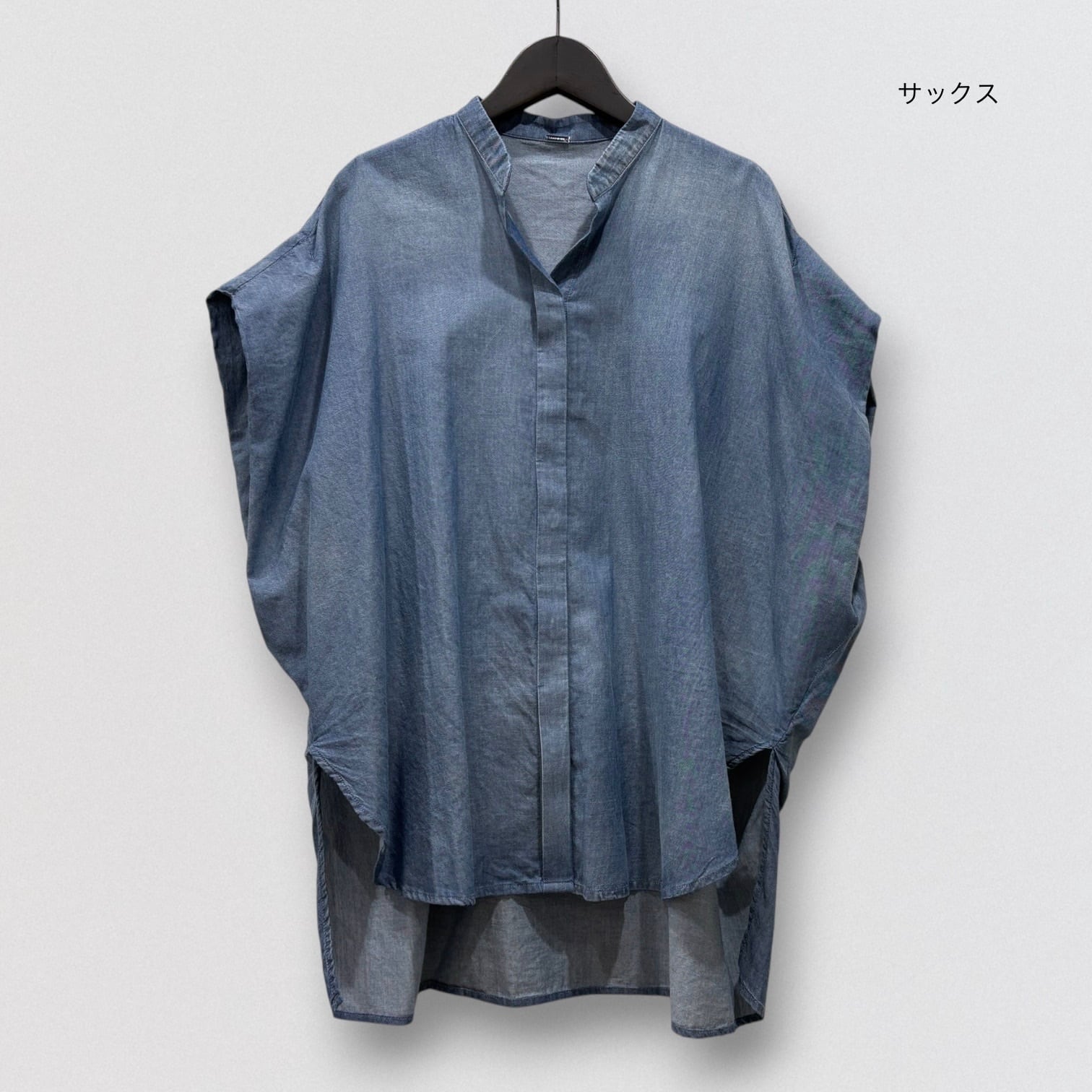 比翼仕立ての首元は顔周りをすっきりと見せるコンパクトなバンドカラーブラウス。