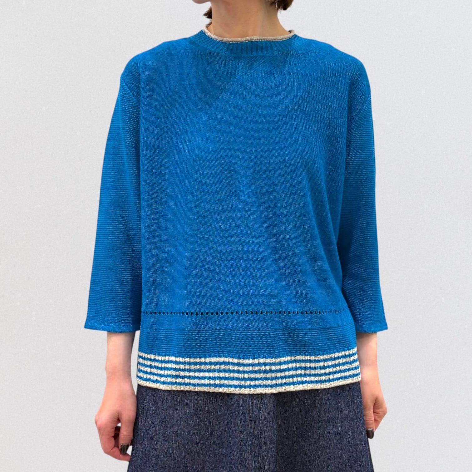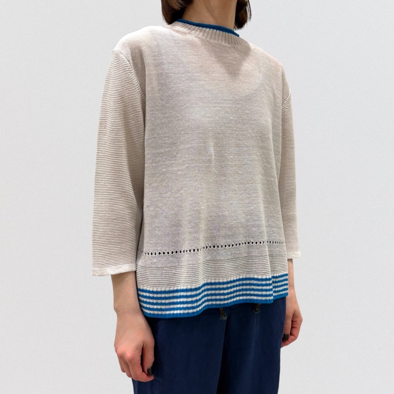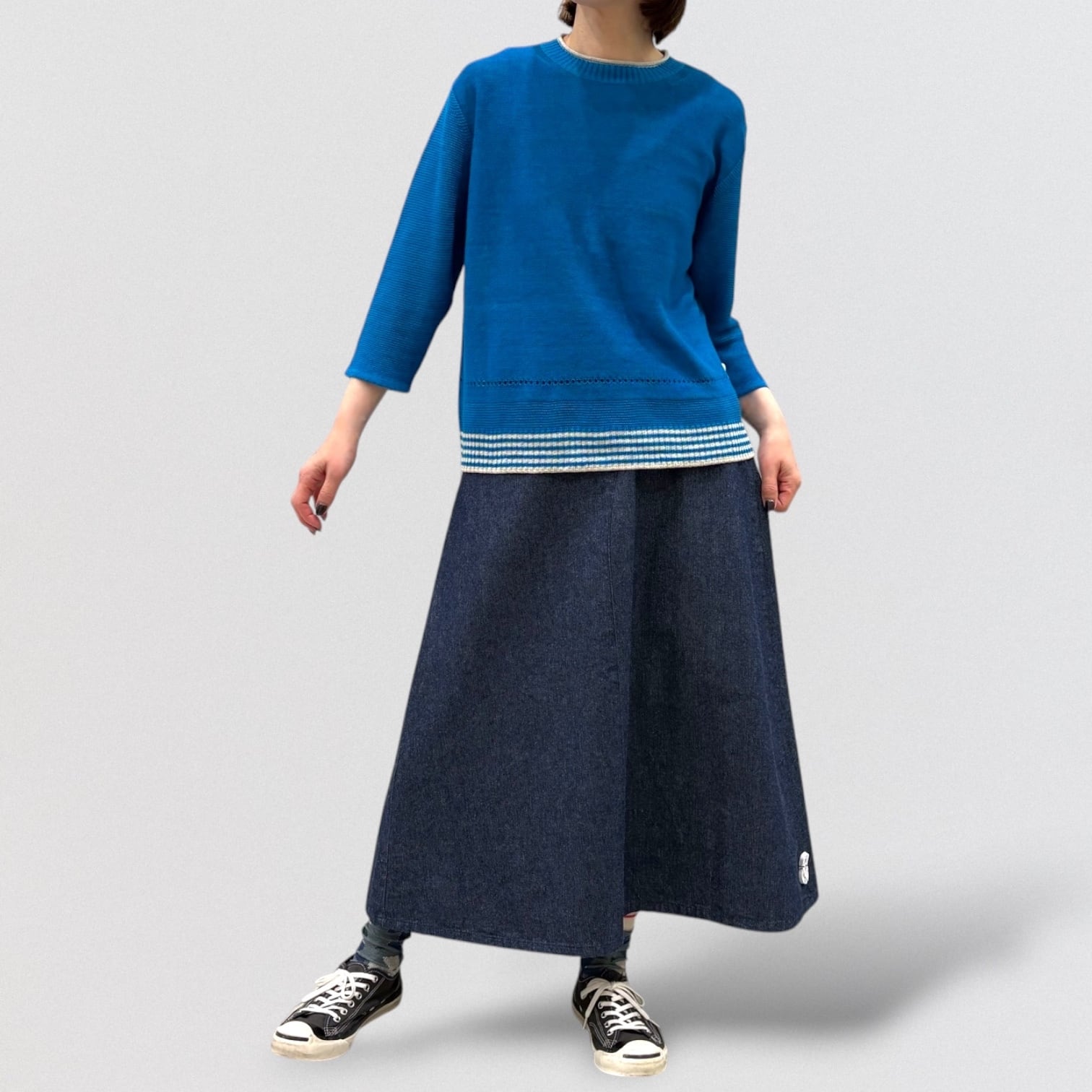 衿ぐりと裾は配色のアクセントを入れたリブ編みでポイントに。