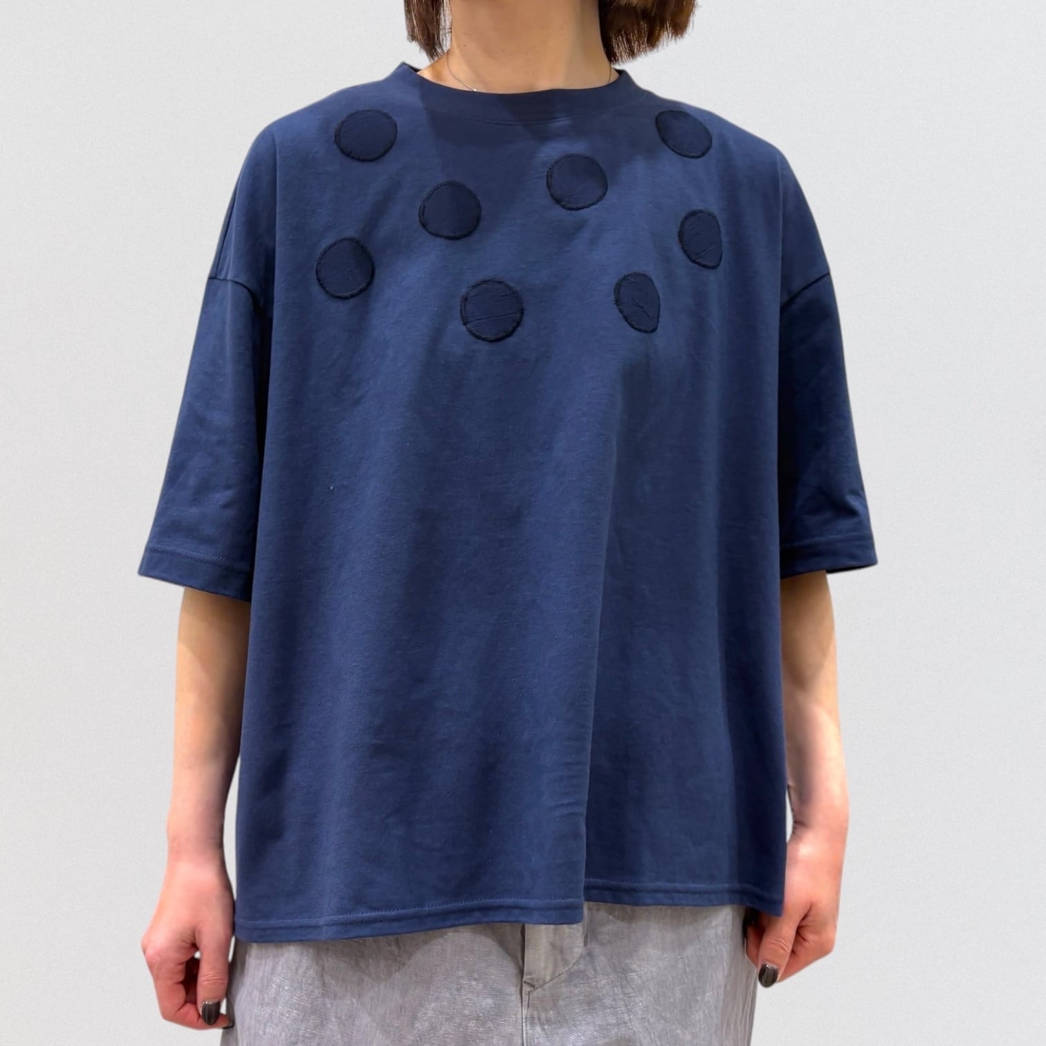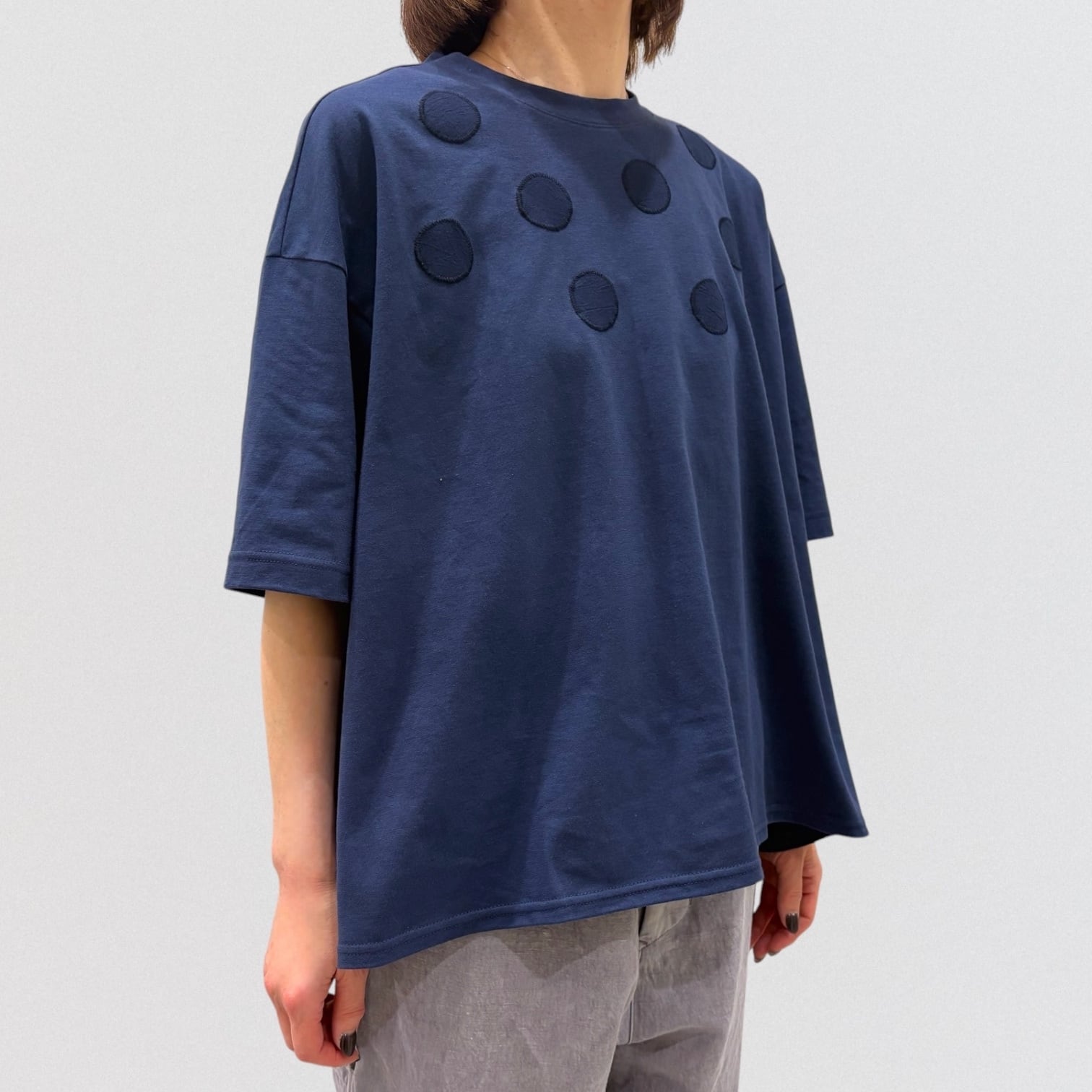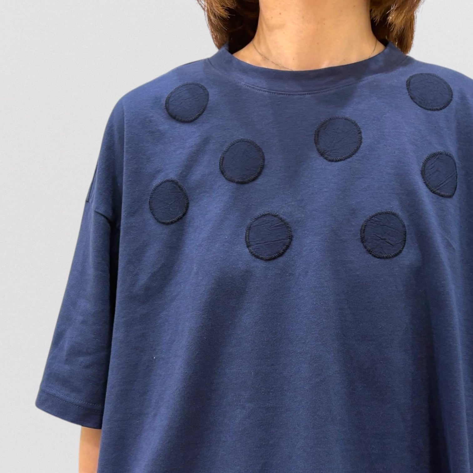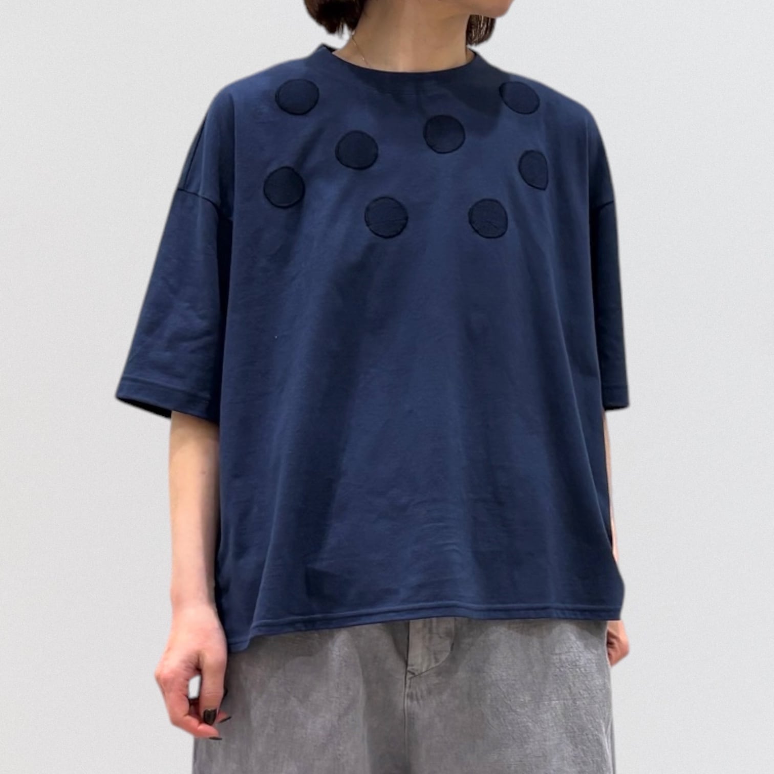 丸柄刺繍をさりげなく胸に施したTシャツ。