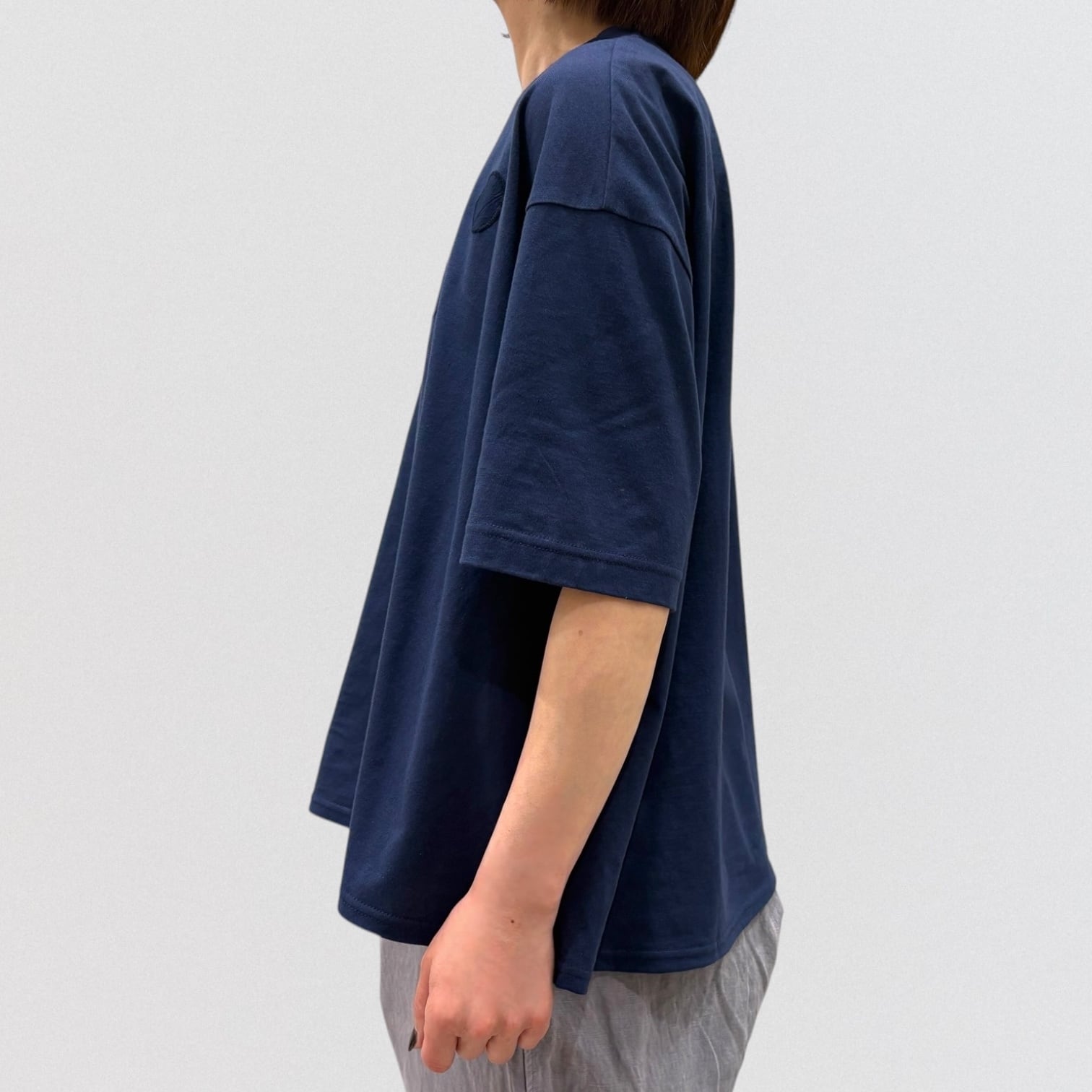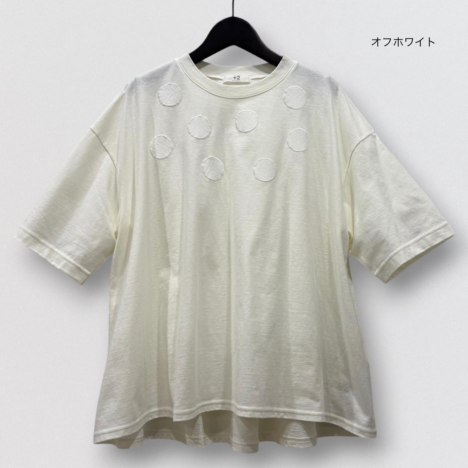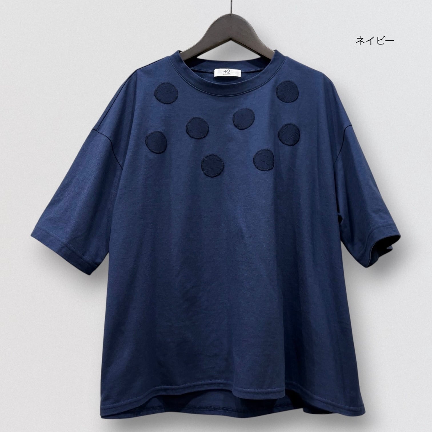 丸柄刺繍をさりげなく胸に施したTシャツ。