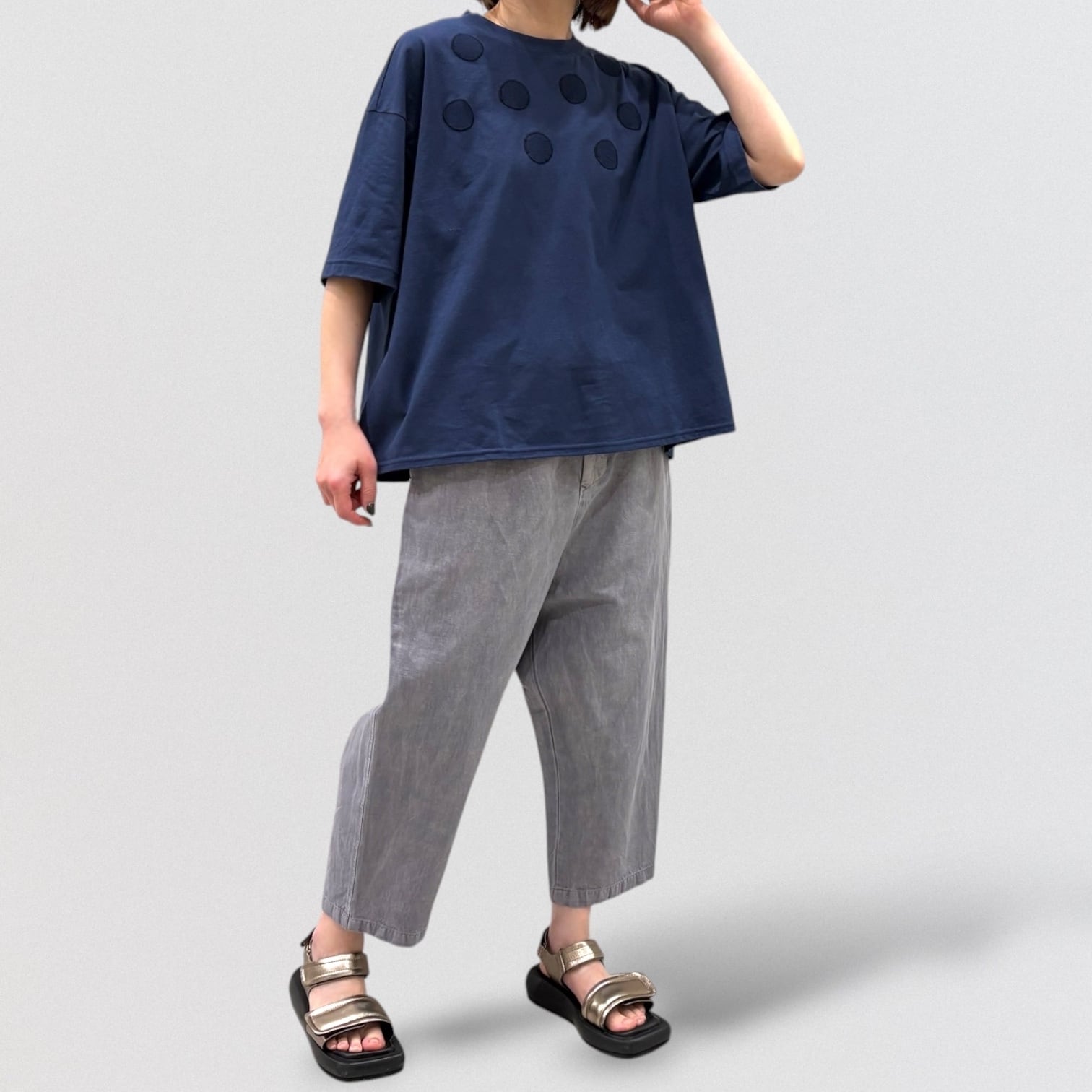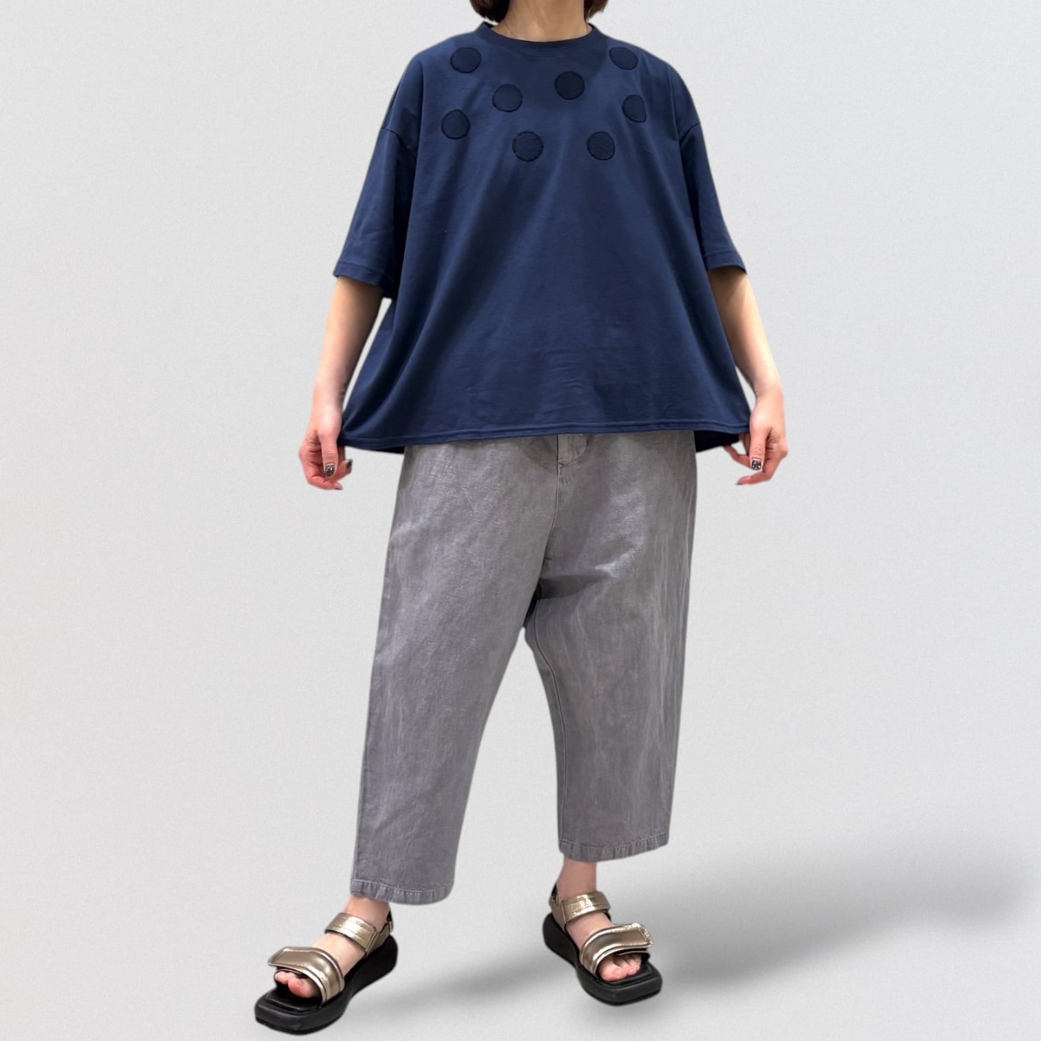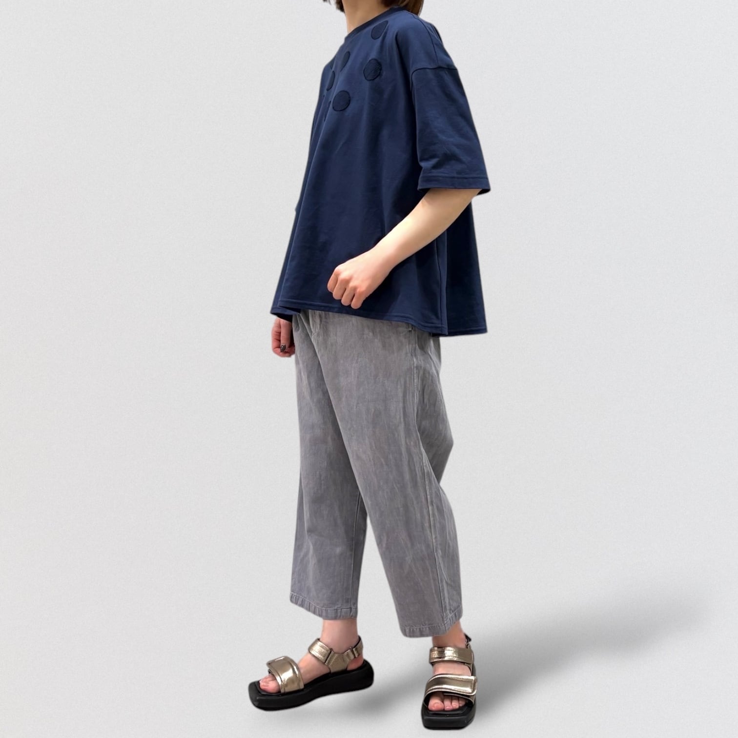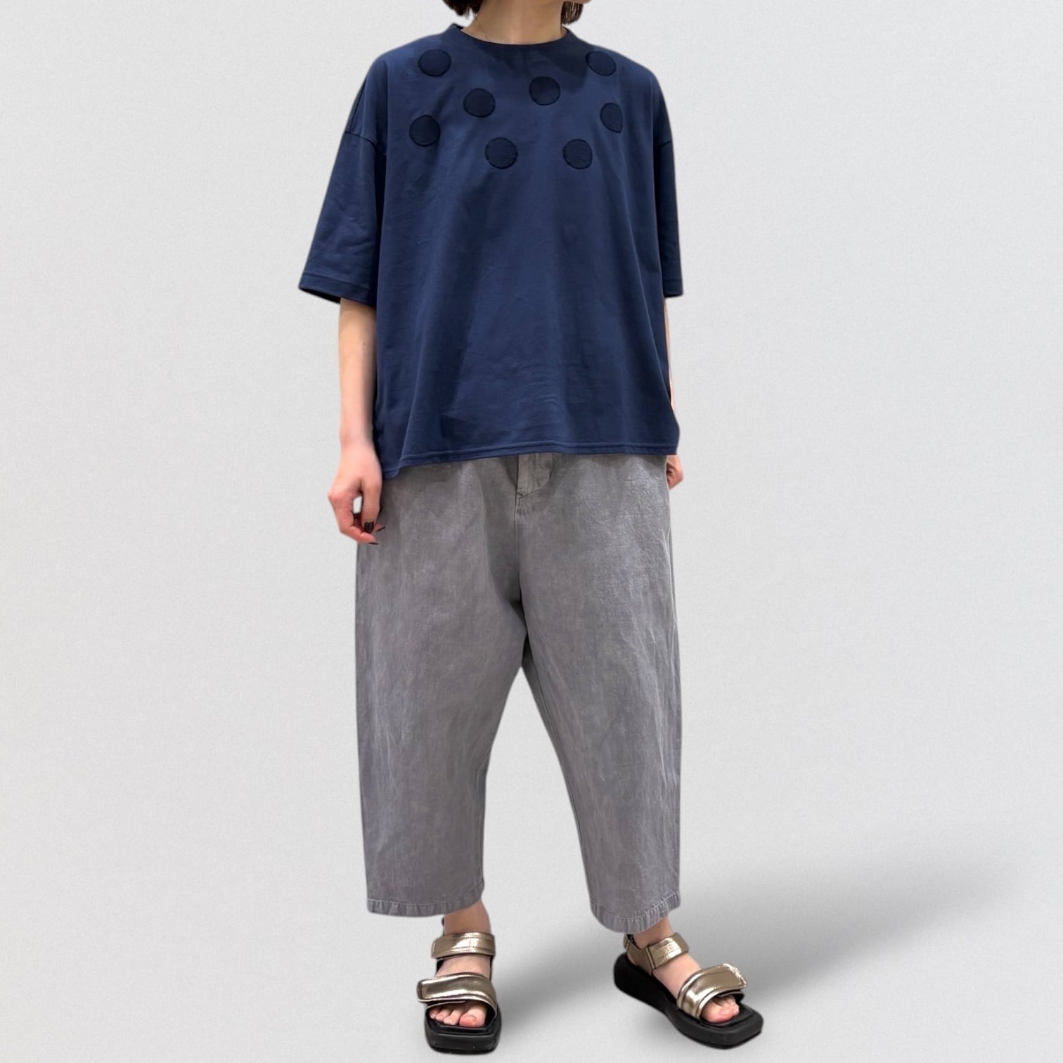 丸柄刺繍をさりげなく胸に施したTシャツ。
