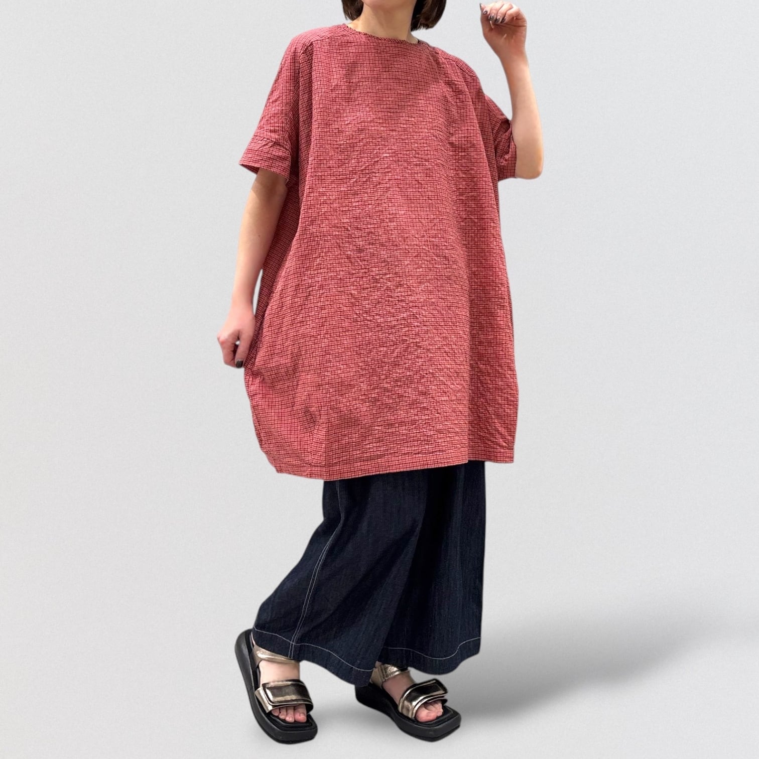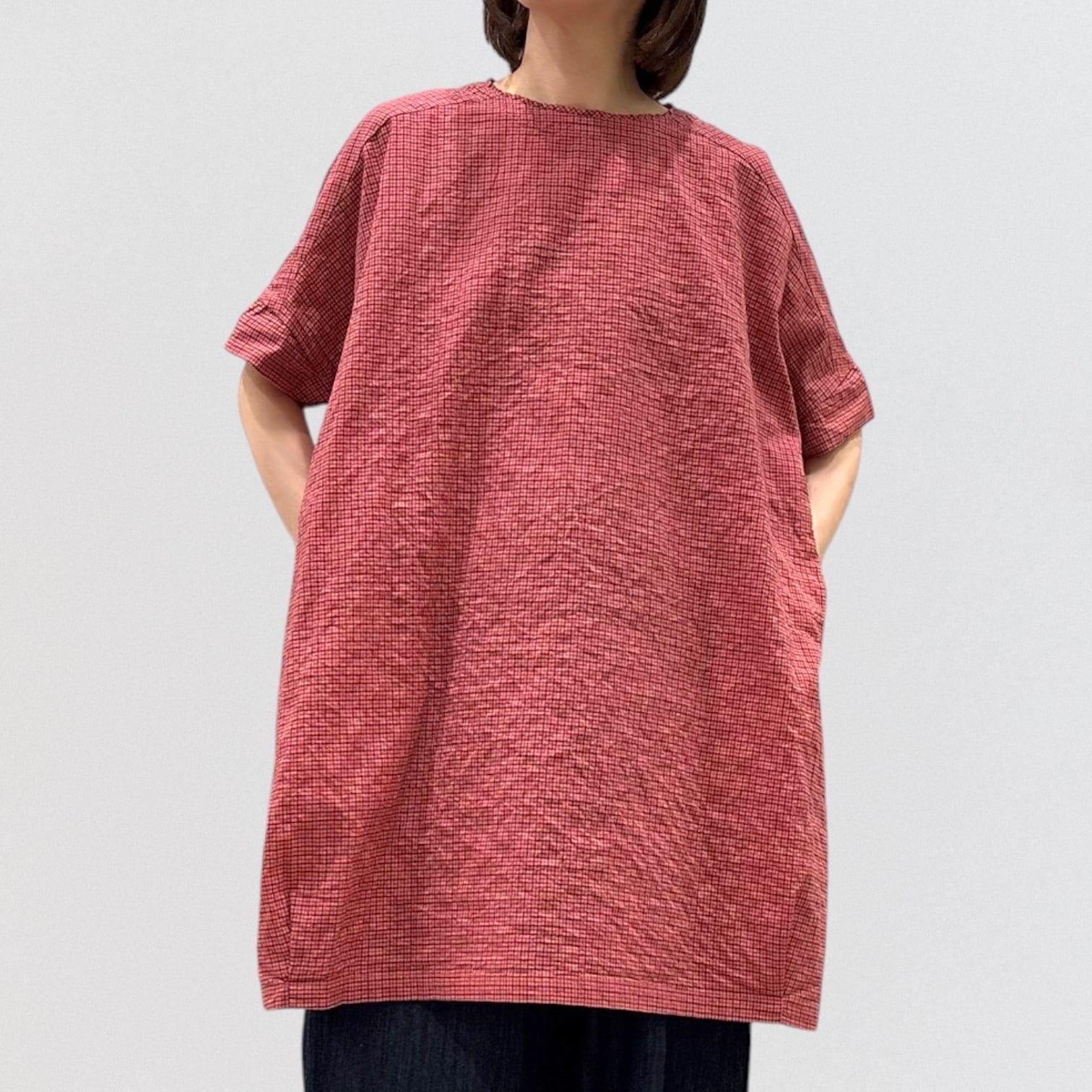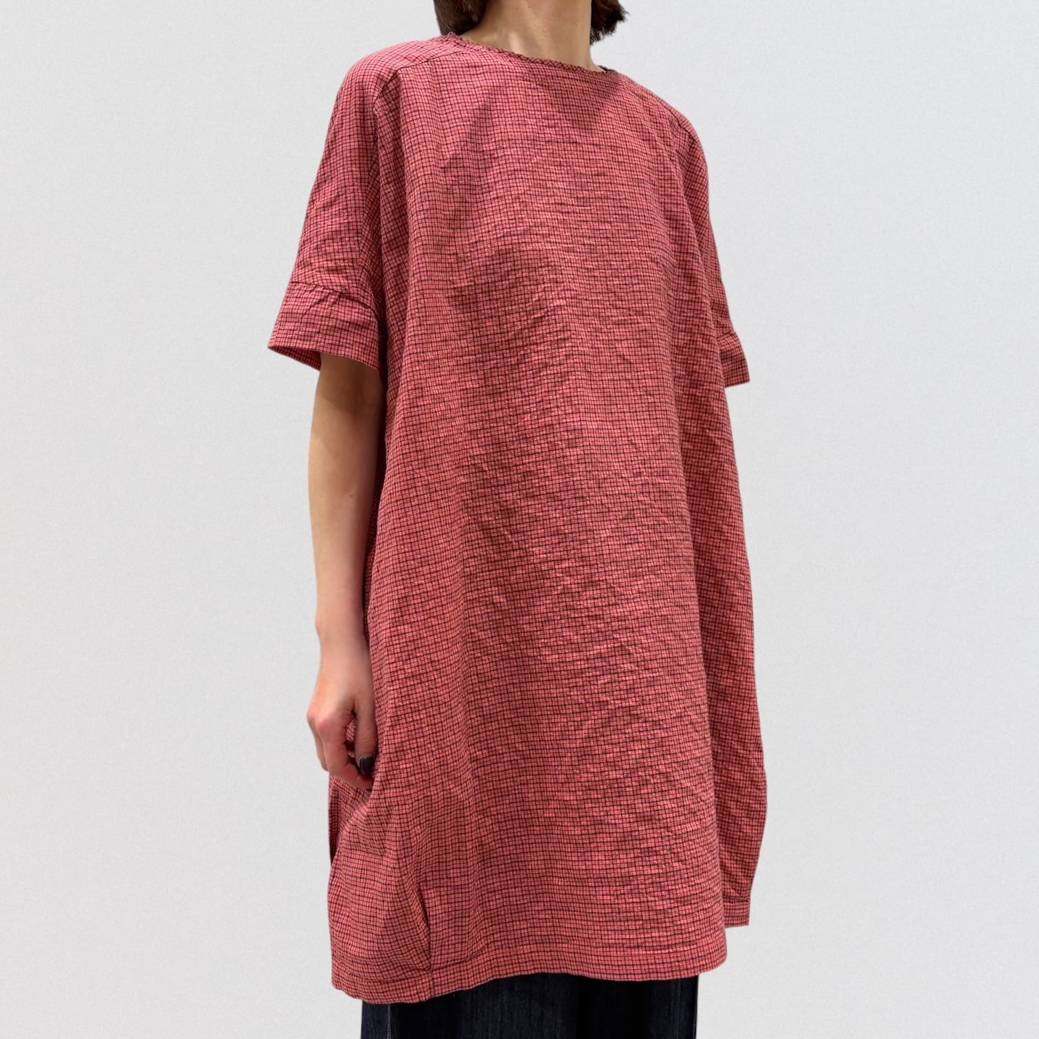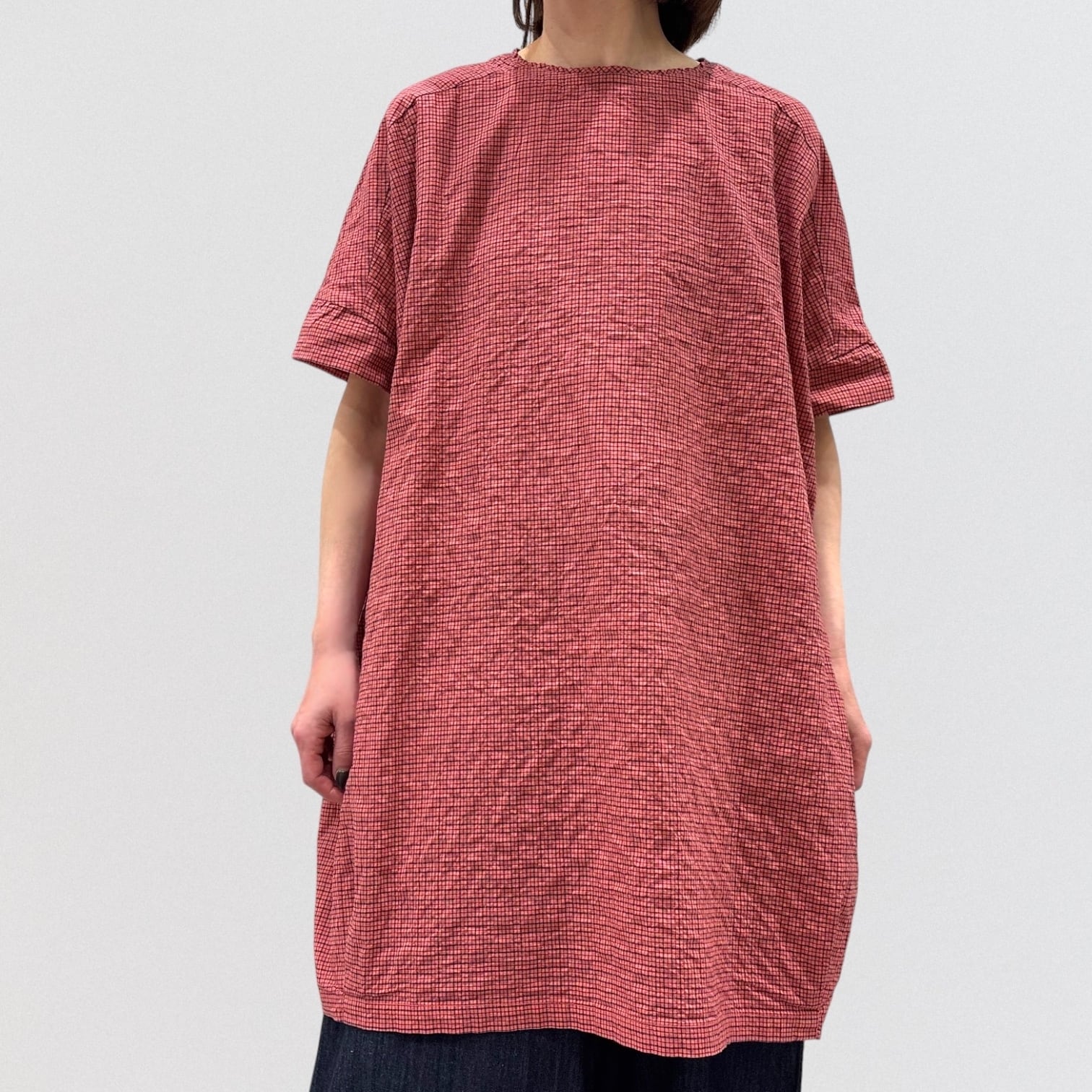 シャーリングチェックのワイドチュニックプルオーバー。