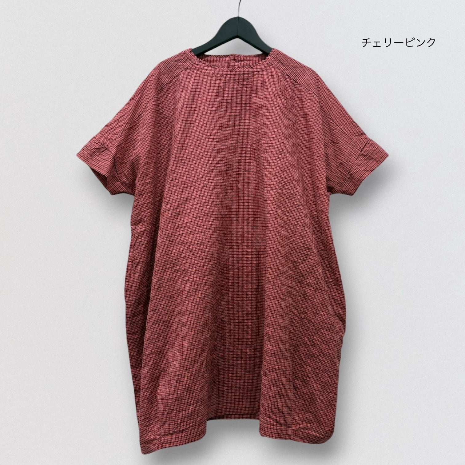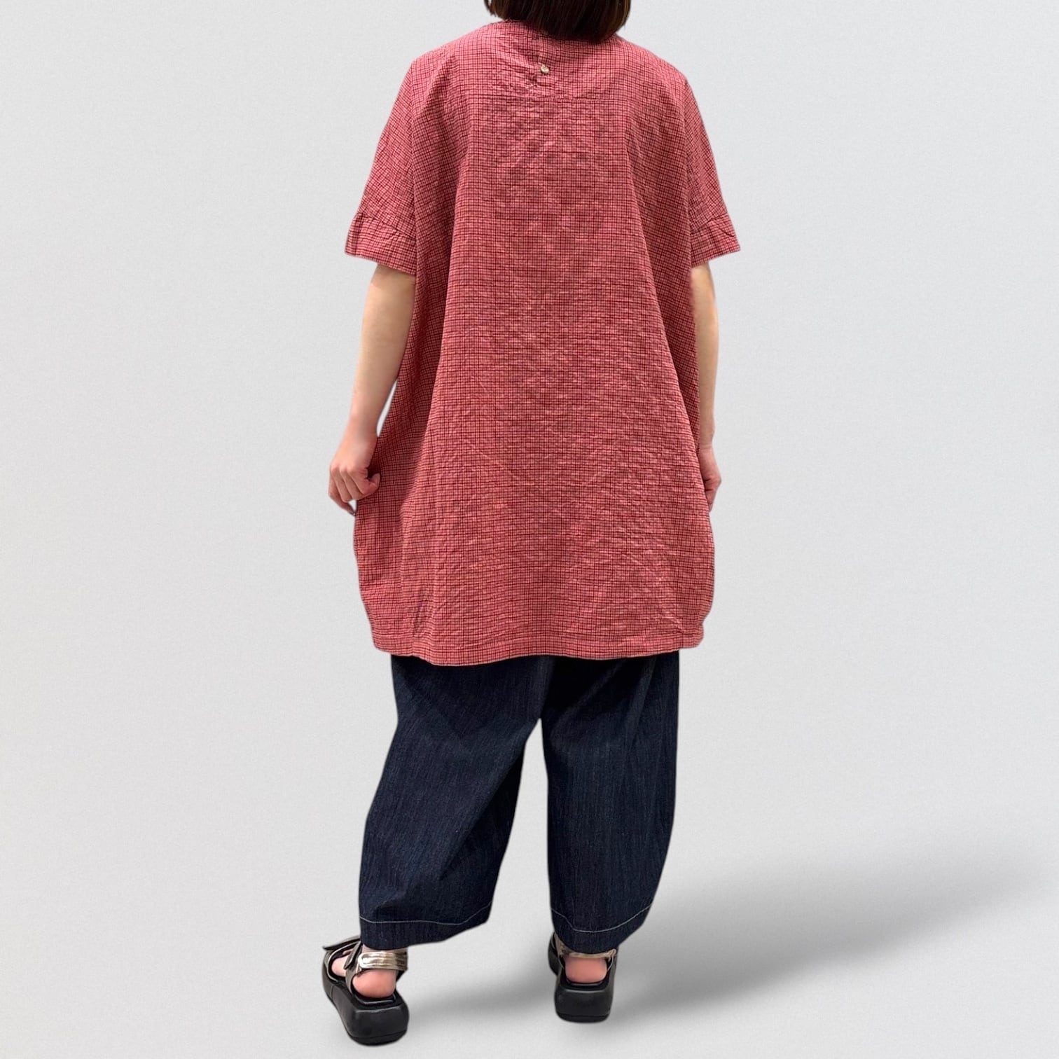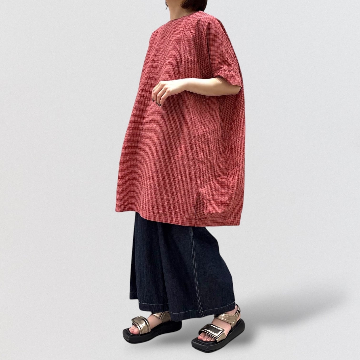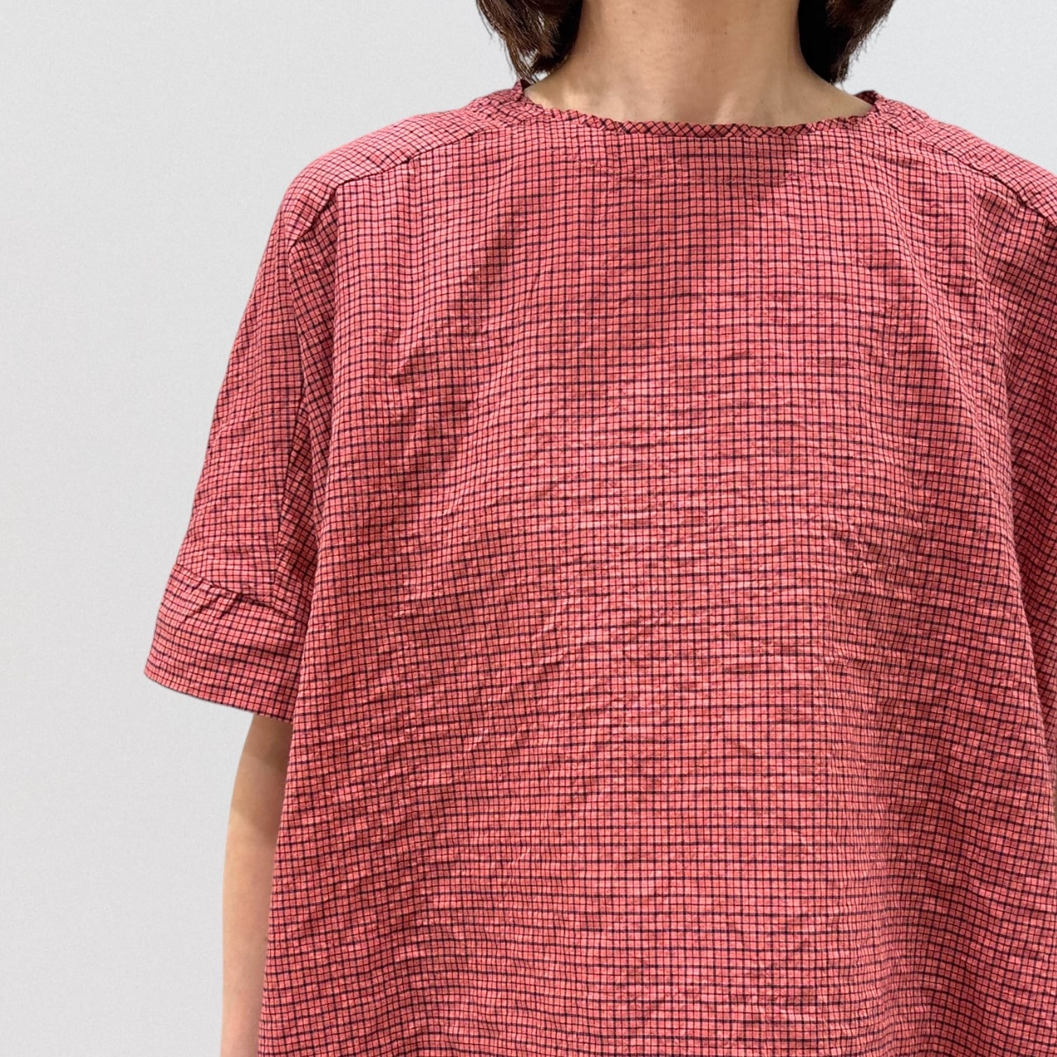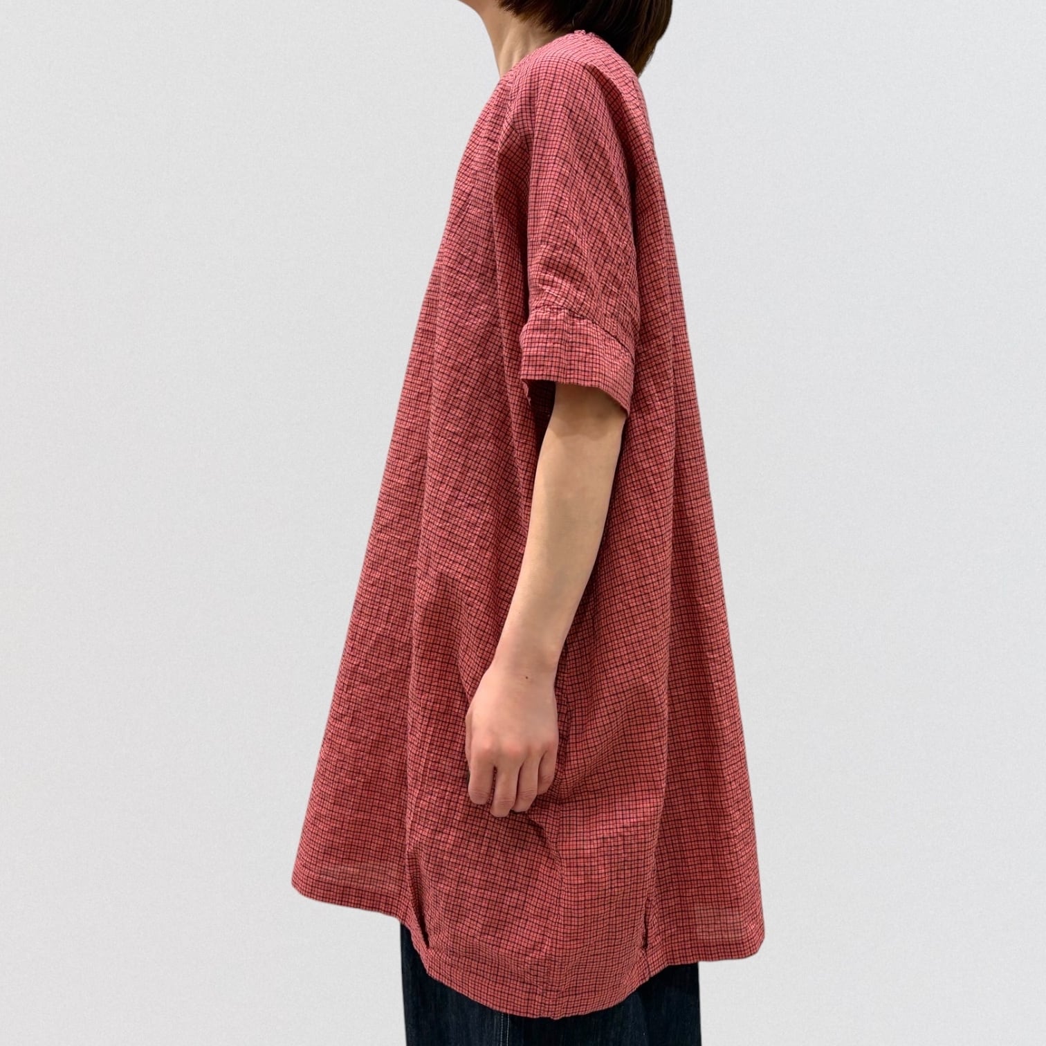 シャーリングチェックのワイドチュニックプルオーバー。