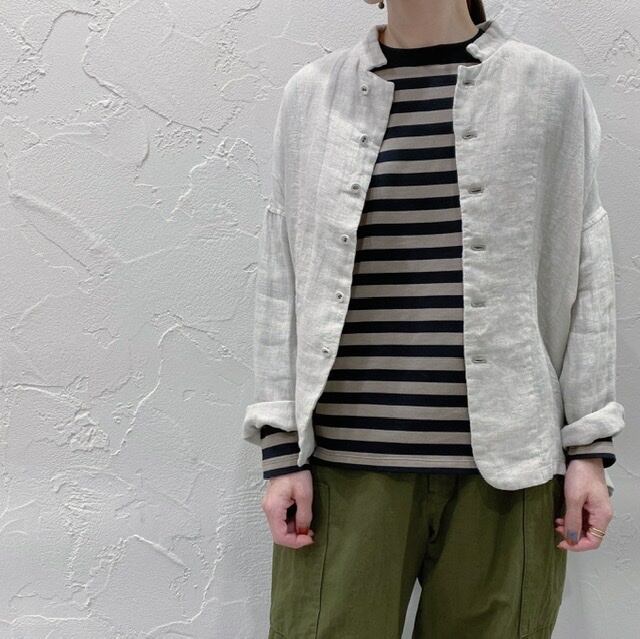 小さなテーラー風の衿に、クルミボタンが印象的なシャツジャケット。