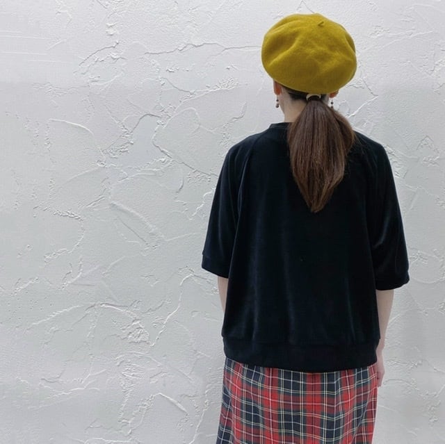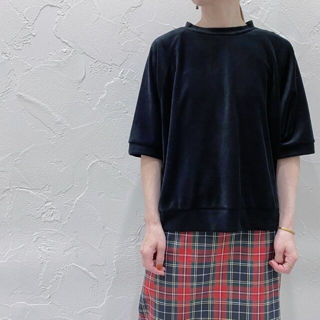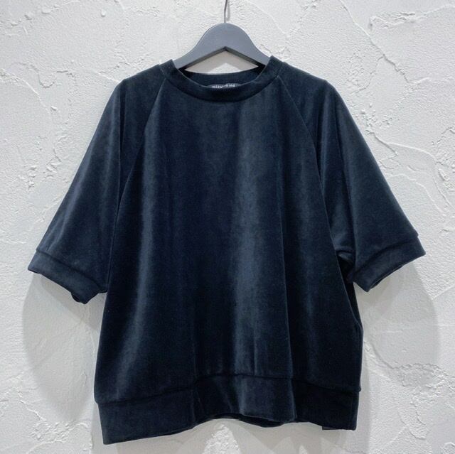 綿ストレッチベロアを使用したベロアラグランハーフスリーブプルオーバーです。