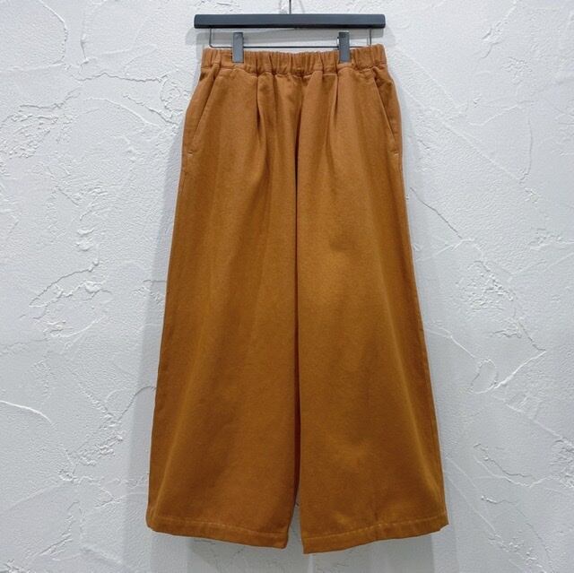 甘燃りを使用したルーズチノパンツです。 落ち感もある適度な肉厚素材で、履き心地良いです。 ウエストALLゴム、裏地なし。 両サイド、後ろ片側ポケットあり。 カラー オレンジブラウンのみ 素材 コットン100% サイズ size2のみ 着丈88cm ウエスト68~cm(総ゴム仕様) ヒップ110cm (モデル身長 160cm) 日本製