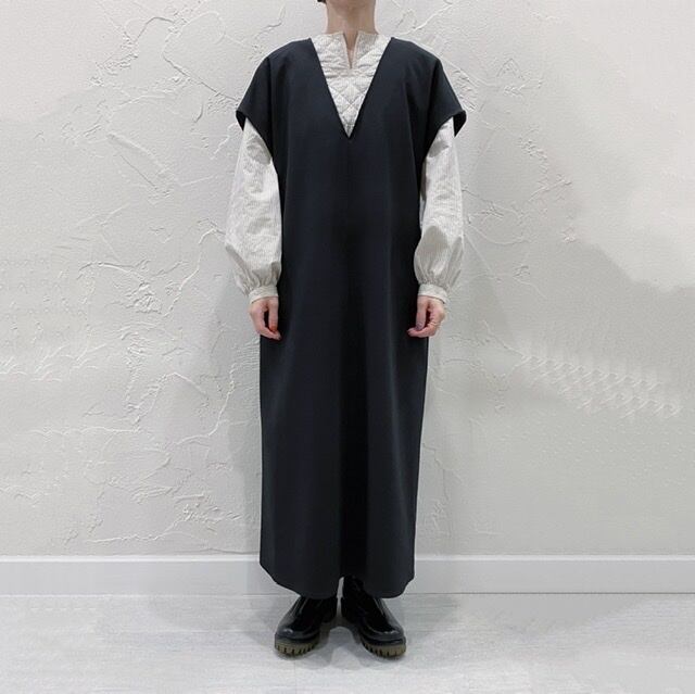 cafuneのVネックフレンチスリーブワンピースです。 深めのVネックで組合せの幅が広がります。 スレンチスリーブの細見え効果でスッキリ見えます。 シワになりにくいのもポイントです。 カラー ブラウン、ブラック 素材 ポリエステル97% ポリウレタン3% ポケット裏 コットン100% 洗濯可能 サイズ 着丈117cm バスト114cm (モデル身長 160cm) 日本製