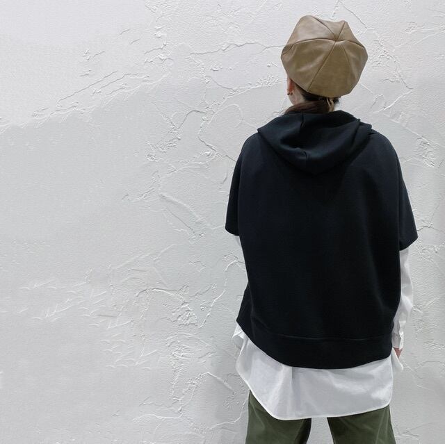 小さめのフードが付いたフレンチスリーブプルオーバーです。 インナーで重ね着を楽しめるフレンチスリーブです。 早い時期から着られるコットン素材です。 カラー グリーン、ブラック 素材 コットン100% 配色部分 コットン100% 洗濯可能 サイズ 着丈(前)70cm (後)77cm 身幅106cm (モデル身長 160cm) 中国製