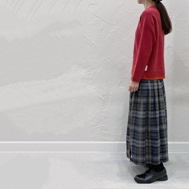 プリーツが施され、裾に向かってやや広がりのあるデザインで、ふんわりとした女性らしいシルエットに。端がフリンジしようになっているのも可愛いです。