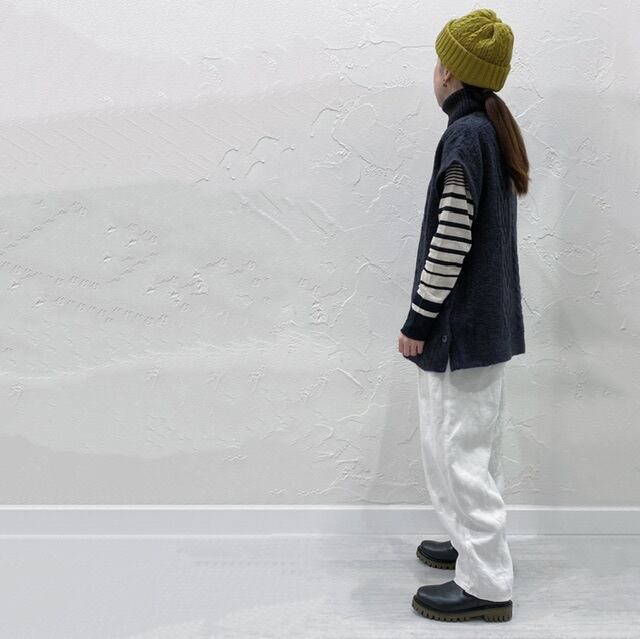 女性らしいゆるい衿ぐりで、裾に向かって太くなるボーダー柄がポイントになっています。