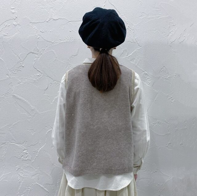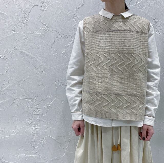 柄編みのニットベストです。 前身のみボーダー見えする柄編みで、後ろはスッキリ無地仕様。 組合せしやすいベーシックな形で、インナーを選びません。 スタッフお勧めのアイテムです。 カラー ベージュのみ 素材 毛80% ナイロン20% ドライクリーニング サイズ 着丈54cm 身幅108cm 肩幅36cm アームホール20cm (モデル身長 160cm) 日本製