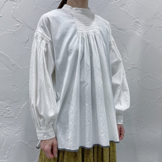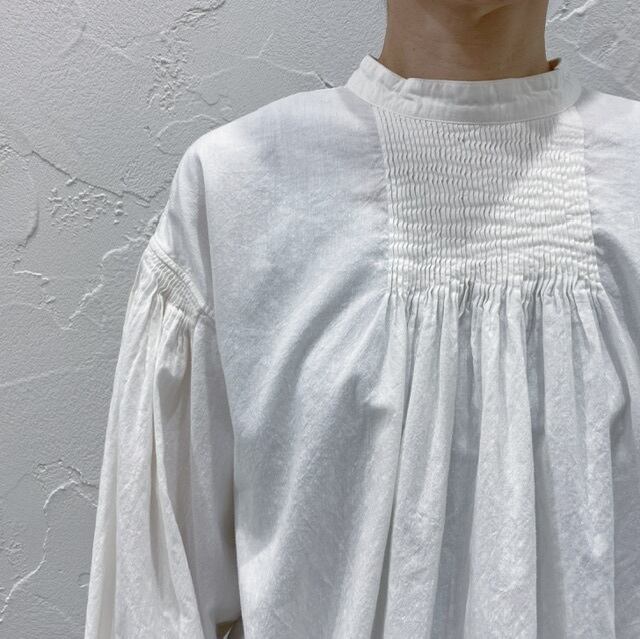 首元や後ろ見頃と袖付け部分、袖口に施されたピンタックがポイント。