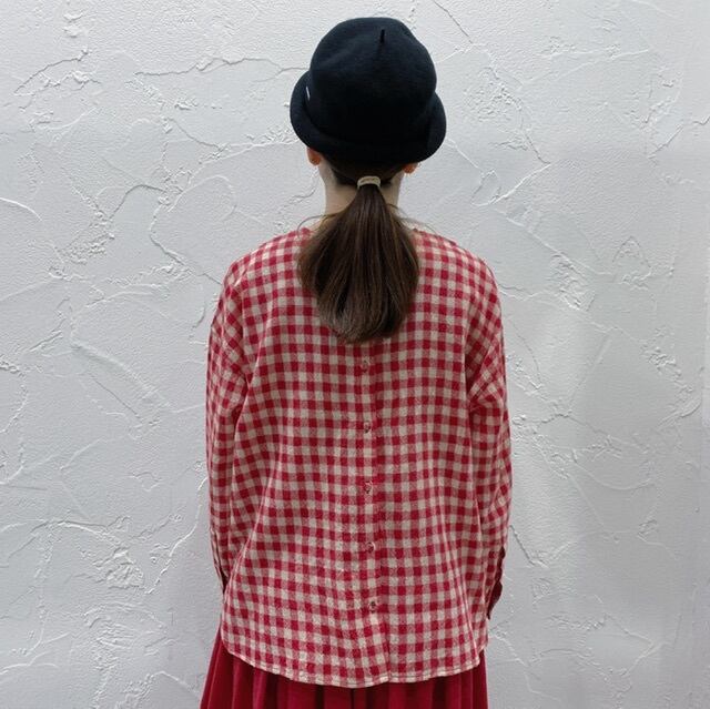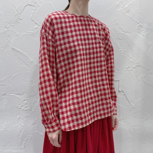 maison de soil の"BOILED WOOL MEDIUM GINGHAM CHECK"シリーズのクルーネックシャツ。