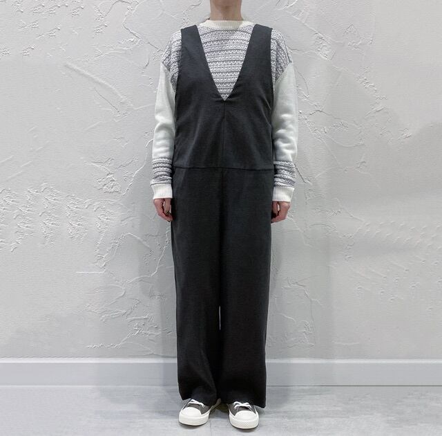 気軽にお洗濯ができ、軽くて保温性にも優れています。深めのVネックのオールインワンで、体のラインを気にせず着用でき合わせるアイテムによって雰囲気を楽しめる1枚となっています。