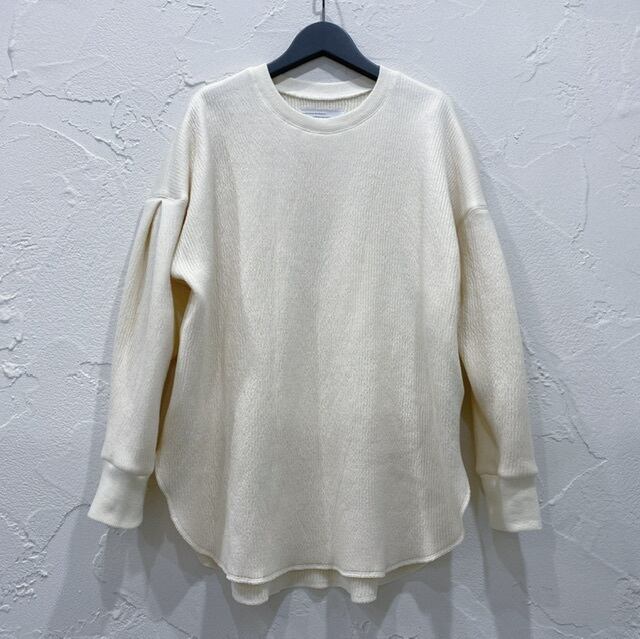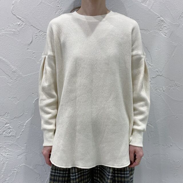 裏側がサラッと平編みニット風で、表側が膨れ織り、ニットのような雰囲気のカットプルオーバーです。
