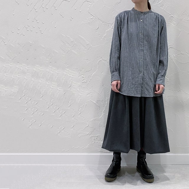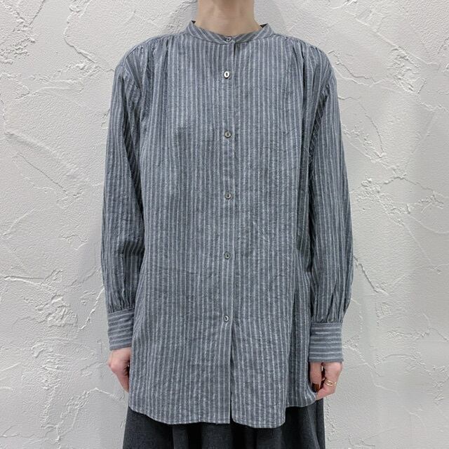 肩と背中にギャザーを細かく入れたデザインで、オーバー気味で素敵に着用できるバンドカラーシャツとなっています。