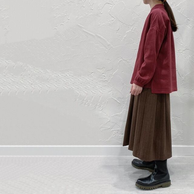 腰回りはボックスプリーツで細見えする様にし、裾に向かってはボリュームを持たせ広がっている為トップスをインするコーディネートもお勧めです。