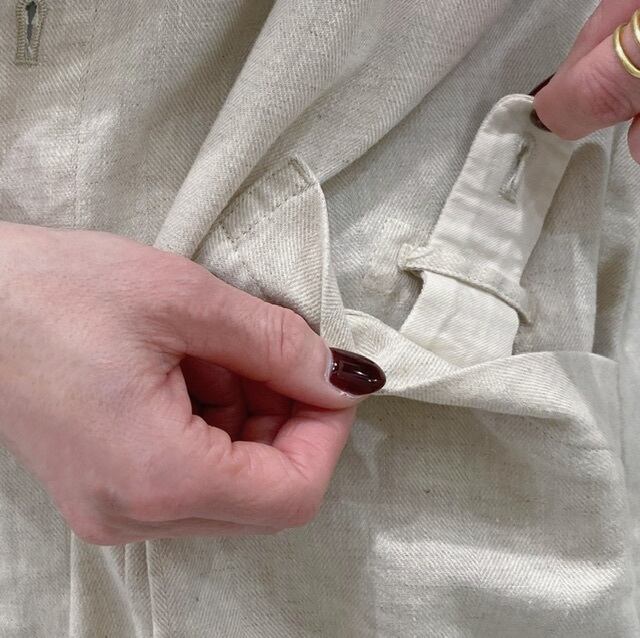 素材は縦横に綿麻の混紡糸を使い、麻のナチュラルな節感で生地の表面にムラ感を持たせ、ヘリンボン組織でクラシックな柄に織り上げた生地です。
