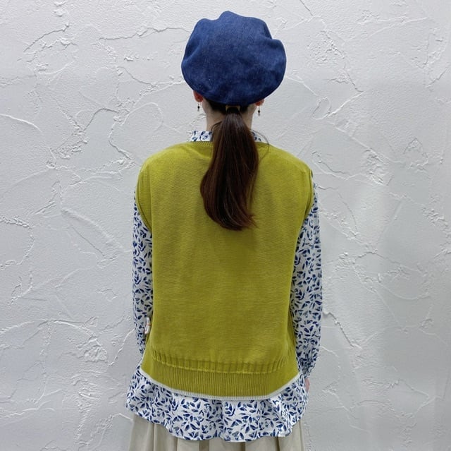 肩の編目のない、着た時の収まりが良いデザインのベストです。