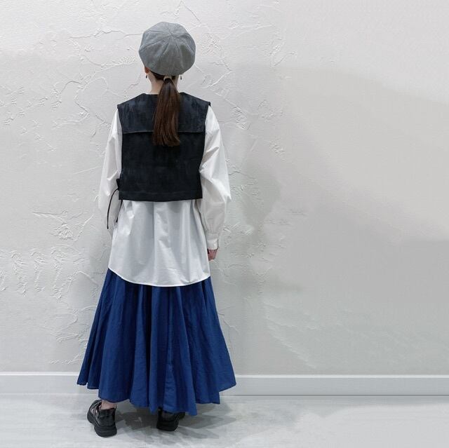 アームホールの設定はなく、ウエストサイドの紐で結ぶタイプなのでかま底の深いインナーアイテムにも合わせていただきやすい仕様です。