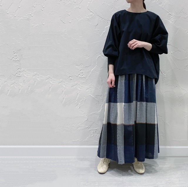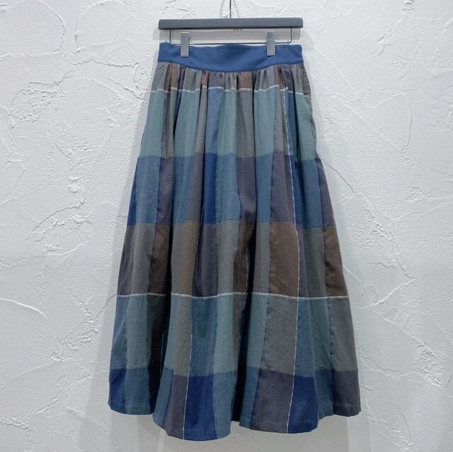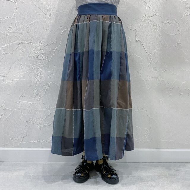 配色の太幅のウエストベルトがポイントの大柄チェック素材を使用したロングスカートです。