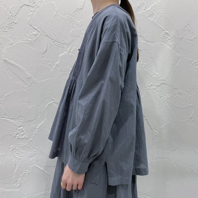 こちらは、前後にピンタックをあしらった前開き仕様のブラウス。