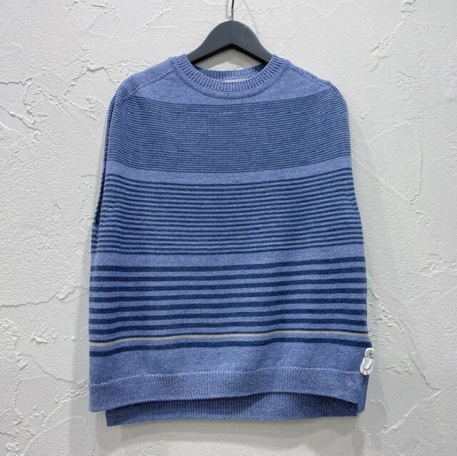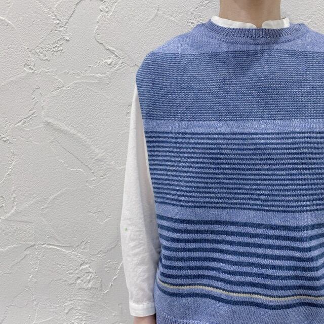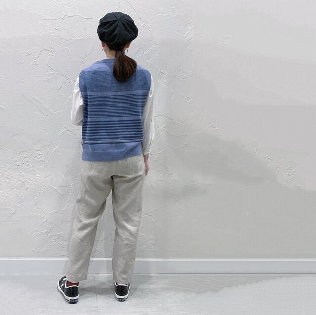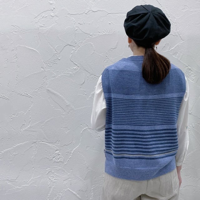 肩の編目のない、着た時の収まりが良いデザインのベストです。