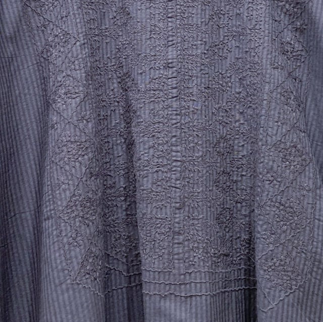 コンピューターミシンではなく、人の手で布を動かしながら、絵を描くように表現した繊細な刺繍は、職人さんの技術の高さと手仕事による温もりを感じさせる贅沢な一枚となっています。