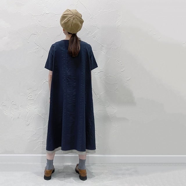 肩回りのすっきりとした形がきちんと感をだし、裾から見える配色で遊びを加えた、1枚で完結できるワンピースです。