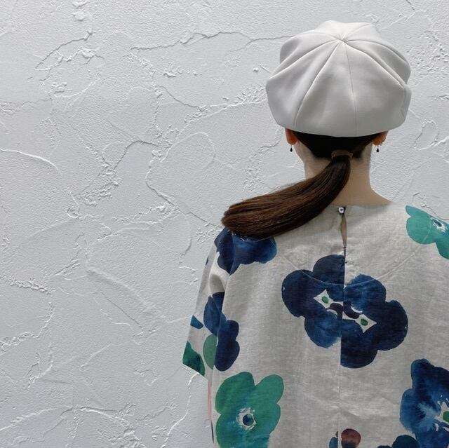 リネン生成り生地に水彩の柔らかなタッチの花柄プリントをしています。
